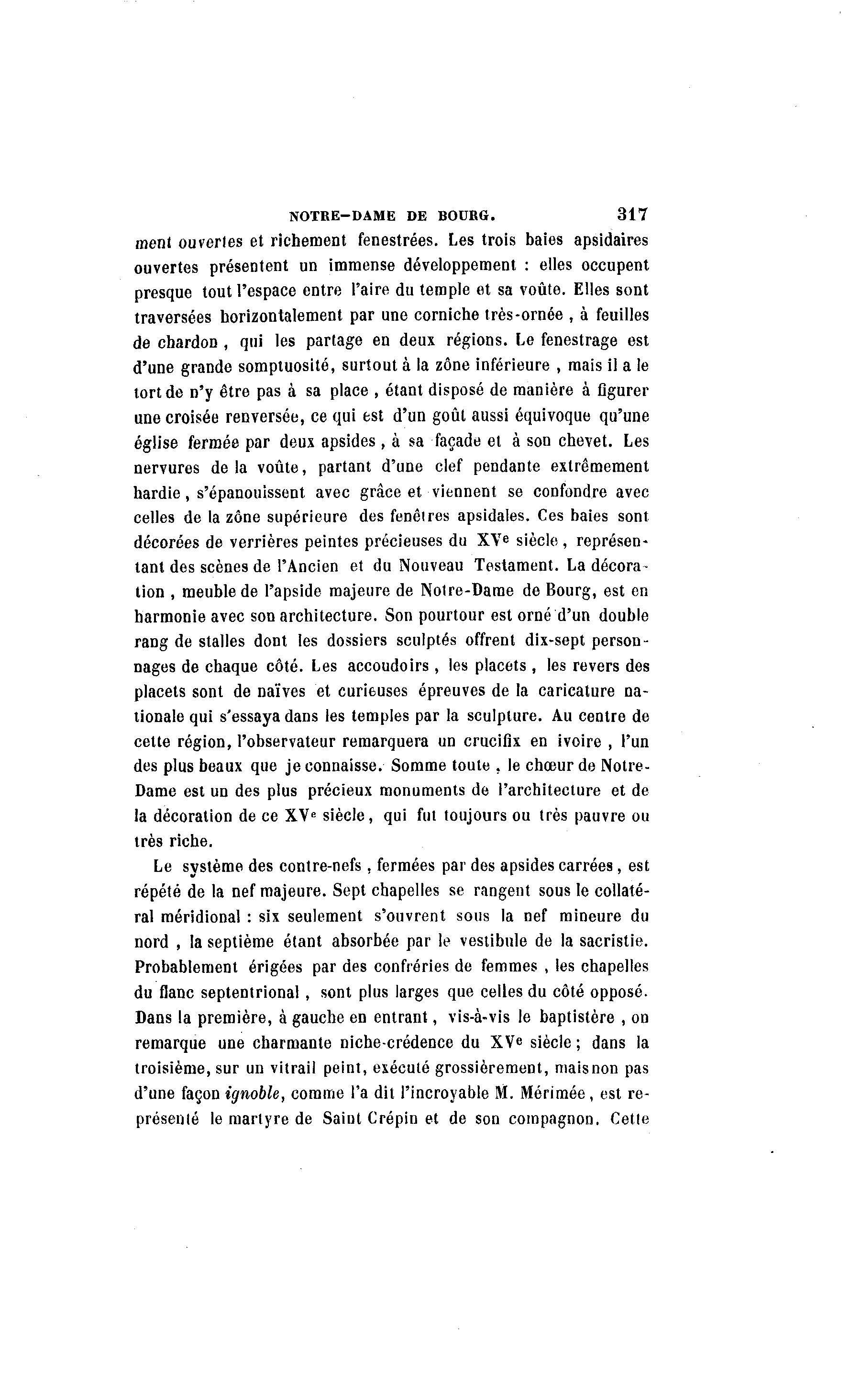 NOTRE-DAME DE BOURG. 317 ment ouvertes et richement fenestrées. Les trois baies apsidaires ouvertes présentent un immense développement : elles occupent presque tout l'espace entre l'aire du temple et sa voûte. Elles sont traversées horizontalement par une corniche très-ornée , à feuilles de chardon , qui les partage en deux régions. Le fenestrage est d'une grande somptuosité, surtout à la zone inférieure , mais il a le tort de n'y être pas à sa place , étant disposé de manière à figurer une croisée renversée, ce qui est d'un goût aussi équivoque qu'une église fermée par deux apsides, à sa façade et à son chevet. Les nervures delà voûte, partant d'une clef pendante extrêmement hardie, s'épanouissent avec grâce et viennent se confondre avec celles de la zone supérieure des fenêtres apsidales. Ces baies sont décorées de verrières peintes précieuses du XVe siècle , représen- tant des scènes de l'Ancien et du Nouveau Testament. La décora- tion , meuble de l'apside majeure de Notre-Dame de Bourg, est en harmonie avec son architecture. Son pourtour est orné d'un double rang de stalles dont les dossiers sculptés offrent dix-sept person- nages de chaque côté. Les accoudoirs, les placets, les revers des placets sont de naïves et curieuses épreuves de la caricature na- tionale qui s'essaya dans les temples par la sculpture. Au centre de cette région, l'observateur remarquera un crucifix en ivoire , l'un des plus beaux que je connaisse. Somme toute , le chœur de Notre- Dame est un des plus précieux monuments de l'architecture et de la décoration de ce XV8 siècle, qui fut toujours ou très pauvre ou très riche. Le système des contre-nefs, fermées par des apsides carrées , est répété de la nef majeure. Sept chapelles se rangent sous le collaté- ral méridional : six seulement s'ouvrent sous la nef mineure du nord , la septième étant absorbée par le vestibule de la sacristie. Probablement érigées par des confréries de femmes , les chapelles du flanc septentrional , sont plus larges que celles du côté opposé. Dans la première, à gauche en entrant, vis-à -vis le baptistère , on remarque une charmante niche-crédence du XVe siècle ; dans la troisième, sur un vitrail peint, exécuté grossièrement, maisnon pas d'une façon ignoble, comme l'a dit l'incroyable M. Mérimée, est re- présenté le martyre de Saint Crépin et de son compagnon. Cette