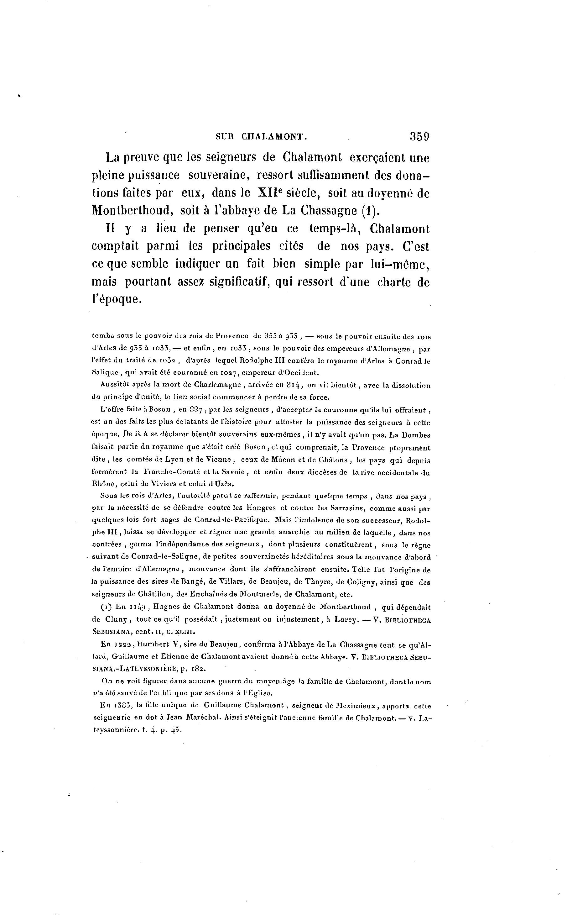 SUR CHALAMONT. 359 La preuve que les seigneurs de Ghalamont exerçaient une pleine puissance souveraine, ressort suffisamment des dona- tions faites par eux, dans le XIIe siècle, soit au doyenne de Montberthoud, soit à l'abbaye de La Chassagne (1). Il y a lieu de penser qu'en ce temps-là , Ghalamont comptait parmi les principales cités de nos pays. C'est ce que semble indiquer un fait bien simple par lui-même, mais pourtant assez significatif, qui ressort d'une charte de l'époque. tomba sous le pouvoir des rois de Provence de 855 à 933 , — sous le pouvoir ensuite des rois d'Arles de o,33 à i o 3 3 , — et enfin , en io33 , sous le pouvoir des empereurs d'Allemagne , par l'effet du traité de io3*2 , d'après lequel Rodolphe III conféra le royaume d'Arles a Conrad le Salique , qui avait été couronné en 1037, empereur d'Occident. Aussitôt après la mort de Charlemagne , arrivée en 8 r 4 , on vit bientôt, avec la dissolution du principe d'unité, le lien social commencer à perdre de sa force. L'offre faite à Boson , en 8O7 , par les seigneurs , d'accepter la couronne qu'ils lui offraient , est un des faits les plus éclatants de l'histoire pour attester la puissance des seigneurs à cette époque, De là à se déclarer bientôt souverains eux-mêmes , il n'y avait qu'un pas. La Dombes faisait partie du royaume que s'était créé B o s o n , e t q u î comprenait, la Provence proprement dite , les comtés de Lyon et de Vienne , ceux de Maçon et de Chatons , les pays qui depuis formèrent la Franche-Comté et la Savoie , et enfin deux diocèses do la rive occidentale du Rhône, celui de Viviers et celui d'Uzès. Sous les rois d'Arles, l'autorité parut se raffermir, pendant quelque temps , dans nos pays , par la nécessité de se défendre contre les Hongres et contre les Sarrasins, comme aussi par quelques lois fort sages de Conrad-le-Pacifîque, Mais l'indolence de son successeur, Rodol- phe I I I , laissa se développer et régner une grande anarchie au milieu de laquelle , dans nos contrées , germa l'indépendance des seigneurs, dont plusieurs constituèrent, sous le règne suivant de Conrad-le-Salîque, de petites souverainetés héréditaires sous la mouvance d'abord de l'empire d'Allemagne, mouvance dont ils s'affranchirent ensuite. Telle fut l'origine de la puissance des sires de Baugé, de Villars, de Beaujeu, de Thoyre, de Coligny, ainsi que des seigneurs de Châtillon, des Enchaînés de Montmerle, de Chalamont, etc. (1} En n 4 9 j Hugues de Chalamont donna au doyenné de Montberthoud , qui dépendait de Cluny , tout ce qu'il possédait , justement ou injustement, à L u r c y . — V , BIBLIOTHECA SEBUSIANA, cent. 11, c. X L I I I . En 1232, Humbert V, sire de Beaujeu, confirma à l'Abbaye de La Chassagne tout ce qu'Al- !ard, Guillaume et Etienne de Chalamont avaient donné à cette Abbaye. V. BIBLIOTHECA SEBU- SIANA.-LATEYSSONIÈIÎE, p. 182. On ne voit figurer dans aucune guerre du moyen-âge la famille de Ghalamont, dont le nom n'a été sauvé de l'oubli que par ses dons à l'Eglise. E n J 3 8 3 , la fille unique de Guillaume Chalamont , seigneur de Meximieux, apporta cette seigneurie, en dot à Jean Maréchal. Ainsi s'éteignit l'ancienne famille de Chalamont. —Y. ï.a- teyssonnicre. t. 4- !»• 4^-