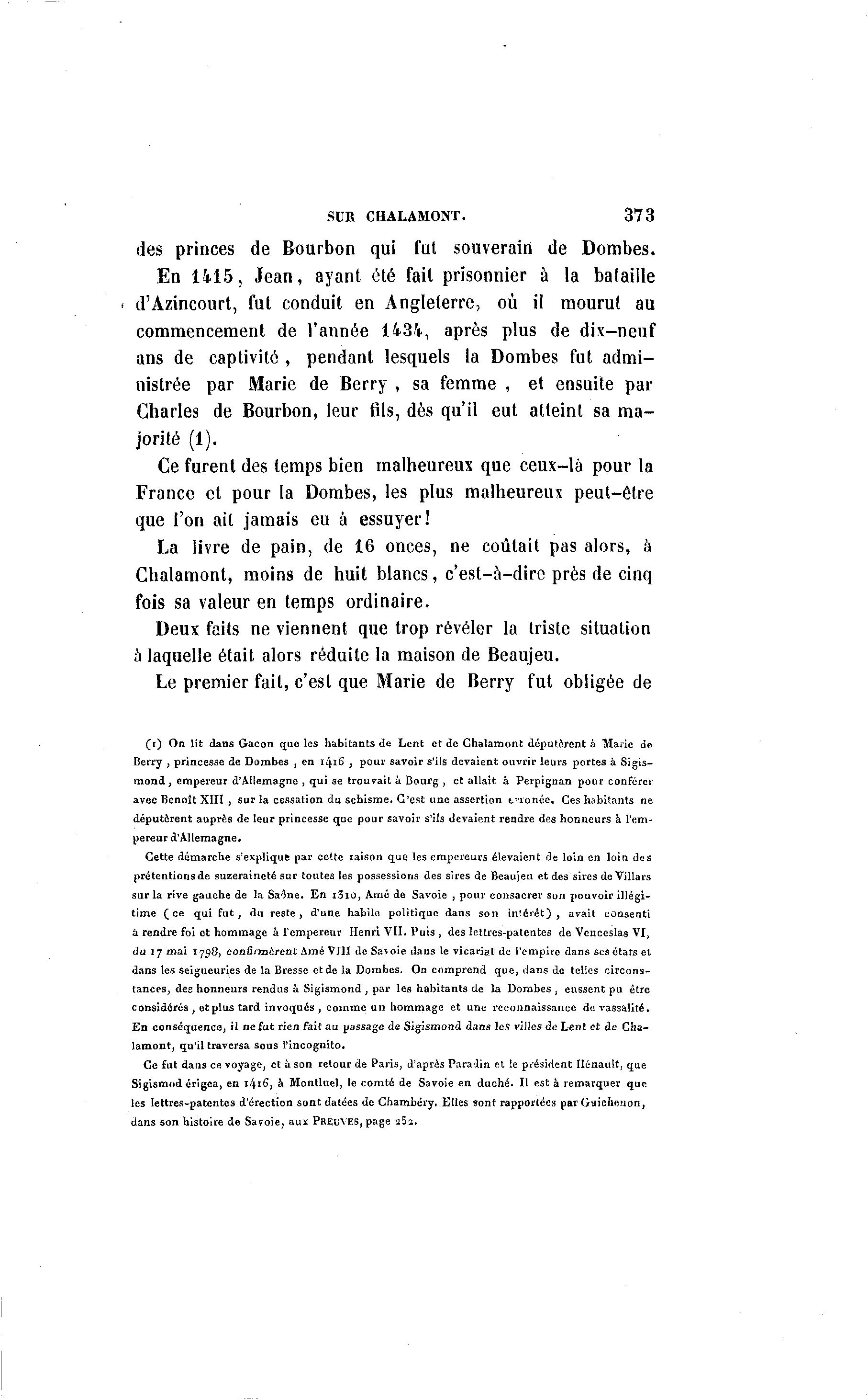 SUR CHALAMONT. 373 des princes de Bourbon qui fut souverain de Bombes. En 1415, Jean, ayant été fait prisonnier à la bataille d'Àzincourt, fut conduit en Angleterre, où il mourut au commencement de l'année 1434, après plus de dix-neuf ans de captivité , pendant lesquels la Bombes fut admi- nistrée par Marie de Berry , sa femme , et ensuite par Charles de Bourbon, leur fils, dès qu'il eut atteint sa ma- jorité (1). Ce furent des temps bien malheureux que ceux-là pour la France et pour la Bombes, les plus malheureux peut-être que l'on ait jamais eu à essuyer! La livre de pain, de 16 onces, ne coûtait pas alors, à Chalamont, moins de huit blancs, c'est-à -dire près de cinq fois sa valeur en temps ordinaire. Beux faits ne viennent que trop révéler la triste situation à laquelle était alors réduite la maison de Beaujeu. Le premier fait, c'est que Marie de Berry fut obligée de ( i ) On lit dans Gacon que les habitants de Lent et de Chalamont députèrent à Marie de Berry , princesse de Dombes , en 1416 , pour savoir s'ils devaient ouvrir leurs portes à Sigis- m o n d , empereur d'Allemagne , qui se trouvait à Bourg , et allait a Perpignan pour conférer avec Benoît XIII , sur la cessation du schisme. C'est une assertion t^ronée. Ces habitants ne députèrent auprès de leur princesse que pour savoir s'ils devaient rendre des honneurs à l'em- pereur d'Allemagne, Cette démarche s'explique par cette raison que les empereurs élevaient de loin en loin des prétentionsde suzeraineté sur toutes les possessions des sires de Beaujeu et des sires de Villars sur la rive gauche de la Sa4ne. E n I 3 I O , Amé de Savoie , pour consacrer son pouvoir illégi- time ( c e qui f u t , du reste, d'une habile politique dans son i n t é r ê t ) , avait consenti à rendre foi et hommage à l'empereur Henri VII. P u i s , des lettres-patentes de Veuceslas VI, du 17 mai 1798, confirmèrent Amé VJIà de Sa>oïe dans le vicariat de l'empire dans ses états et dans les seigueuries de la Bresse et de la Dombes. On comprend que, dans de telles circons- tances, des honneurs rendus à Sigismond , par les habitants de la Dombes , eussent pu être considérés , et plus tard invoqués , comme u n hommage et une reconnaissance de vassalité. En conséquence, il ne fut rien fait au passage de Sigismond dans les villes de Lent et de Cha- lamont, qu'il traversa sous l'incognito. Ce fut dans ce voyage, et à son retour de Paris, d'après Paradin et le président Hénauit, que Sigismodérigea, en i^i6} à Montluel, le comté de Savoie en duché. Il est à remarquer que les lettres-patentes d'érection sont datées de Chambéry, Elles sont rapportées par Gaichenon, dans son histoire de Savoie, aux PREUVES, page 25a.
