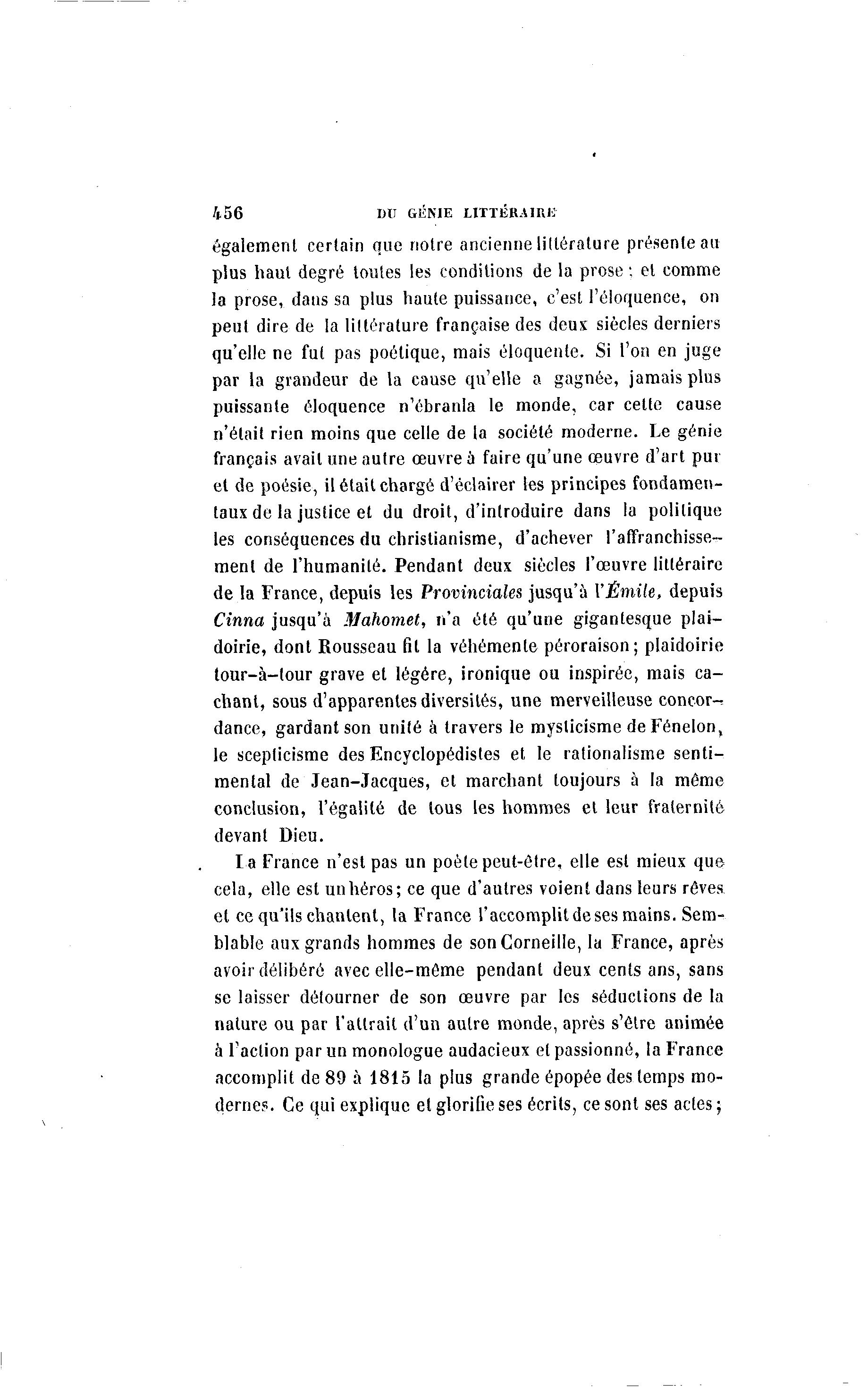 456 DU GÉNIE LITTÉRAIRE- également certain que noire ancienne littérature présente au plus haut degré toutes les conditions de la prose : el comme la prose, dans sa plus haute puissance, c'est l'éloquence, on peut dire de la littérature française des deux siècles derniers qu'elle ne fut pas poétique, mais éloquente. Si l'on en juge par la grandeur de la cause qu'elle a gagnée, jamais plus puissante éloquence n'ébranla le monde, car cette cause n'était rien moins que celle de la société moderne. Le génie français avait une autre œuvre à faire qu'une œuvre d'art pur et de poésie, il étail chargé d'éclairer les principes fondamen- taux de la justice et du droit, d'introduire dans la politique les conséquences du christianisme, d'achever l'affranchisse- ment de l'humanité. Pendant deux siècles l'œuvre littéraire de la France, depuis les Provinciales jusqu'à VEmile, depuis Cinna jusqu'à Mahomet, n'a été qu'une gigantesque plai- doirie, dont Rousseau fil la véhémente péroraison; plaidoirie tour-à -tour grave et légère, ironique ou inspirée, mais ca- chant, sous d'apparentes diversités, une merveilleuse concor-t dance, gardant son unité à travers le mysticisme de Fénelon, le scepticisme des Encyclopédistes et le rationalisme senti- mental de Jean-Jacques, et marchant toujours à la même conclusion, l'égalilé de lous les hommes et leur fraternité devant Dieu. l a France n'est pas un poète peut-être, elle est mieux que cela, elle est un héros; ce que d'autres voient dans leurs rêves et ce qu'ils chantent, la France l'accomplit de ses mains. Sem- blable aux grands hommes de son Corneille, la France, après avoir délibéré avec elle-même pendant deux cents ans, sans se laisser détourner de son œuvre par les séductions de la nature ou par l'allrait d'un autre monde, après s'être animée à l'action par un monologue audacieux et passionné, la France accomplit de 89 à 1815 la plus grande épopée des temps mo- dernes. Ce qui explique el glorifie ses écrits, ce sont ses actes ;