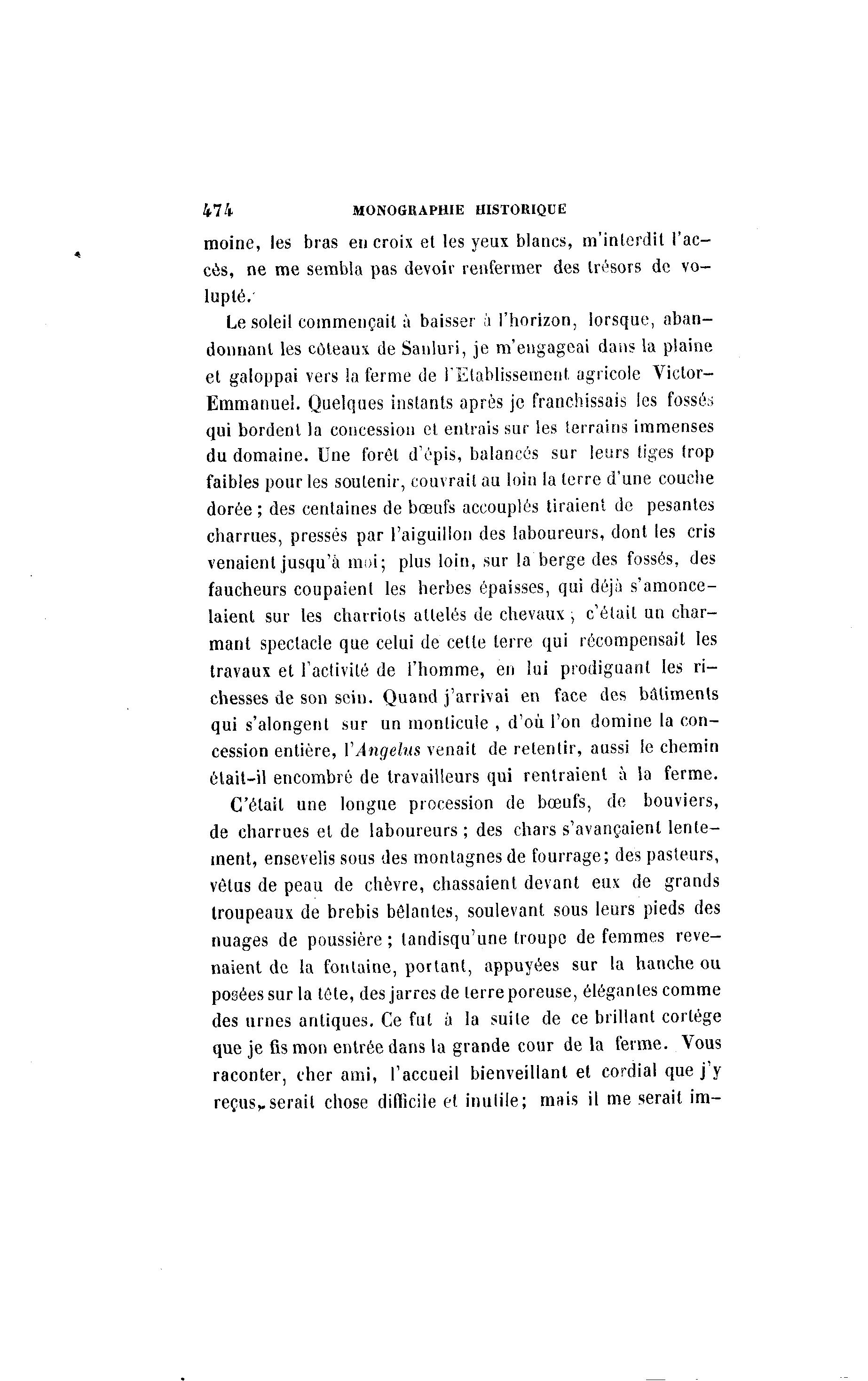 474 MONOGRAPHIE HISTORIQUE moine, les bras en croix et les yeux blancs, m'interdit l'ac- cès, ne me sembla pas devoir renfermer des trésors de vo- lupté. Le soleil commençait à baisser h l'horizon, lorsque, aban- donnant les coteaux de Sanluri, je m'engageai dans la plaine et galoppai vers la ferme de l'Etablissement agricole Victor- Emmanuel. Quelques instants après je franchissais les fossés qui bordent la concession et entrais sur les terrains immenses du domaine. Une forôt d'épis, balancés sur leurs tiges trop faibles pour les soutenir, couvrait au loin la terre d'une couche dorée ; des centaines de bœufs accouplés tiraient de pesantes charrues, pressés par l'aiguillon des laboureurs, dont les cris venaient jusqu'à moi; plus loin, sur la berge des fossés, des faucheurs coupaient les herbes épaisses, qui déjà s'amonce- laient sur les charriots attelés de chevaux , c'était un char- mant spectacle que celui de celte terre qui récompensait les travaux et l'activité de l'homme, en lui prodiguant les r i - chesses de son sein. Quand j'arrivai en face des bâtiments qui s'alongent sur un monticule , d'où l'on domine la con- cession entière, VAngélus venait de retentir, aussi le chemin élait-il encombré de travailleurs qui rentraient à la ferme. C'était une longue procession de bœufs, de bouviers, de charrues et de laboureurs ; des chars s'avançaient lente- ment, ensevelis sous des montagnes de fourrage; des pasteurs, vêtus de peau de chèvre, chassaient devant eus de grands troupeaux de brebis bêlantes, soulevant sous leurs pieds des nuages de poussière ; landisqu'une troupe de femmes reve- naient de la fonlaine, portant, appuyées sur la hanche ou posées sur la télé, des jarres de terre poreuse, élégantes comme des urnes antiques. Ce fut à la suite de ce brillant cortège que je fis mon entrée dans la grande cour de la ferme. Vous raconter, cher ami, l'accueil bienveillant et cordial que j'y reçus,, serait chose difficile et inutile ; mais il me serait im-