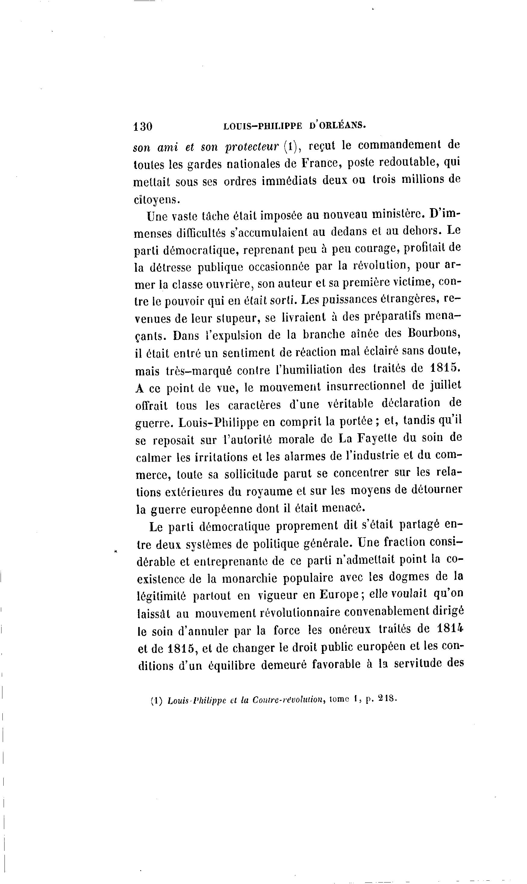 130 LOmS-PHIIJPPE D'ORLÉANS. son ami et son protecteur (l), reçut le commandement de toutes les gardes nationales de France, poste redoutable, qui mettait sous ses ordres immédiats deux ou trois millions de citoyens. Une vaste tâche était imposée au nouveau ministère. D'im- menses difficultés s'accumulaient au dedans et au dehors. Le parti démocratique, reprenant peu à peu courage, profilait de la détresse publique occasionnée par la révolution, pour ar- mer la classe ouvrière, son auteur et sa première victime, con- tre le pouvoir qui en était sorti. Les puissances étrangères, re- venues de leur stupeur, se livraient à des préparatifs mena- çants. Dans l'expulsion de la branche aînée des Bourbons, il était entré un sentiment de réaction mal éclairé sans doute, mais très-marqué contre l'humiliation des traités de 1815. A ce point de vue, le mouvement insurrectionnel de juillet offrait tous les caractères d'une véritable déclaration de guerre. Louis-Philippe en comprit la portée; et, tandis qu'il se reposait sur l'autorité morale de La Fayette du soin de calmer les irritations et les alarmes de l'industrie et du com- merce, toute sa sollicitude parut se concentrer sur les rela- tions extérieures du royaume et sur les moyens de détourner la guerre européenne dont il était menacé. Le parti démocratique proprement dit s'était partagé en- tre deux systèmes de politique générale. Une fraclion consi- dérable et entreprenante de ce parti n'admettait point la co- existence de la monarchie populaire avec les dogmes de la légitimité partout en vigueur en Europe; elle voulait qu'on laissât au mouvement révolutionnaire convenablement dirigé le soin d'annuler par la force les onéreux traités de 1814 et de 1815, et de changer le droit public européen et les con- ditions d'un équilibre demeuré favorable à la servitude des (1) Louis-Philippe et la Contre-rt'vohttion, lome 1, p. 218.