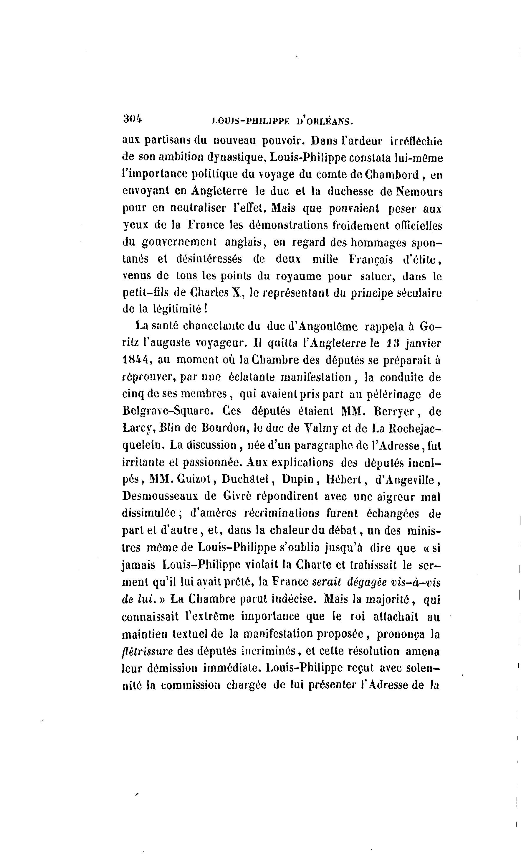 304 LOUIS-I'HILIPPE D'ORLÉANS. aux partisans du nouveau pouvoir. Dans l'ardeur irréfléchie de son ambition dynastique. Louis-Philippe constata lui-môme l'importance politique du voyage du comte deChambord , en envoyant en Angleterre le duc et la duchesse de Nemours pour en neutraliser l'effet. Mais que pouvaient peser aux yeux de la France les démonstrations froidement officielles du gouvernement anglais, en regard des hommages spon- tanés et désintéressés de deux mille Fiançais d'élite, venus de tous les points du royaume pour saluer, dans le petit-fils de Charles X, le représentant du principe séculaire de la légitimité ! La santé chancelante du duc d'Angoulême rappela à Go- ritz l'auguste voyageur. Il quitta l'Angleterre le 13 janvier 1844, au moment où la Chambre des députés se préparait à réprouver, par une éclatante manifestation , la conduite de cinq de ses membres , qui avaient pris part au pèlerinage de Belgravc-Square. Ces députés étaient MM. Berryer, de Larcy, Blin de Bourdon, le duc de Valmy et de La Rochejac- quelein. La discussion , née d'un paragraphe de l'Adresse, fut irritante et passionnée. Aux explications des députés incul- pés, MM. Guizot, Duchâlel, Dupin , Hébert, d'Angeville , Desmousseaux de Givré répondirent avec une aigreur mal dissimulée ; d'amères récriminations furent échangées de part et d'autre, et, dans la chaleur du débat, un des minis- tres même de Louis-Philippe s'oublia jusqu'à dire que « si jamais Louis-Philippe violait la Charte et trahissait le ser- ment qu'il lui avait prêté, la France serait dégagée vis-à -vis de lui. » La Chambre parut indécise. Mais la majorité, qui connaissait l'extrême importance que le roi attachait au maintien textuel de la manifestation proposée, prononça la flétrissure des députés incriminés, et cette résolution amena leur démission immédiate. Louis-Philippe reçut avec solen- nité la commission chargée de lui présenter l'Adresse de la