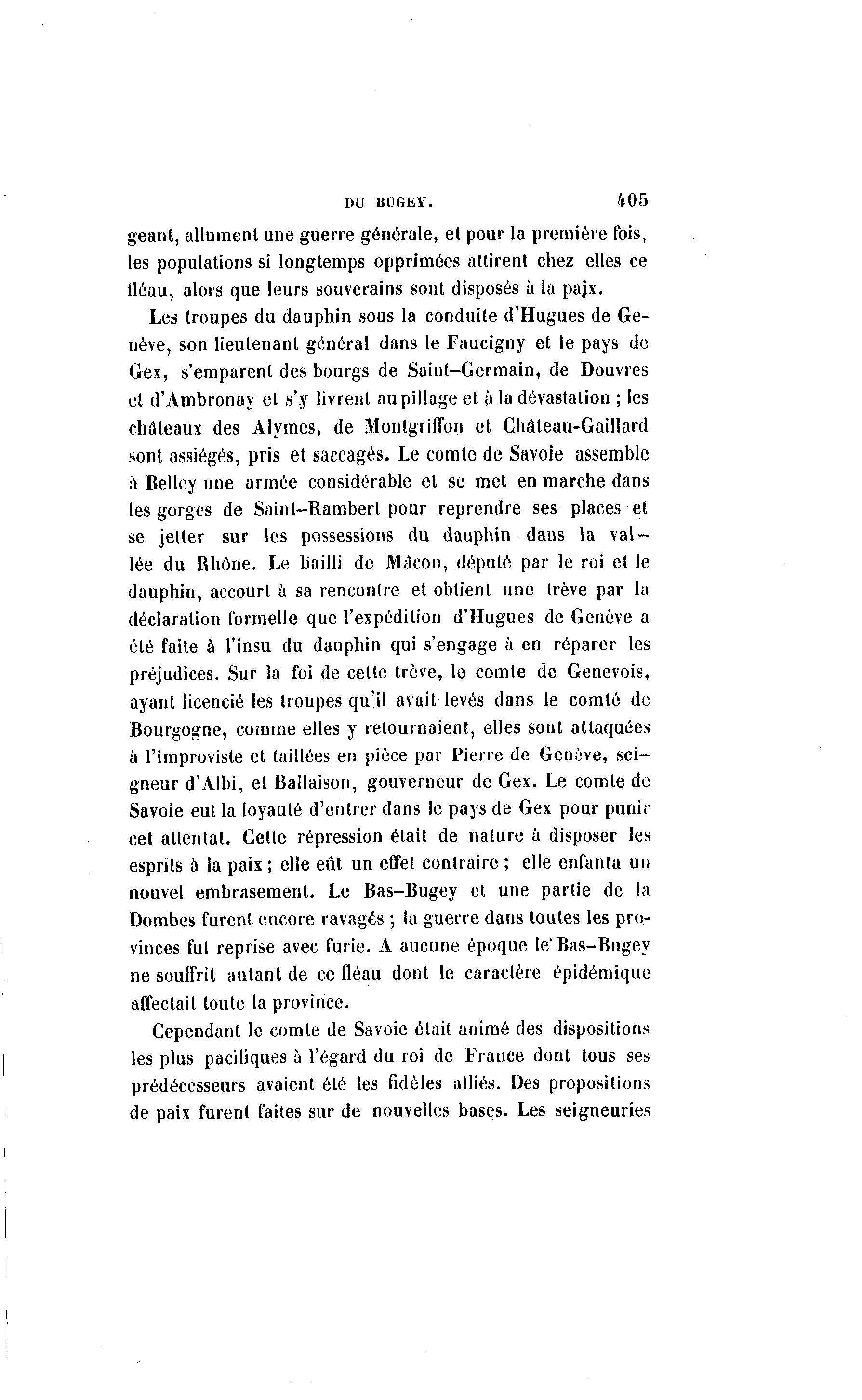 DU BUGEY. 405 géant, allument une guerre générale, et pour la première fois, les populations si longtemps opprimées attirent chez elles ce fléau, alors que leurs souverains sont disposés à la pajx. Les troupes du dauphin sous la conduite d'Hugues de Ge- nève, son lieutenant général dans le Faucigny et le pays de Gex, s'emparent des bourgs de Saint-Germain, de Douvres et d'Ambronay et s'y livrent au pillage et à la dévastation ; les châteaux des Alymes, de Montgriflbn et Château-Gaillard sont assiégés, pris et saccagés. Le comte de Savoie assemble à Belley une armée considérable et se met en marche dans les gorges de Saint-Rambert pour reprendre ses places et se jelter sur les possessions du dauphin dans la val- lée du Rhône. Le bailli de Mâcon, député par le roi et le dauphin, accourt à sa rencontre et oblient une (rêve par la déclaration formelle que l'expédition d'Hugues de Genève a été faite à l'insu du dauphin qui s'engage à en réparer les préjudices. Sur la foi de celte trêve, le comte de Genevois, ayant licencié les troupes qu'il avait levés dans le comté de Bourgogne, comme elles y retournaient, elles sont attaquées à l'improviste et (aillées en pièce par Pierre de Genève, sei- gneur d'Albi, et Ballaison, gouverneur de Gex. Le comte de Savoie eut la loyauté d'entrer dans le pays de Gex pour punir cet attentat. Celle répression était de nature à disposer les esprits à la paix; elle eût un effet contraire ; elle enfanta un nouvel embrasement. Le Bas-Bugey et une partie de la Dombes furent encore ravagés ; la guerre dans toutes les pro- vinces fui reprise avec furie. A aucune époque le'Bas-Bugey ne souffrit autant de ce fléau dont le caractère épidémique affectait toute la province. Cependant le comte de Savoie étail animé des dispositions les plus pacifiques à l'égard du roi de France dont tous ses prédécesseurs avaient été les fidèles alliés. Des propositions de paix furent faites sur de nouvelles bases. Les seigneuries