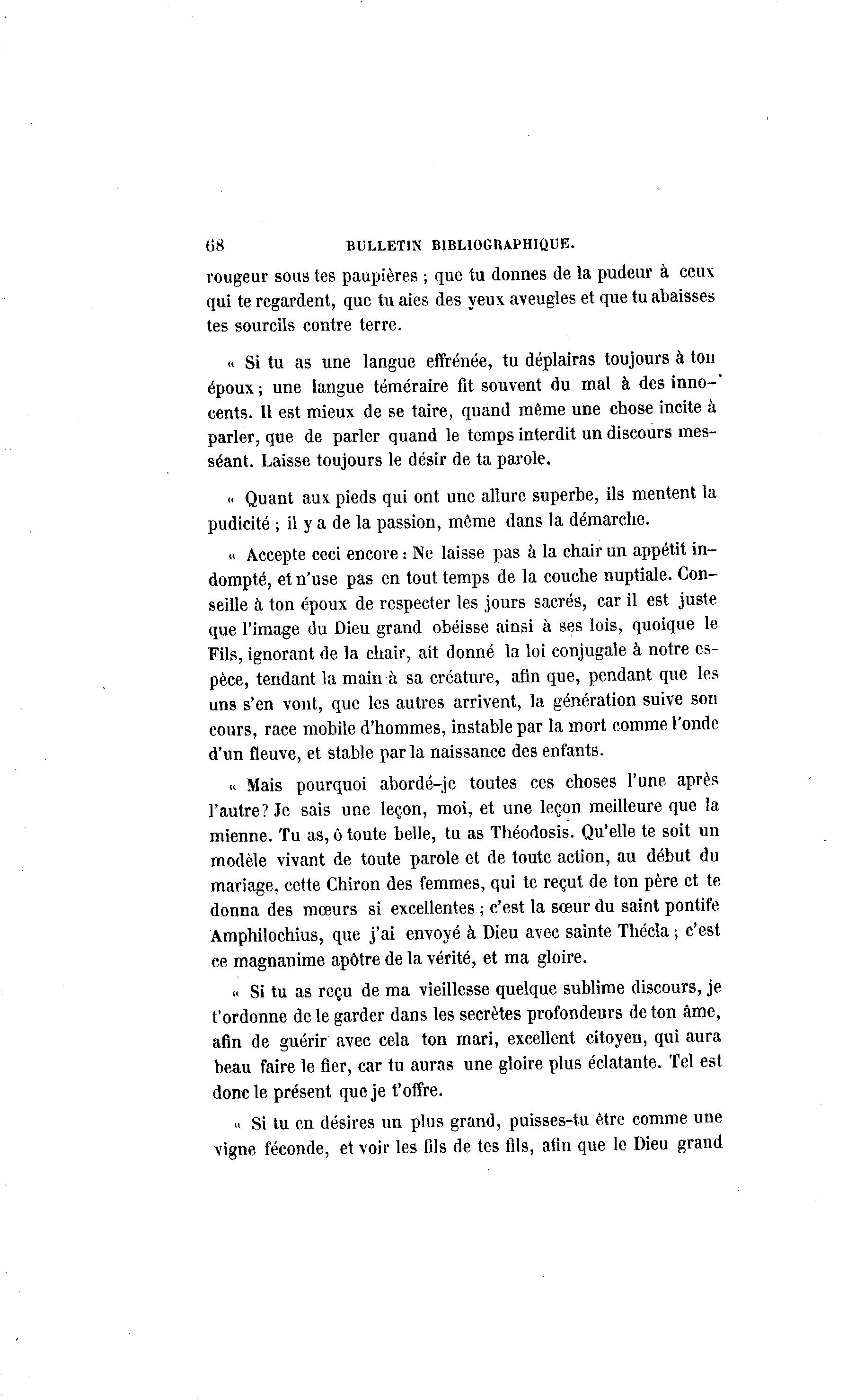 68 BULLETIN BIBLIOGRAPHIQUE. rougeur sous tes paupières ; que tu donnes de la pudeur à ceux qui te regardent, que tu aies des yeux aveugles et que tu abaisses tes sourcils contre terre. « Si tu as une langue effrénée, tu déplairas toujours à ton époux ; une langue téméraire fit souvent du mal à des inno-' cents. 11 est mieux de se taire, quand même une chose incite à parler, que de parler quand le temps interdit un discours mes- séant. Laisse toujours le désir de ta parole. « Quant aux pieds qui ont une allure superbe, ils mentent la pudicité ; il y a de la passion, même dans la démarche. « Accepte ceci encore : Ne laisse pas à la chair un appétit in- dompté, et n'use pas en tout temps de la couche nuptiale. Con- seille à ton époux de respecter les jours sacrés, car il est juste que l'image du Dieu grand obéisse ainsi à ses lois, quoique le Fils, ignorant de la chair, ait donné la loi conjugale à notre es- pèce, tendant la main à sa créature, afin que, pendant que les uns s'en vont, que les autres arrivent, la génération suive son cours, race mobile d'hommes, instable par la mort comme l'onde d'un fleuve, et stable parla naissance des enfants. « Mais pourquoi abordé-je toutes ces choses l'une après l'autre? Je sais une leçon, moi, et une leçon meilleure que la mienne. Tu as, ô toute belle, tu as Théodosis. Qu'elle te soit un modèle vivant de toute parole et de toute action, au début du mariage, cette Chiron des femmes, qui te reçut de ton père et te donna des mœurs si excellentes ; c'est la sœur du saint pontife Amphilochius, que j'ai envoyé à Dieu avec sainte Thécla ; c'est ce magnanime apôtre de la vérité, et ma gloire. « Si tu as reçu de ma vieillesse quelque sublime discours, je t'ordonne de le garder dans les secrètes profondeurs de ton âme, afin de guérir avec cela ton mari, excellent citoyen, qui aura beau faire le fier, car tu auras une gloire plus éclatante. Tel est donc le présent que je t'offre. • Si tu en désires un plus grand, puisses-tu être comme une < vigne féconde, et voir les fils de tes fils, afin que le Dieu grand