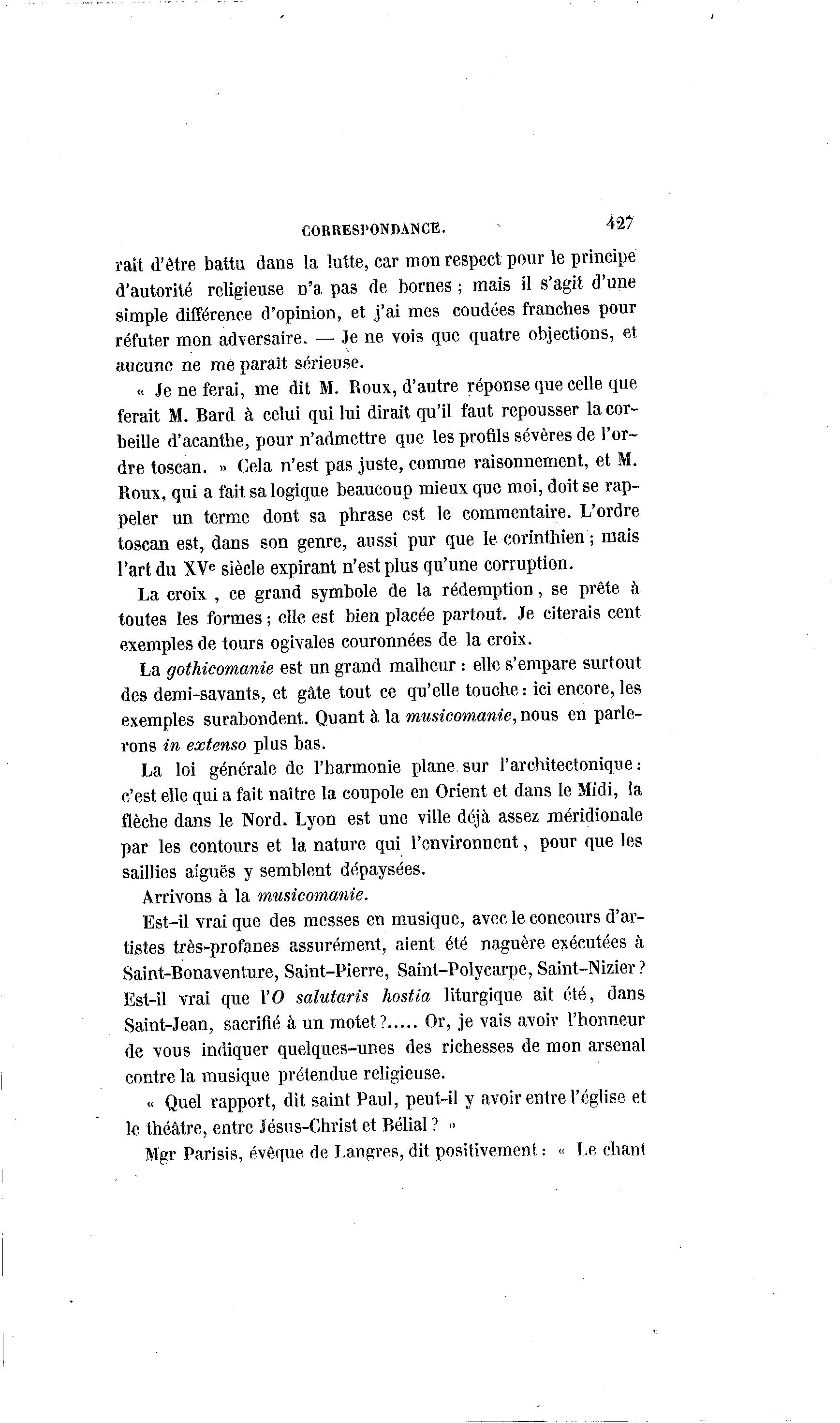 CORRESPONDANCE. 427 rait d'être battu dans la lutte, car mon respect pour le principe d'autorité religieuse n'a pas de bornes ; mais il s'agit d'une simple différence d'opinion, et j'ai mes coudées franches pour réfuter mon adversaire. — Je ne vois que quatre objections, et aucune ne me paraît sérieuse. « Je ne ferai, me dit M. Roux, d'autre réponse que celle que ferait M. Bard à celui qui lui dirait qu'il faut repousser la cor- beille d'acanthe, pour n'admettre que les profils sévères de l'or- dre toscan. » Cela n'est pas juste, comme raisonnement, et M. Roux, qui a fait sa logique beaucoup mieux que moi, doit se rap- peler un terme dont sa phrase est le commentaire. L'ordre toscan est, dans son genre, aussi pur que le corinthien ; mais l'art du XVe siècle expirant n'est plus qu'une corruption. La croix , ce grand symbole de la rédemption, se prête à toutes les formes ; elle est bien placée partout. Je citerais cent exemples de tours ogivales couronnées de la croix. La gothicomanie est un grand malheur : elle s'empare surtout des demi-savants, et gâte tout ce qu'elle touche : ici encore, les exemples surabondent. Quant à la musicomanie, nous en parle- rons in extenso plus bas. La loi générale de l'harmonie plane sur Parchitectonique : c'est elle qui a fait naître la coupole en Orient et dans le Midi, la flèche dans le Nord. Lyon est une ville déjà assez méridionale par les contours et la nature qui l'environnent, pour que les saillies aiguës y semblent dépaysées. Arrivons à la musicomanie. Est-il vrai que des messes en musique, avec le concours d'ar- tistes très-profanes assurément, aient été naguère exécutées à Saint-Bonaventure, Saint-Pierre, Saint-Polycarpe, Saint-Nizier ? Est-il vrai que \'0 salutaris hostia liturgique ait été, dans Saint-Jean, sacrifié à un motet? Or, je vais avoir l'honneur de vous indiquer quelques-unes des richesses de mon arsenal contre la musique prétendue religieuse. « Quel rapport, dit saint Paul, peut-il y avoir entre l'église et le théâtre, entre Jésus-Christ et Bélial ? » Mgr Parisis, évêque de Langres, dit positivement : « Le chant