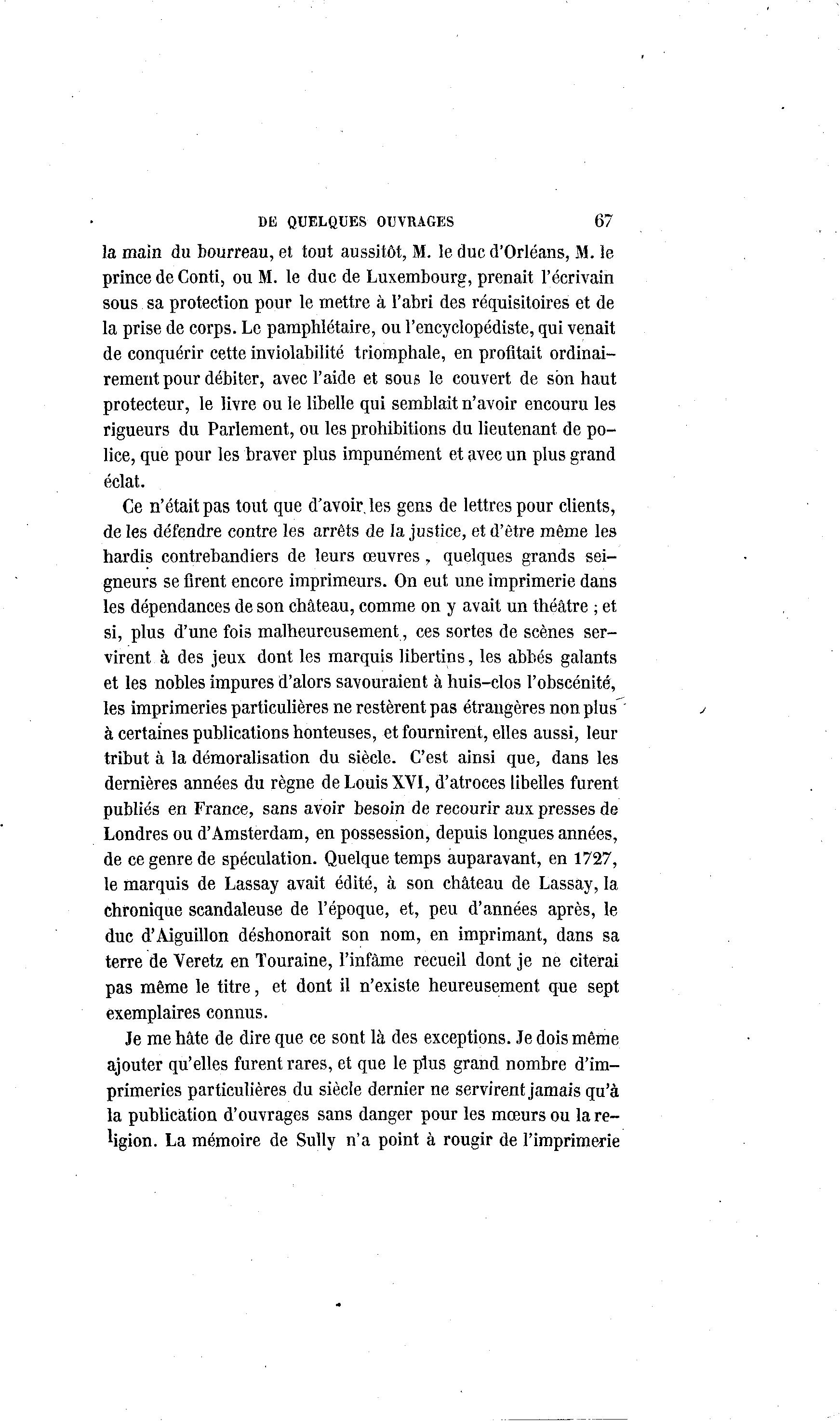 DE QUELQUES OUVRAGES 67 la main du bourreau, et tout aussitôt, M. le duc d'Orléans, M. le prince de Conti, ou M. le duc de Luxembourg, prenait l'écrivain sous sa protection pour le mettre à l'abri des réquisitoires et de la prise de corps. Le pamphlétaire, ou l'encyclopédiste, qui venait de conquérir cette inviolabilité triomphale, en profitait ordinai- rement pour débiter, avec l'aide et sous le couvert de son haut protecteur, le livre ou le libelle qui semblait n'avoir encouru les rigueurs du Parlement, ou les prohibitions du lieutenant de po- lice, que pour les braver plus impunément et avec un plus grand éclat. Ce n'était pas tout que d'avoir, les gens de lettres pour clients, de les défendre contre les arrêts de la justice, et d'être même les hardis contrebandiers de leurs œuvres, quelques grands sei- gneurs se firent encore imprimeurs. On eut une imprimerie dans les dépendances de son château, comme on y avait un théâtre ; et si, plus d'une fois malheureusement, ces sortes de scènes ser- virent à des jeux dont les marquis libertins, les abbés galants et les nobles impures d'alors savouraient à huis-clos l'obscénité, les imprimeries particulières ne restèrent pas étrangères non plus' à certaines publications honteuses, et fournirent, elles aussi, leur tribut à la démoralisation du siècle. C'est ainsi que, dans les dernières années du règne de Louis XVI, d'atroces libelles furent publiés en France, sans avoir besoin de recourir aux presses de Londres ou d'Amsterdam, en possession, depuis longues années, de ce genre de spéculation. Quelque temps auparavant, en 1727, le marquis de Lassay avait édité, à son château de Lassay, la chronique scandaleuse de l'époque, et, peu d'années après, le duc d'Aiguillon déshonorait son nom, en imprimant, dans sa terre de Veretz en Touraine, l'infâme recueil dont je ne citerai pas même le titre, et dont il n'existe heureusement que sept exemplaires connus. Je me hâte de dire que ce sont là des exceptions. Je dois même ajouter qu'elles furent rares, et que le plus grand nombre d'im- primeries particulières du siècle dernier ne servirent jamais qu'à la publication d'ouvrages sans danger pour les mœurs ou la re- ligion. La mémoire de Sully n'a point à rougir de l'imprimerie