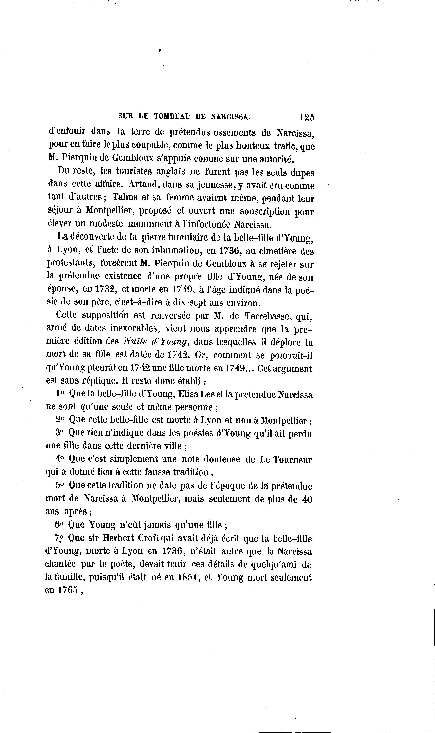 SUR LE TOMBEAU DE NARCISSA. 125 d'enfouir dans la terre de prétendus ossements de Narcissa, pour en faire le plus coupable, comme le plus honteux trafic, que M. Pierquin de Gembloux s'appuie comme sur une autorité. Du reste, les touristes anglais ne furent pas les seuls dupes dans cette affaire. Artaud, dans sa jeunesse, y avait cru comme tant d'autres ; Talma et sa femme avaient même, pendant leur séjour à Montpellier, proposé et ouvert une souscription pour élever un modeste monument à l'infortunée Narcissa. La découverte de la pierre tumulaire de la belle-fille d'Young, à Lyon, et l'acte de son inhumation, en 1736, au cimetière des protestants, forcèrent M. Pierquin de Gembloux à se rejeter sur la prétendue existence d'une propre fille d'Young, née de son épouse, en 1732, et morte en 1749, à l'âge indiqué dans la poé- sie de son père, c'est-à -dire à dix-sept ans environ. Cette suppositio'n est renversée par M. de Terrebasse, qui, armé de dates inexorables, vient nous apprendre que la pre- mière édition des Nuits d'Young, dans lesquelles il déplore la mort de sa fille est datée de 1742. Or, comment se pourrait-il qu'Young pleurât en 1742 unefillemorte en 1749... Cet argument est sans réplique. Il reste donc établi : 1° Que la belle-fille d'Young, Elisa Lee et la prétendue Narcissa ne sont qu'une seule et même personne ; 2° Que cette belle-fille est morte à Lyon et non à Montpellier ; 3° Que rien n'indique dans les poésies d'Young qu'il ait perdu une fille dans cette dernière ville ; 4° Que c'est simplement une note douteuse de Le Tourneur qui a donné lieu à cette fausse tradition ; 5° Que cette tradition ne date pas de l'époque de la prétendue mort de Narcissa à Montpellier, mais seulement de plus de 40 ans après ; 6° Que Young n'eût jamais qu'une fille ; 7,° Que sir Herbert Croft qui avait déjà écrit que la belle-fille d'Young, morte à Lyon en 1736, n'était autre que la Narcissa chantée par le poète, devait tenir ces détails de quelqu'ami de la famille, puisqu'il était né en 1851, et Young mort seulement en 1765 ;