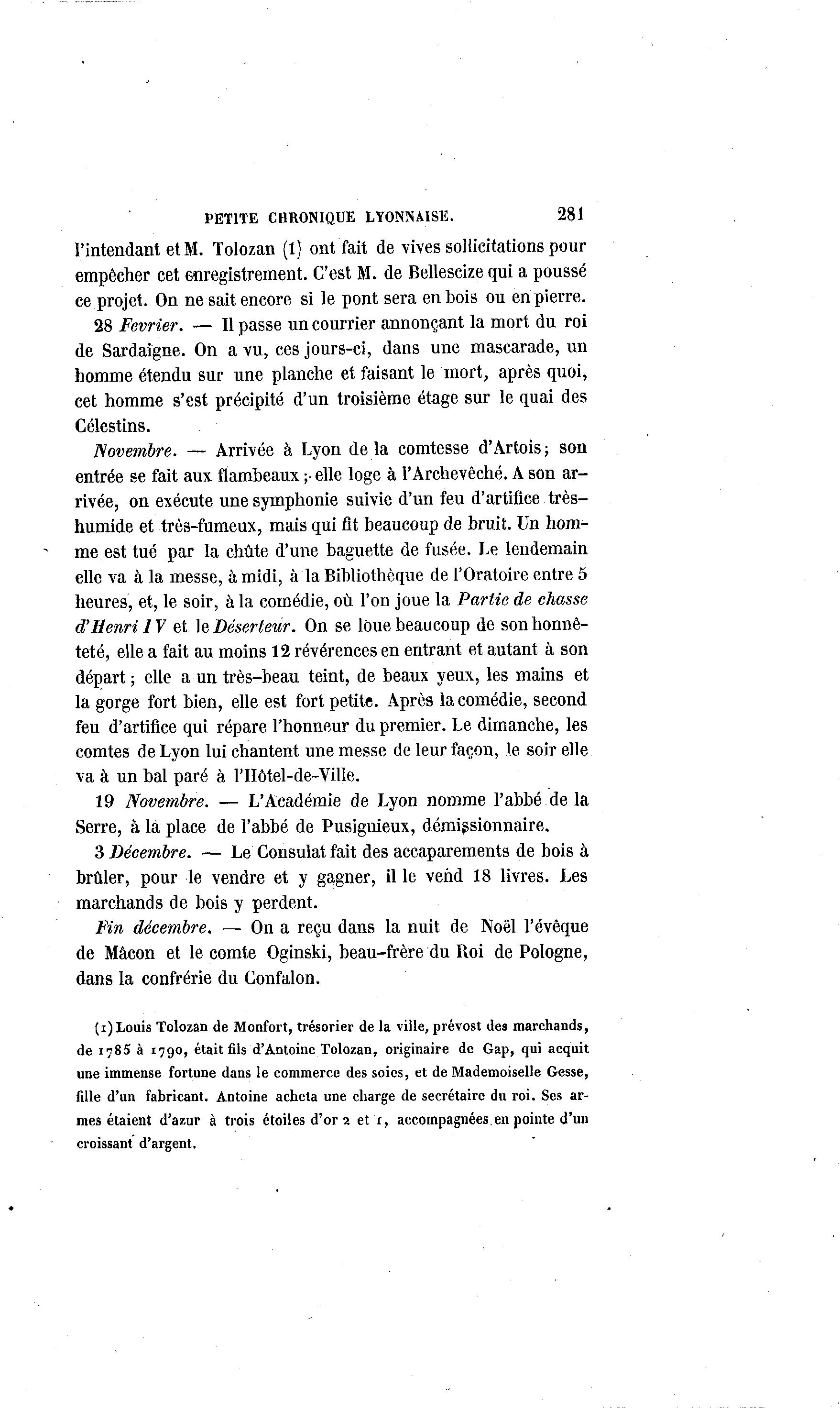 PETITE CHRONIQUE LYONNAISE. 281 l'intendant et M. Tolozan (1) ont fait de vives sollicitations pour empêcher cet enregistrement. C'est M. de Bellescize qui a poussé ce projet. On ne sait encore si le pont sera en bois ou en pierre. 28 Février. — Il passe un courrier annonçant la mort du roi de Sardaigne. On a vu, ces jours-ci, dans une mascarade, un homme étendu sur une planche et faisant le mort, après quoi, cet homme s'est précipité d'un troisième étage sur le quai des Célestins. Novembre. — Arrivée à Lyon delà comtesse d'Artois; son entrée se fait aux flambeaux ;• elle loge à l'Archevêché. A son ar- rivée, on exécute une symphonie suivie d'un feu d'artifice très- humide et très-fumeux, mais qui fit beaucoup de bruit. Un hom- me est tué par la chute d'une baguette de fusée. Le lendemain elle va à la messe, à midi, à la Bibliothèque de l'Oratoire entre 5 heures, et, le soir, à la comédie, où l'on joue la Partie de chasse d'Henri IV et le Déserteur. On se loue beaucoup de son honnê- teté, elle a fait au moins 12 révérences en entrant et autant à son départ; elle a un très-beau teint, de beaux yeux, les mains et la gorge fort bien, elle est fort petite. Après la comédie, second feu d'artifice qui répare l'honneur du premier. Le dimanche, les comtes de Lyon lui chantent une messe de leur façon, le soir elle va à un bal paré à l'Hôtel-de-Ville. 19 Novembre. — L'Académie de Lyon nomme l'abbé de la Serre, à là place de l'abbé de Pusignieux, démissionnaire. 3 Décembre. — Le Consulat fait des accaparements de bois à brûler, pour le vendre et y gagner, il le vend 18 livres. Les marchands de bois y perdent. Fin décembre. — On a reçu dans la nuit de Noël l'évêque de Mâcon et le comte Oginski, beau-frère du Roi de Pologne, dans la confrérie du Confalon. (i) Louis Tolozan de Monfort, trésorier de la ville, prévost des marchands, de inSS à 1790, était fils d'Antoine Tolozan, originaire de Gap, qui acquit une immense fortune dans le commerce des soies, et de Mademoiselle Gesse, fdle d'un fabricant. Antoine acheta une charge de secrétaire du roi. Ses ar- mes étaient d'azur à trois étoiles d'or 2 et r, accompagnées en pointe d'un croissant d'argent.