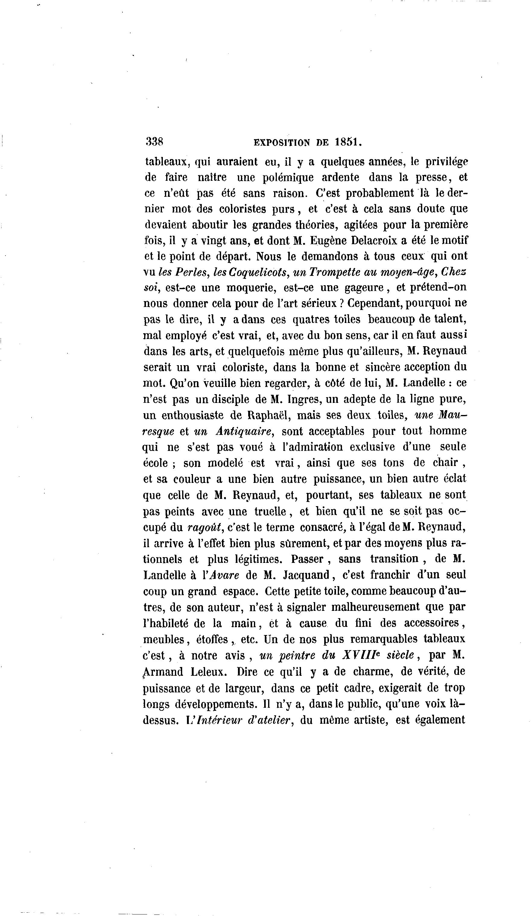 338 EXPOSITION DE 1 8 5 1 . tableaux, qui auraient eu, il y a quelques années, le privilège de faire naître une polémique ardente dans la presse, et ce n'eût pas été sans raison. C'est probablement là le der- nier mot des coloristes purs, et c'est à cela sans doute que devaient aboutir les grandes théories, agitées pour la première fois, il y a vingt ans, et dont M. Eugène Delacroix a été le motif et le point de départ. Nous le demandons à tous ceux qui ont vu les Perles, les Coquelicots, un Trompette au moyen-âge, Chez soi, est-ce une moquerie, est-ce une gageure, et prétend-on nous donner cela pour de l'art sérieux ? Cependant, pourquoi ne pas le dire, il y a dans ces quatres toiles beaucoup de talent, mal employé c'est vrai, et, avec du bon sens, car il en faut aussi dans les arts, et quelquefois même plus qu'ailleurs, M. Reynaud serait un vrai coloriste, dans la bonne et sincère acception du mot. Qu'on veuille bien regarder, à côté de lui, M. Landelle : ce n'est pas un disciple de M. Ingres, un adepte de la ligne pure, un enthousiaste de Raphaël, mais ses deux toiles, une Mau- resque et un Antiquaire, sont acceptables pour tout homme qui ne s'est pas voué à l'admiration exclusive d'une seule école ; son modelé est vrai, ainsi que ses tons de chair , et sa couleur a une bien autre puissance, un bien autre éclat que celle de M. Reynaud, et, pourtant, ses tableaux ne sont pas peints avec une truelle , et bien qu'il ne se soit pas oc- cupé du ragoût, c'est le terme consacré, à l'égal de M. Reynaud, il arrive à l'effet bien plus sûrement, et par des moyens plus ra- tionnels et plus légitimes. Passer , sans transition , de M. Landelle à Y Avare de M. Jacquand, c'est franchir d'un seul coup un grand espace. Cette petite toile, comme beaucoup d'au- tres, de son auteur, n'est à signaler malheureusement que par l'habileté de la main, et à cause du fini des accessoires, meubles, étoffes, etc. Un de nos plus remarquables tableaux c'est, à notre avis , un peintre du XVIIIe siècle, par M. Armand Leleux. Dire ce qu'il y a de charme, de vérité, de puissance et de largeur, dans ce petit cadre, exigerait de trop longs développements. Il n'y a, dans le public, qu'une voix là - dessus. U Intérieur d'atelier, du même artiste, est également