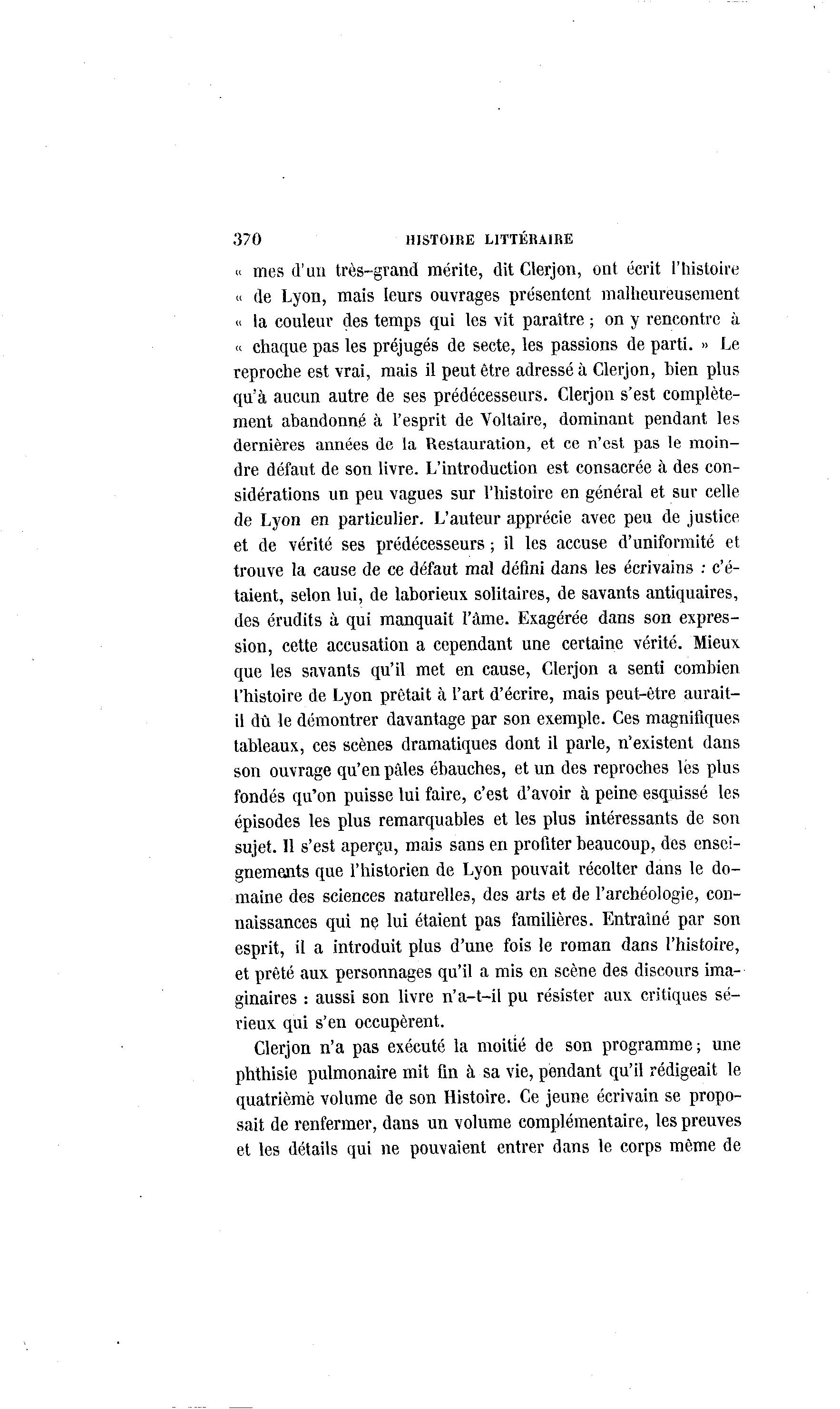 370 HISTOIRE LITTÉRAIRE « mes d'un très-grand mérite, dit Clerjon, ont écrit l'histoire « de Lyon, mais leurs ouvrages présentent malheureusement « la couleur des temps qui les vit paraître ; on y rencontre à « chaque pas les préjugés de secte, les passions de parti. » Le reproche est vrai, mais il peut être adressé à Clerjon, bien plus qu'à aucun autre de ses prédécesseurs. Clerjon s'est complète- ment abandonné à l'esprit de Voltaire, dominant pendant les dernières années de la Restauration, et ce n'est pas le moin- dre défaut de son livre. L'introduction est consacrée à des con- sidérations un peu vagues sur l'histoire en général et sur celle de Lyon en particulier. L'auteur apprécie avec peu de justice et de vérité ses prédécesseurs ; il les accuse d'uniformité et trouve la cause de ce défaut mal défini dans les écrivains : c'é- taient, selon lui, de laborieux solitaires, de savants antiquaires, des érudits à qui manquait l'âme. Exagérée dans son expres- sion, cette accusation a cependant une certaine vérité. Mieux que les savants qu'il met en cause, Clerjon a senti combien l'histoire de Lyon prêtait à l'art d'écrire, mais peut-être aurait- il dû le démontrer davantage par son exemple. Ces magnifiques tableaux, ces scènes dramatiques dont il parle, n'existent dans son ouvrage qu'en pâles ébauches, et un des reproches lés plus fondés qu'on puisse lui faire, c'est d'avoir à peine esquissé les épisodes les plus remarquables et les plus intéressants de son sujet. Il s'est aperçu, mais sans en profiter beaucoup, des ensei- gnements que l'historien de Lyon pouvait récolter dans le do- maine des sciences naturelles, des arts et de l'archéologie, con- naissances qui ne lui étaient pas familières. Entraîné par son esprit, il a introduit plus d'une fois le roman dans l'histoire, et prêté aux personnages qu'il a mis en scène des discours ima- ginaires : aussi son livre n'a-t-il pu résister aux critiques sé- rieux qui s'en occupèrent. Clerjon n'a pas exécuté la moitié de son programme; une phthisie pulmonaire mit fin à sa vie, pendant qu'il rédigeait le quatrième volume de son Histoire. Ce jeune écrivain se propo- sait de renfermer, dans un volume complémentaire, les preuves et les détails qui ne pouvaient entrer dans le corps même de