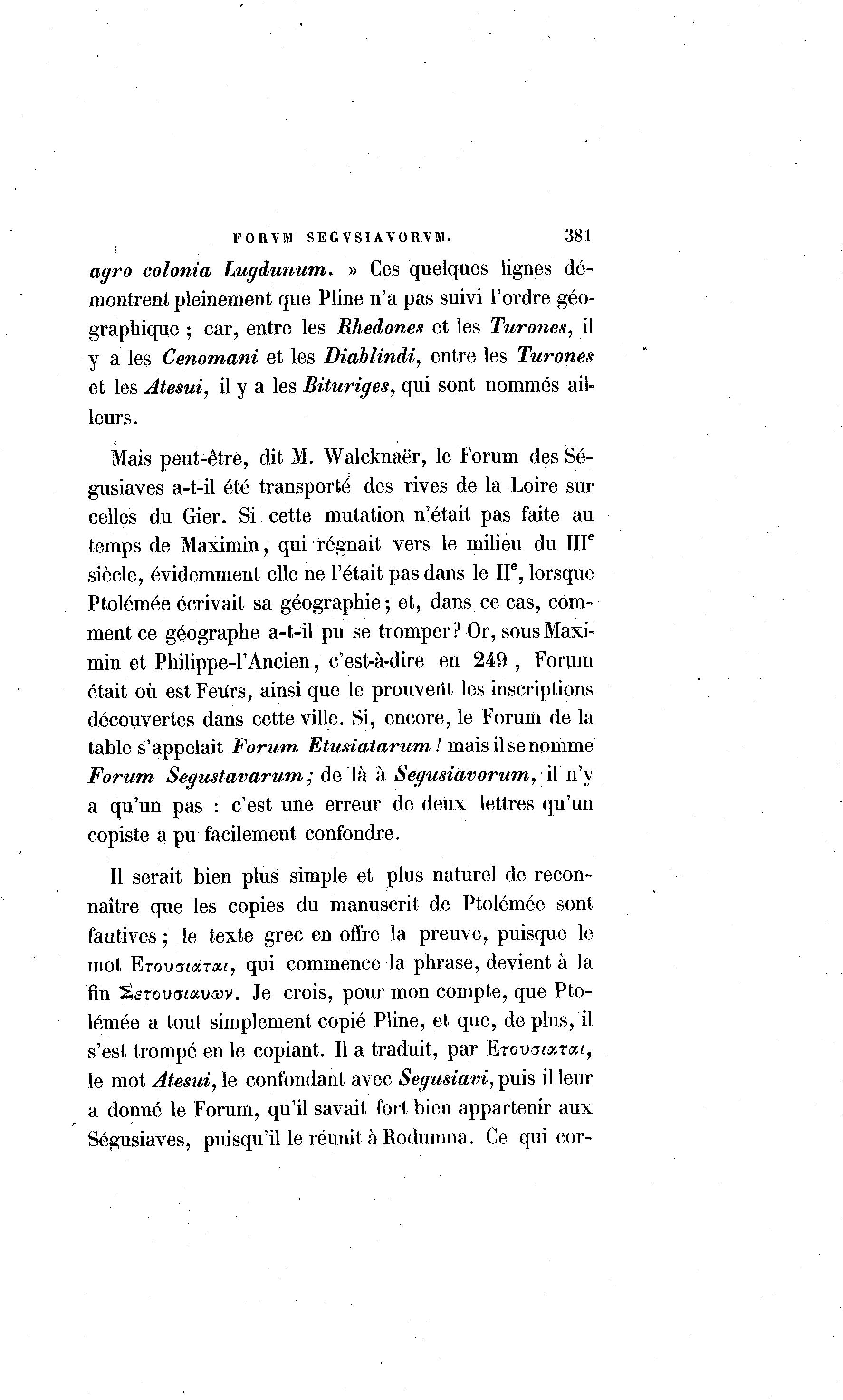 FORVM SEGVSIAVORVM. 381 agro colonia Lugdunum. » Ces quelques lignes dé- montrent pleinement que Pline n'a pas suivi l'ordre géo- graphique ; car, entre les Rhedones et les Turones, il y a les Cenomani et les Diablindi, entre les Turones et les Atesui, il y a les Bituriges, qui sont nommés ail- leurs. Mais peut-être, dit M. Walcknaër, le Forum des Sé- gusiaves a-t-il été transporté des rives de la Loire sur celles du Gier. Si cette mutation n'était pas faite au temps de Maximin, qui régnait vers le milieu du IIIe siècle, évidemment elle ne l'était pas dans le IIe, lorsque Ptolémée écrivait sa géographie ; et, dans ce cas, com- ment ce géographe a-t-il pu se tromper? Or, sous Maxi- min et Philippe-FAncien, c'est-à -dire en 249 , Forum était où est Feùrs, ainsi que le prouverit les inscriptions découvertes dans cette ville. Si, encore, le Forum de la table s'appelait Forum Etusiaiarum ! mais il se nomme Forum Segustavarum ; de là à Segusiavorum, il n'y a qu'un pas : c'est une erreur de deux lettres qu'un copiste a pu facilement confondre. Il serait bien plus simple et plus naturel de recon- naître que les copies du manuscrit de Ptolémée sont fautives ; le texte grec en offre la preuve, puisque le mot Erovacxrxi, qui commence la phrase, devient à la fin 2îeToucH(xua3V. Je crois, pour mon compte, que Pto- lémée a tout simplement copié Pline, et que, de plus, il s'est trompé en le copiant. Il a traduit, par ErovaixTxt, le mot Atesui, le confondant avec Segusiavi, puis il leur a donné le Forum, qu'il savait fort bien appartenir aux Ségusiaves, puisqu'il le réunit à Rodumna. Ce qui cor-
