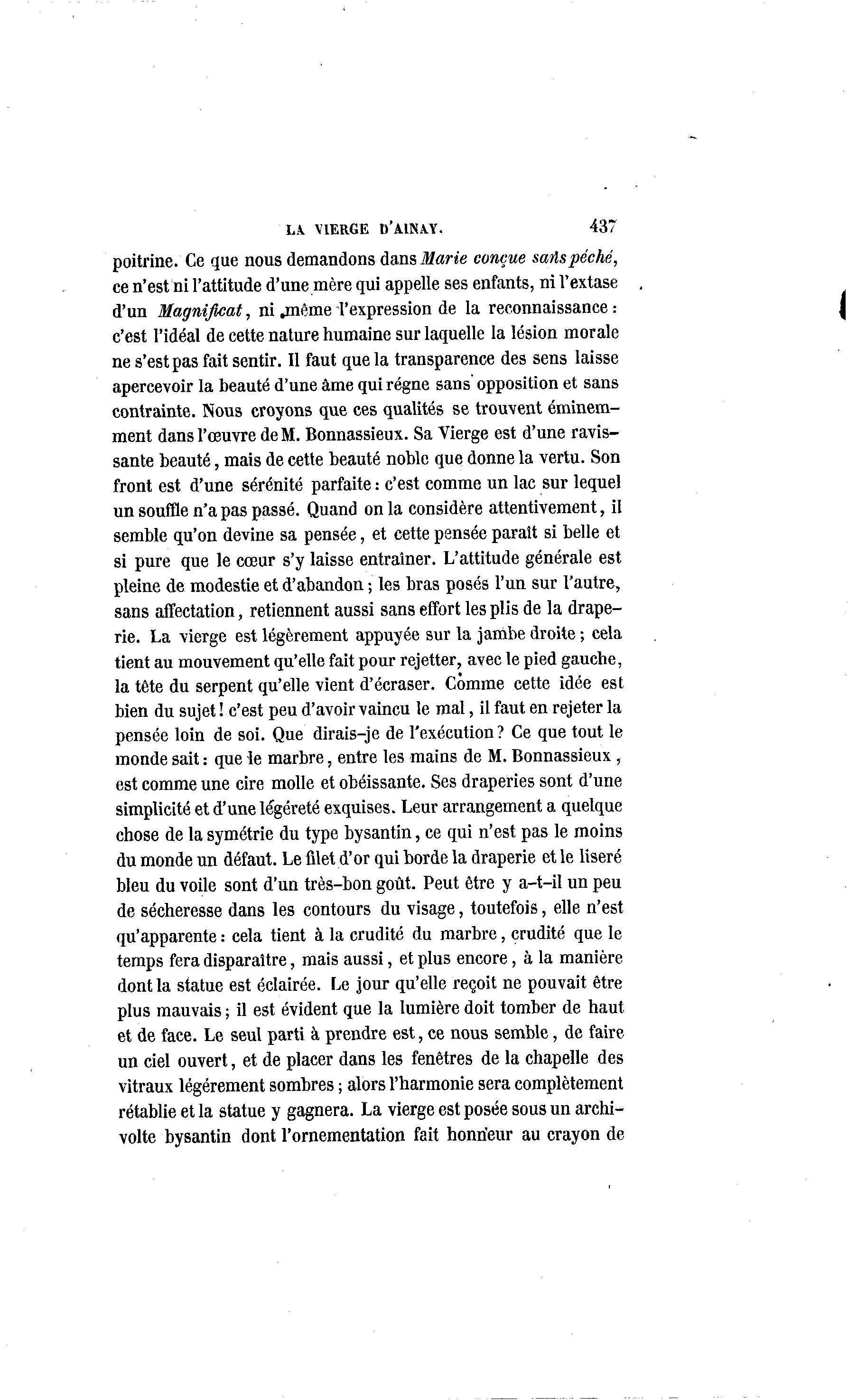 LA. VIERGE D'AINAY. 437 poitrine. Ce que nous demandons dans Manie conçue saûs péché, ce n'est ni l'attitude d'une mère qui appelle ses enfants, ni l'extase d'un Magnificat, ni .même l'expression de la reconnaissance : c'est l'idéal de cette nature humaine sur laquelle la lésion morale ne s'est pas fait sentir. Il faut que la transparence des sens laisse apercevoir la beauté d'une âme qui régne sans opposition et sans contrainte. Nous croyons que ces qualités se trouvent éminem- ment dans l'œuvre de M. Bonnassieux. Sa Vierge est d'une ravis- sante beauté, mais de cette beauté noble que donne la vertu. Son front est d'une sérénité parfaite : c'est comme un lac sur lequel un souffle n'a pas passé. Quand on la considère attentivement, il semble qu'on devine sa pensée, et cette pensée paraît si belle et si pure que le cœur s'y laisse entraîner. L'attitude générale est pleine de modestie et d'abandon ; les bras posés l'un sur l'autre, sans affectation, retiennent aussi sans effort les plis de la drape- rie. La vierge est légèrement appuyée sur la jambe droite ; cela tient au mouvement qu'elle fait pour rejetter, avec le pied gauche, la tête du serpent qu'elle vient d'écraser. Comme cette idée est bien du sujet ! c'est peu d'avoir vaincu le mal, il faut en rejeter la pensée loin de soi. Que dirais-je de l'exécution? Ce que tout le monde sait : que le marbre, entre les mains de M. Bonnassieux , est comme une cire molle et obéissante. Ses draperies sont d'une simplicité et d'une légèreté exquises. Leur arrangement a quelque chose de la symétrie du type bysantin, ce qui n'est pas le moins du monde un défaut. Lefiletd'or qui borde la draperie et le liseré bleu du voile sont d'un très-bon goût. Peut être y a-t-il un peu de sécheresse dans les contours du visage, toutefois, elle n'est qu'apparente : cela tient à la crudité du marbre, crudité que le temps fera disparaître, mais aussi, et plus encore, à la manière dont la statue est éclairée. Le jour qu'elle reçoit ne pouvait être plus mauvais ; il est évident que la lumière doit tomber de haut et de face. Le seul parti à prendre est, ce nous semble, de faire un ciel ouvert, et de placer dans les fenêtres de la chapelle des vitraux légèrement sombres ; alors l'harmonie sera complètement rétablie et la statue y gagnera. La vierge est posée sous un archi- volte bysantin dont l'ornementation fait honrieur au crayon de