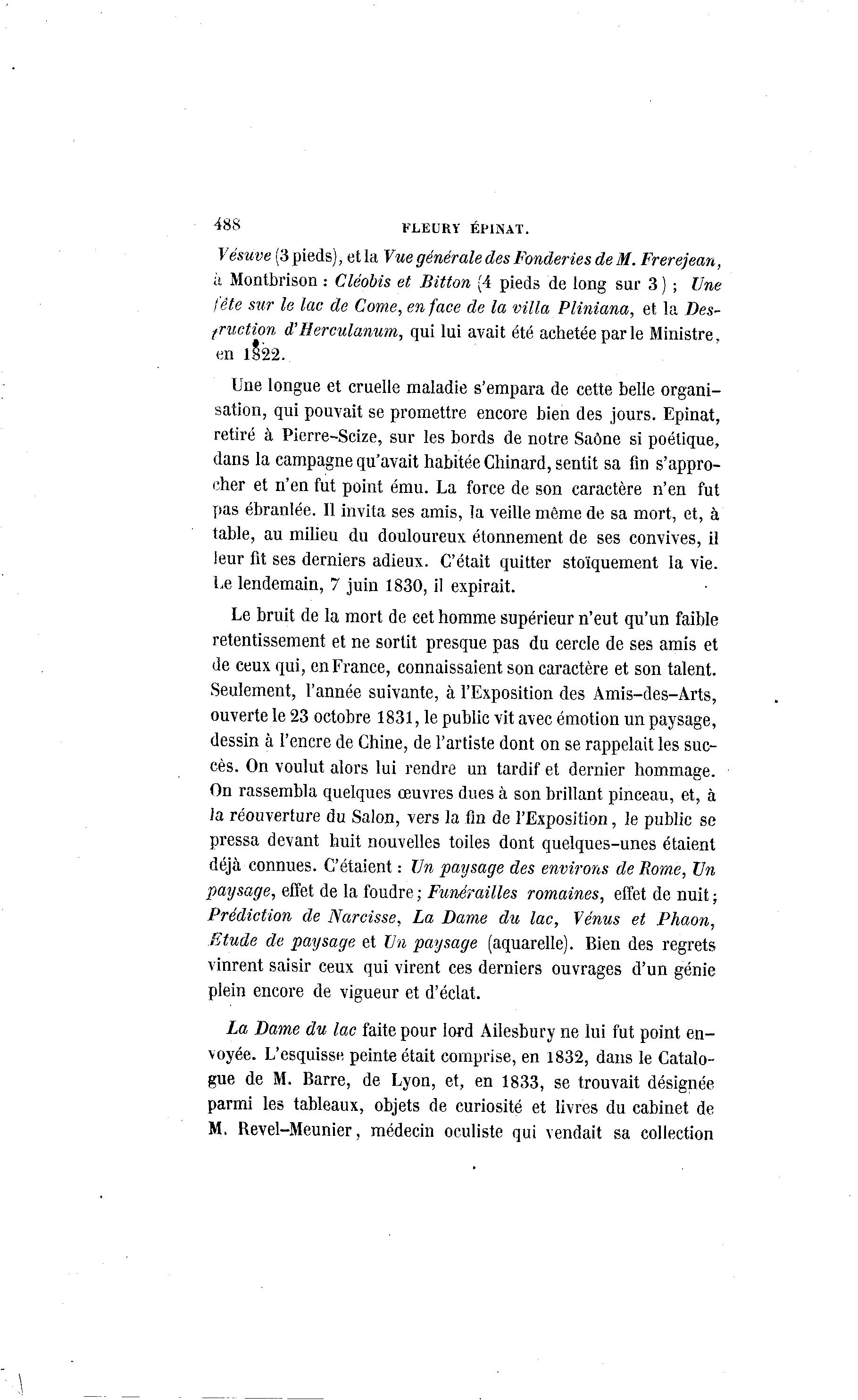488 FLEURY ÉPINAT. Vésuve (3 pieds), et la Vue générale des Fonderies de M. Frerejean, à Montbrison : Cléobis et Bitton (4 pieds de long sur 3 ) ; Une fête sur le lac de Corne, en face de la villa Pliniana, et la Des- fruction d'Herculanum, qui lui avait été achetée parle Ministre, en 1§22.. Une longue et cruelle maladie s'empara de cette belle organi- sation, qui pouvait se promettre encore bien des jours. Epinat, retiré à Pierre-Scize, sur les bords de notre Saône si poétique, dans la campagne qu'avait habitée Chinard, sentit sa fin s'appro- cher et n'en fut point ému. La force de son caractère n'en fut pas ébranlée. Il invita ses amis, la veille même de sa mort, et, à table, au milieu du douloureux étonnement de ses convives, il leur fit ses derniers adieux. C'était quitter stoïquement la vie. Le lendemain, 7 juin 1830, il expirait. Le bruit de la mort de cet homme supérieur n'eut qu'un faible retentissement et ne sortit presque pas du cercle de ses amis et de ceux qui, en France, connaissaient son caractère et son talent. Seulement, l'année suivante, à l'Exposition des Àmis-des-Àrts, ouverte le 23 octobre 1831, le public vit avec émotion un paysage, dessin à l'encre de Chine, de l'artiste dont on se rappelait les suc- cès. On voulut alors lui rendre un tardif et dernier hommage. On rassembla quelques œuvres dues à son brillant pinceau, et, à Ja réouverture du Salon, vers la fin de l'Exposition, le public se pressa devant huit nouvelles toiles dont quelques-unes étaient déjà connues. C'étaient : Un paysage des environs de Rome, Un paysage, effet de la foudre ; Funérailles romaines, effet de nuit ; Prédiction de Narcisse, La Dame du lac, Vénus et Phaon, Etude de paysage et Un paysage (aquarelle). Bien des regrets vinrent saisir ceux qui virent ces derniers ouvrages d'un génie plein encore de vigueur et d'éclat. La Dame du lac faite pour lord Ailesbury ne lui fut point en- voyée. L'esquisse peinte était comprise, en 1832, dans le Catalo- gue de M. Barre, de Lyon, et, en 1833, se trouvait désignée parmi les tableaux, objets de curiosité et livres du cabinet de M. Revel-Meunier, médecin oculiste qui vendait sa collection