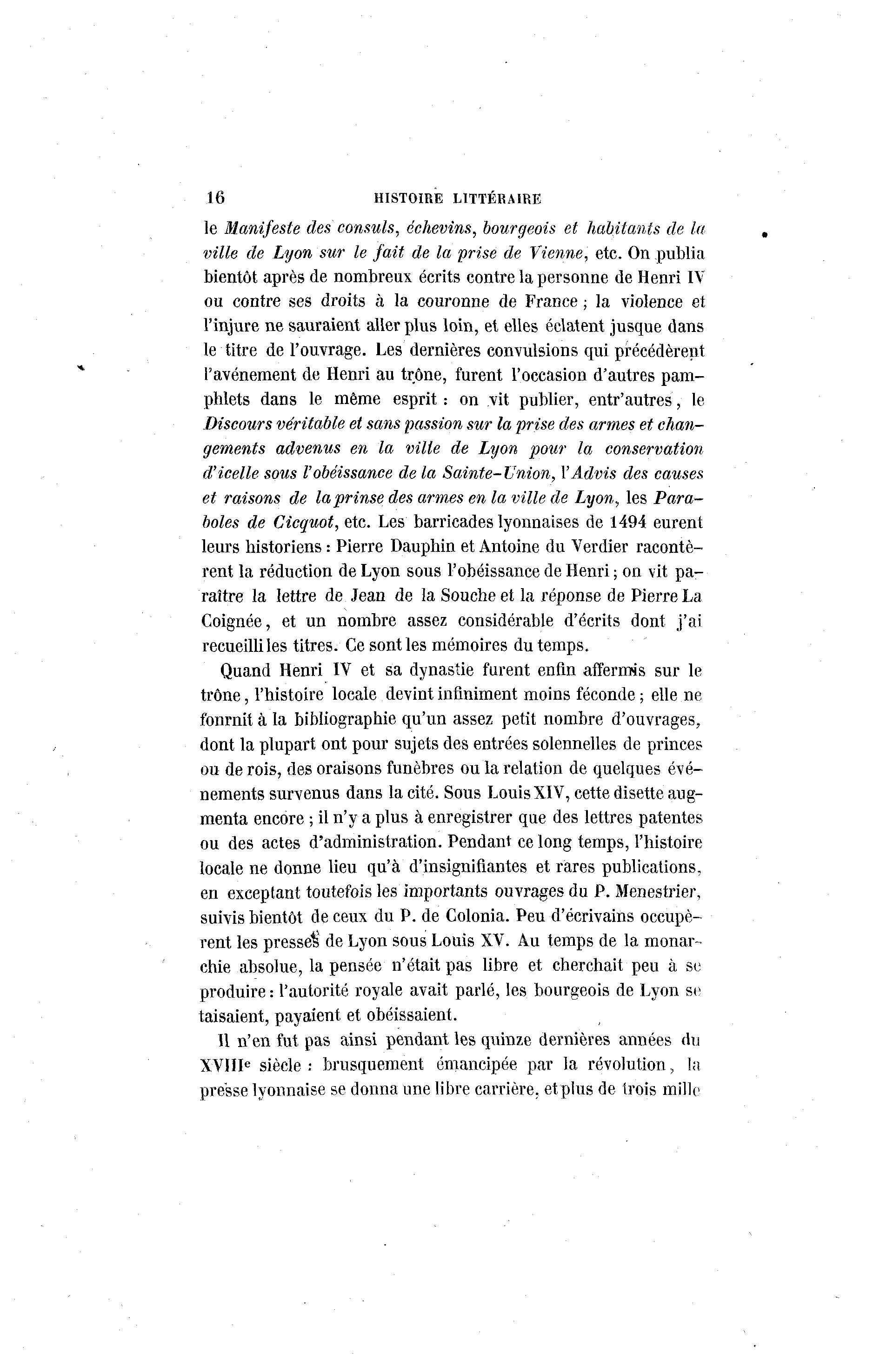 16 HISTOIRE LITTÉRAIRE le Manifeste des consuls, échevins, bourgeois et habitants de la ville de Lyon sur le fait de la prise de Vienne, etc. On publia bientôt après de nombreux écrits contre la personne de Henri IV ou contre ses droits à la couronne de France ; la violence et l'injure ne sauraient aller plus loin, et elles éclatent jusque dans le titre de l'ouvrage. Les dernières convulsions qui précédèrent l'avènement de Henri au trône, furent l'occasion d'autres pam- phlets dans le même esprit : on vit publier, entr'autres, le Discours véritable et sans passion sur la prise des armes et chan- gements advenus en la ville de Lyon pour la conservation d'icelle sous l'obéissance de la Sainte-Union, YAdvis des causes et raisons de laprinse des armes en la ville de Lyon, les Para- boles de Cicquot, etc. Les barricades lyonnaises de 1494 eurent leurs historiens : Pierre Dauphin et Antoine du Verdier racontè- rent la réduction de Lyon sous l'obéissance de Henri ; on vit pa- raître la lettre de Jean de la Souche et la réponse de Pierre La Coignée, et un nombre assez considérable d'écrits dont j'ai recueilliles titres. Ce sont les mémoires du temps. Quand Henri IV et sa dynastie furent enfin affermis sur le trône, l'histoire locale devint infiniment moins féconde ; elle ne fonrnit à la bibliographie qu'un assez petit nombre d'ouvrages, dont la plupart ont pour sujets des entrées solennelles de princes ou de rois, des oraisons funèbres ou la relation de quelques évé- nements survenus dans la cité. Sous Louis XIV, cette disette aug- menta encore ; il n'y a plus à enregistrer que des lettres patentes ou des actes d'administration. Pendant ce long temps, l'histoire locale ne donne lieu qu'à d'insignifiantes et rares publications, en exceptant toutefois les importants ouvrages du P. Menestrier, suivis bientôt de ceux du P. de Colonia. Peu d'écrivains occupè- rent les presse^ de Lyon sous Louis XV. Au temps de la monar- chie absolue, la pensée n'était pas libre et cherchait peu à se produire : l'autorité royale avait parlé, les bourgeois de Lyon se taisaient, payaient et obéissaient. Il n'en fut pas ainsi pendant les quinze dernières années du XVIIIe siècle : brusquement émancipée par la révolution, la presse lyonnaise se donna une libre carrière, et plus de trois mille