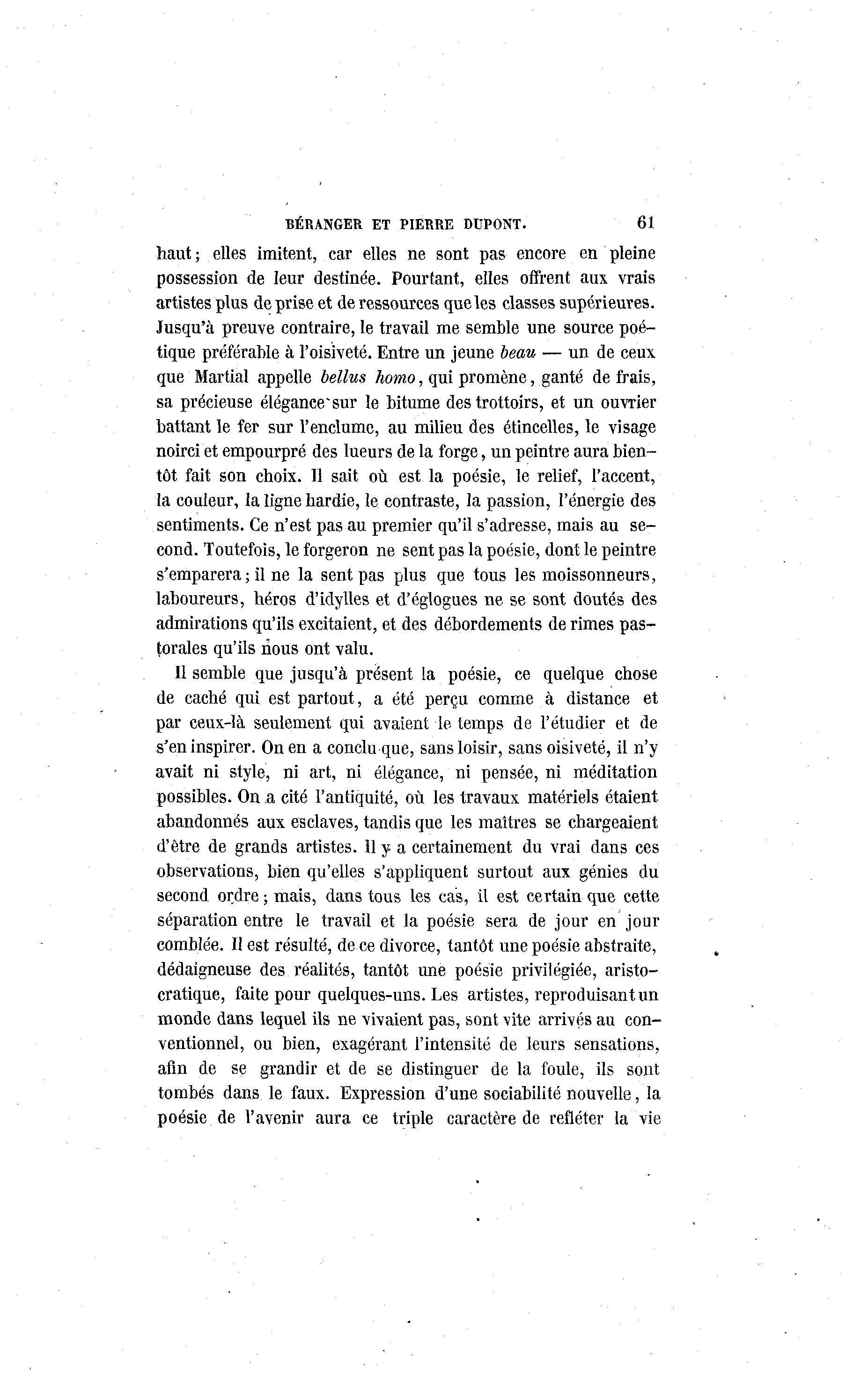BÉRANGER ET PIERRE DUPONT. 61 haut ; elles imitent, car elles ne sont pas encore en pleine possession de leur destinée. Pourtant, elles offrent aux vrais artistes plus de prise et de ressources que les classes supérieures. Jusqu'à preuve contraire, le travail me semble une source poé- tique préférable à l'oisiveté. Entre un jeune beau — un de ceux que Martial appelle bellus homo, qui promène, ganté de frais, sa précieuse élégance'sur le bitume des trottoirs, et un ouvrier battant le fer sur l'enclume, au milieu des étincelles, le visage noirci et empourpré des lueurs de la forge, un peintre aura bien- tôt fait son choix. 11 sait où est la poésie, le relief, l'accent, la couleur, la ligne hardie, le contraste, la passion, l'énergie des sentiments. Ce n'est pas au premier qu'il s'adresse, mais au se- cond. Toutefois, le forgeron ne sent pas la poésie, dont le peintre s'emparera ; il ne la sent pas plus que tous les moissonneurs, laboureurs, héros d'idylles et d'églogues ne se sont doutés des admirations qu'ils excitaient, et des débordements de rimes pas- torales qu'ils nous ont valu. Il semble que jusqu'à présent la poésie, ce quelque chose de caché qui est partout, a été perçu comme à distance et par ceux-là seulement qui avaient le temps de l'étudier et de s'en inspirer. On en a conclu que, sans loisir, sans oisiveté, il n'y avait ni style, ni art, ni élégance, ni pensée, ni méditation possibles. On a cité l'antiquité, où les travaux matériels étaient abandonnés aux esclaves, tandis que les maîtres se chargeaient d'être de grands artistes. Il y a certainement du vrai dans ces observations, bien qu'elles s'appliquent surtout aux génies du second ordre ; mais, dans tous les cas, il est certain que cette séparation entre le travail et la poésie sera de jour en jour comblée. Il est résulté, de ce divorce, tantôt une poésie abstraite, dédaigneuse des réalités, tantôt une poésie privilégiée, aristo- cratique, faite pour quelques-uns. Les artistes, reproduisant un monde dans lequel ils ne vivaient pas, sont vite arrivés au con- ventionnel, ou bien, exagérant l'intensité de leurs sensations, afin de se grandir et de se distinguer de la foule, ils sont tombés dans le faux. Expression d'une sociabilité nouvelle, la poésie de l'avenir aura ce triple caractère de refléter la vie