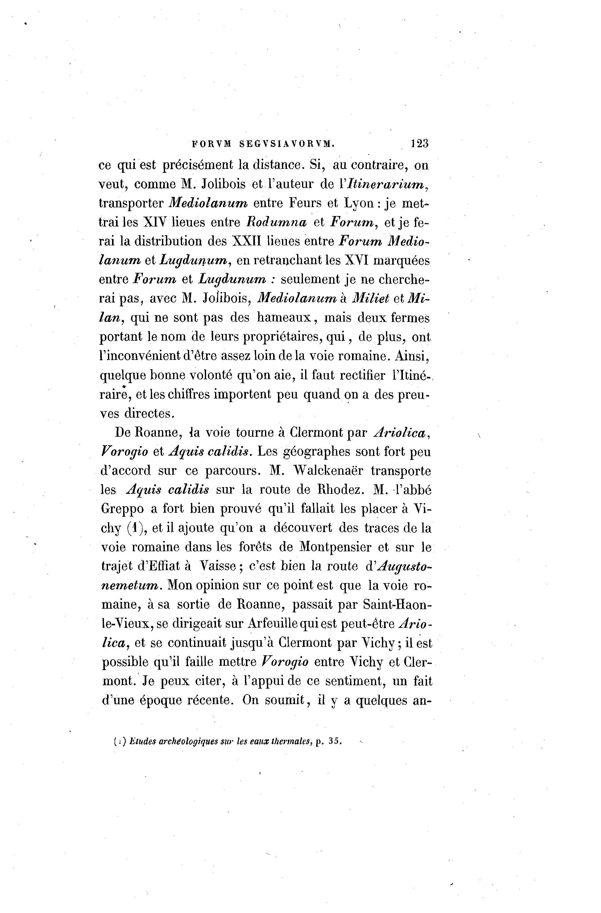 FORVM SEGVSIAVORVM. 123 ce qui est précisément la distance. Si, au contraire, on veut, comme M. Jolibois • et.l'auteur de Yltinerarium, transporter Mediolanum entre Feurs et Lyon : je met- trai les XIV lieues entre Rodumna et Forum, et je fe- rai la distribution des XXII lieues entre Forum Meiio- lanum et Lugdunum, en retranchant les XVI marquées entre Forum et Lugdunum : seulement je ne cherche- rai pas, avec M. Joîibois, Mediolanum, h Miliet et Mi- lan, qui ne sont pas des hameaux, mais deux fermes portant le nom de leurs propriétaires, qui, de plus, ont l'inconvénient d'être assez loin de la voie romaine. Ainsi, quelque bonne volonté qu'on aie, il faut rectifier l'Itiné- raire, et les chiffres importent peu quand on a des preu- ves directes. De Roanne, la voie tourne à Clermontpar Ariolica, Vorogio et Aquis calidis. Les géographes sont fort peu d'accord sur ce parcours. M. Walckenaër transporte les Aquis calidis sur la route de Rhodez. M. l'abbé Greppo a fort bien prouvé qu'il fallait les placer à Vi- chy (1), et il ajoute qu'on a découvert des traces de la voie romaine dans les forêts de Montpensier et sur le trajet d'Effiat à Vaisse ; c'est bien la route à 'Augusto- nemetum. Mon opinion sur ce point est que la voie ro- maine, à sa sortie de Roanne, passait par Saint-Haon- le-Vieux, se dirigeait sur Arfeuille qui est peut-être Ario- lica, et se continuait jusqu'à Clermont par Vichy; il est possible qu'il faille mettre Vorogio entre Vichy et Cler- mont. Je peux citer, à l'appui de ce sentiment, un fait d'une époque récente. On soumit, il y a quelques an- ( : ) Eludes archéologiques sur les eaux thermales, p. 35.