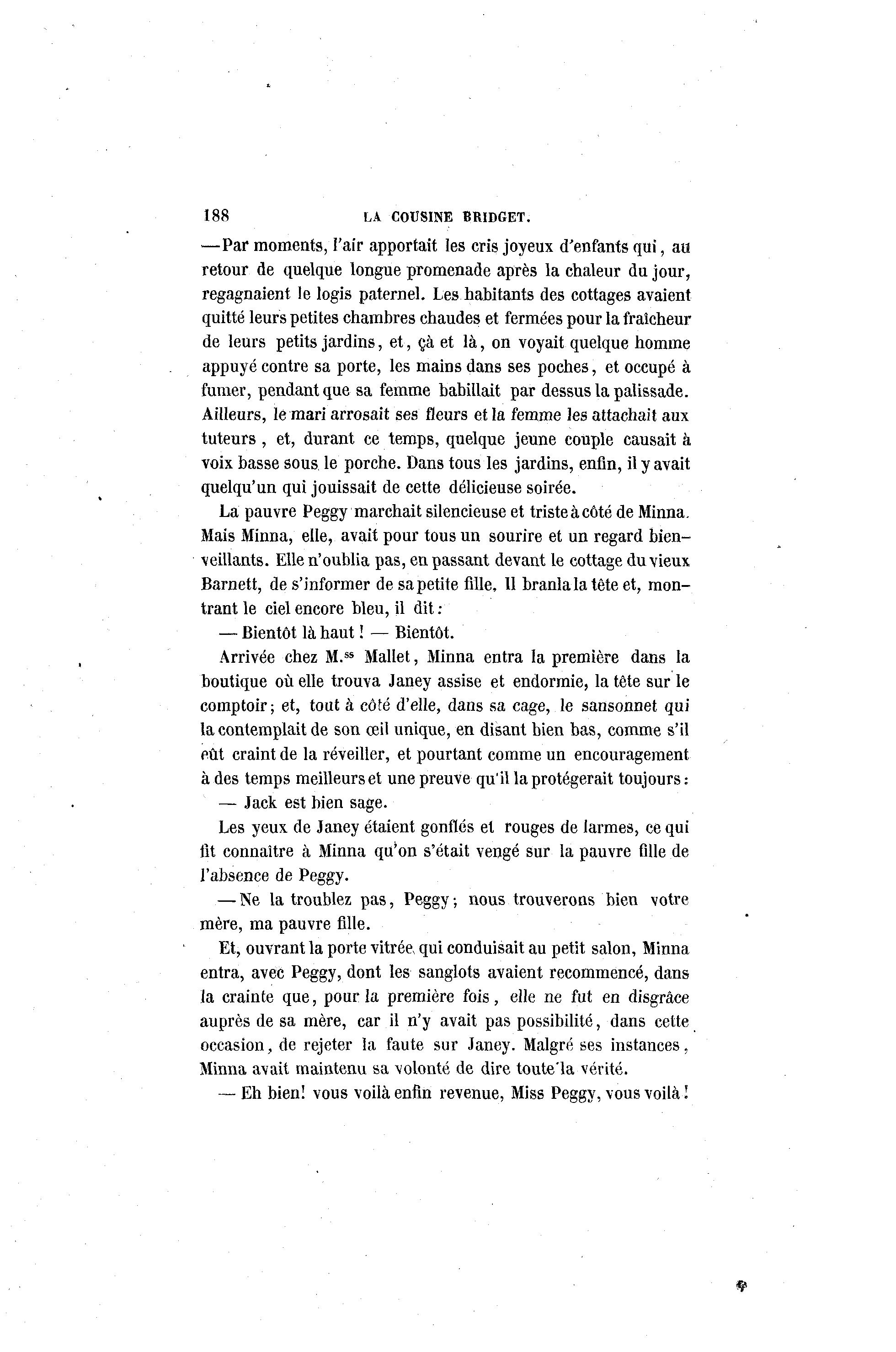 188 LA COUSINE BRIDGET. —Par moments, l'air apportait les cris joyeux d'enfants qui, au retour de quelque longue promenade après la chaleur du jour, regagnaient le logis paternel. Les habitants des cottages avaient quitté leurs petites chambres chaudes et fermées pour la fraîcheur de leurs petits jardins, et, çà et là , on voyait quelque homme appuyé contre sa porte, les mains dans ses poches, et occupé à fumer, pendant que sa femme babillait par dessus la palissade. Ailleurs, le mari arrosait ses fleurs et la femme les attachait aux tuteurs , et, durant ce temps, quelque jeune couple causait à voix basse sous le porche. Dans tous les jardins, enfin, il y avait quelqu'un qui jouissait de cette délicieuse soirée. La pauvre Peggy marchait silencieuse et triste à côté de Minna. Mais Minna, elle, avait pour tous un sourire et un regard bien- veillants. Elle n'oublia pas, en passant devant le cottage du vieux Barnett, désinformer de sa petite fille, 11 branla la tête et, mon- trant le ciel encore bleu, il dit : — Bientôt là haut ! — Bientôt. Arrivée chez M.ss Mallet, Minna entra la première dans la boutique où elle trouva Janey assise et endormie, la tête sur le comptoir; et, tout à côté d'elle, dans sa cage, le sansonnet qui la contemplait de son œil unique, en disant bien bas, comme s'il eût craint de la réveiller, et pourtant comme un encouragement à des temps meilleurs et une preuve qu'il la protégerait toujours : — Jack est bien sage. Les yeux de Janey étaient gonflés et rouges de larmes, ce qui fit connaître à Minna qu'on s'était vengé sur la pauvre fille de l'absence de Peggy. — Ne la troublez pas, Peggy ; nous trouverons bien votre mère, ma pauvre fille. Et, ouvrant la porte vitrée qui conduisait au petit salon, Minna entra, avec Peggy, dont les sanglots avaient recommencé, dans la crainte que, pour la première fois, elle ne fut en disgrâce auprès de sa mère, car il n'y avait pas possibilité, dans cette occasion, de rejeter la faute sur Janey. Malgré ses instances, Minna avait maintenu sa volonté de dire toute'la vérité. — Eh bien! vous voilà enfin revenue, Miss Peggy, vous voilà I