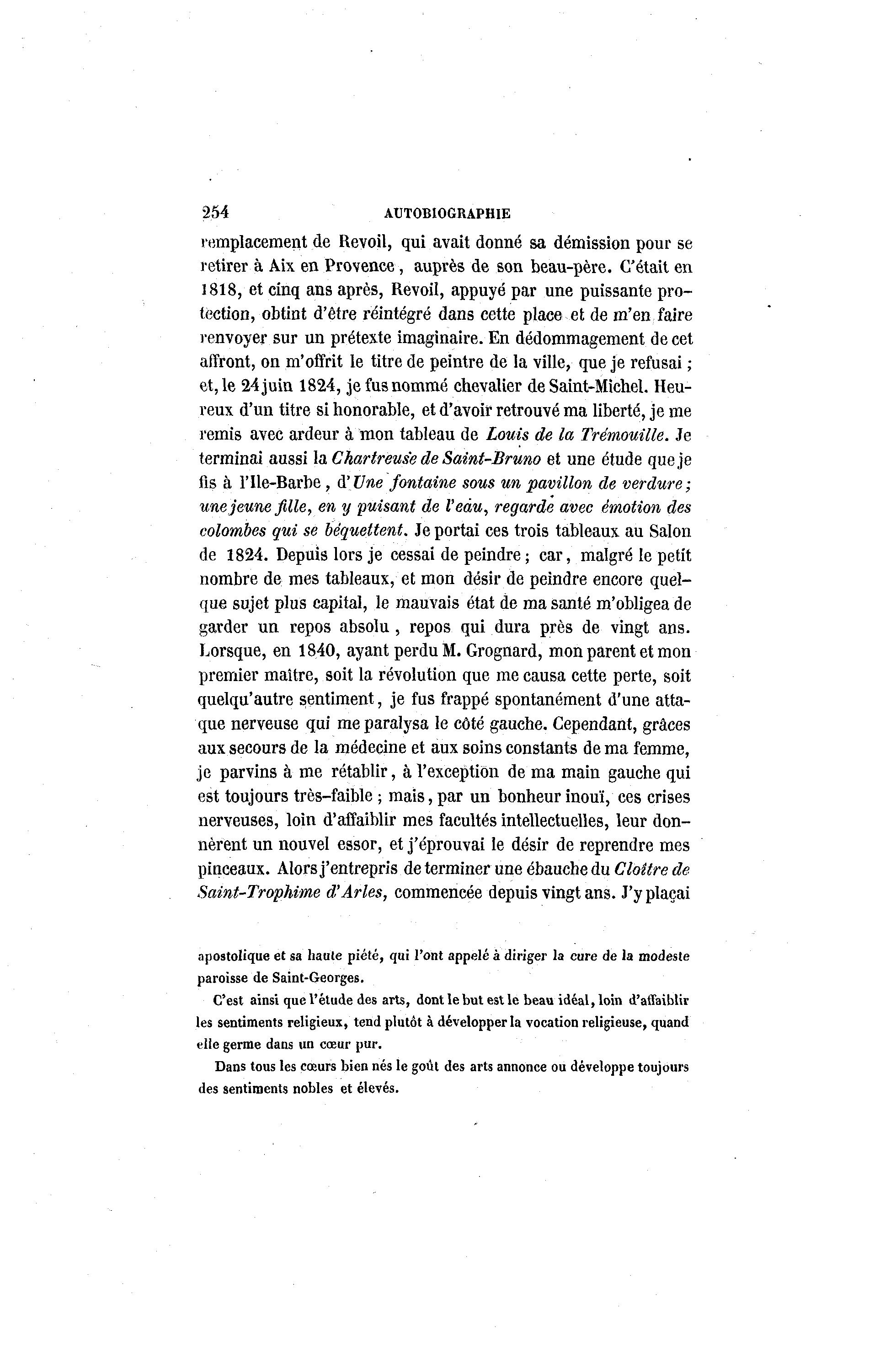 254 AUTOBIOGRAPHIE remplacement de Revoil, qui avait donné sa démission pour se retirer à Aix en Provence, auprès de son beau-père. C'était en 1818, et cinq ans après, Revoil, appuyé par une puissante pro- tection, obtint d'être réintégré dans cette place et de m'en faire renvoyer sur un prétexte imaginaire. En dédommagement de cet affront, on m'offrit le titre de peintre de la ville, que je refusai ; et, le 24 juin 1824, je fus nommé chevalier de Saint-Michel. Heu- reux d'un titre si honorable, et d'avoir retrouvé ma liberté, je me remis avec ardeur à mon tableau de Louis de la Trémouille. Je terminai aussi la Chartreuse de Saint-Bruno et une étude que je fis à l'Ile-Barbe, à 'Une fontaine sous un pavillon de verdure; une jeune fille, en y puisant de l'eau, regarde avec émotion des colombes qui se béquettent. Je portai ces trois tableaux au Salon de 1824. Depuis lors je cessai de peindre ; car, malgré le petit nombre de mes tableaux, et mon désir de peindre encore quel- que sujet plus capital, le mauvais état de ma santé m'obligea de garder un repos absolu , repos qui dura près de vingt ans. Lorsque, en 1840, ayant perdu M. Grognard, mon parent et mon premier maître, soit la révolution que me causa cette perte, soit quelqu'autre sentiment, je fus frappé spontanément d'une atta- que nerveuse qui me paralysa le côté gauche. Cependant, grâces aux secours de la médecine et aux soins constants de ma femme, je parvins à me rétablir, à l'exception de ma main gauche qui est toujours très-faible ; mais, par un bonheur inouï, ces crises nerveuses, loin d'affaiblir mes facultés intellectuelles, leur don- nèrent un nouvel essor, et j'éprouvai le désir de reprendre mes pinceaux. Alors j'entrepris de terminer une ébauche du Cloître de Saint-Trophime d'Arles, commencée depuis vingt ans. J'y plaçai apostolique et sa haute piété, qui l'ont appelé à diriger la cure de la modeste paroisse de Saint-Georges. C'est ainsi que l'étude des arts, dont le but est le beau idéal, loin d'affaiblir les sentiments religieux, tend plutôt à développer la vocation religieuse, quand elle germe dans un cœur pur. Dans tous les cœurs bien nés le goût des arts annonce ou développe toujours des sentiments nobles et élevés.