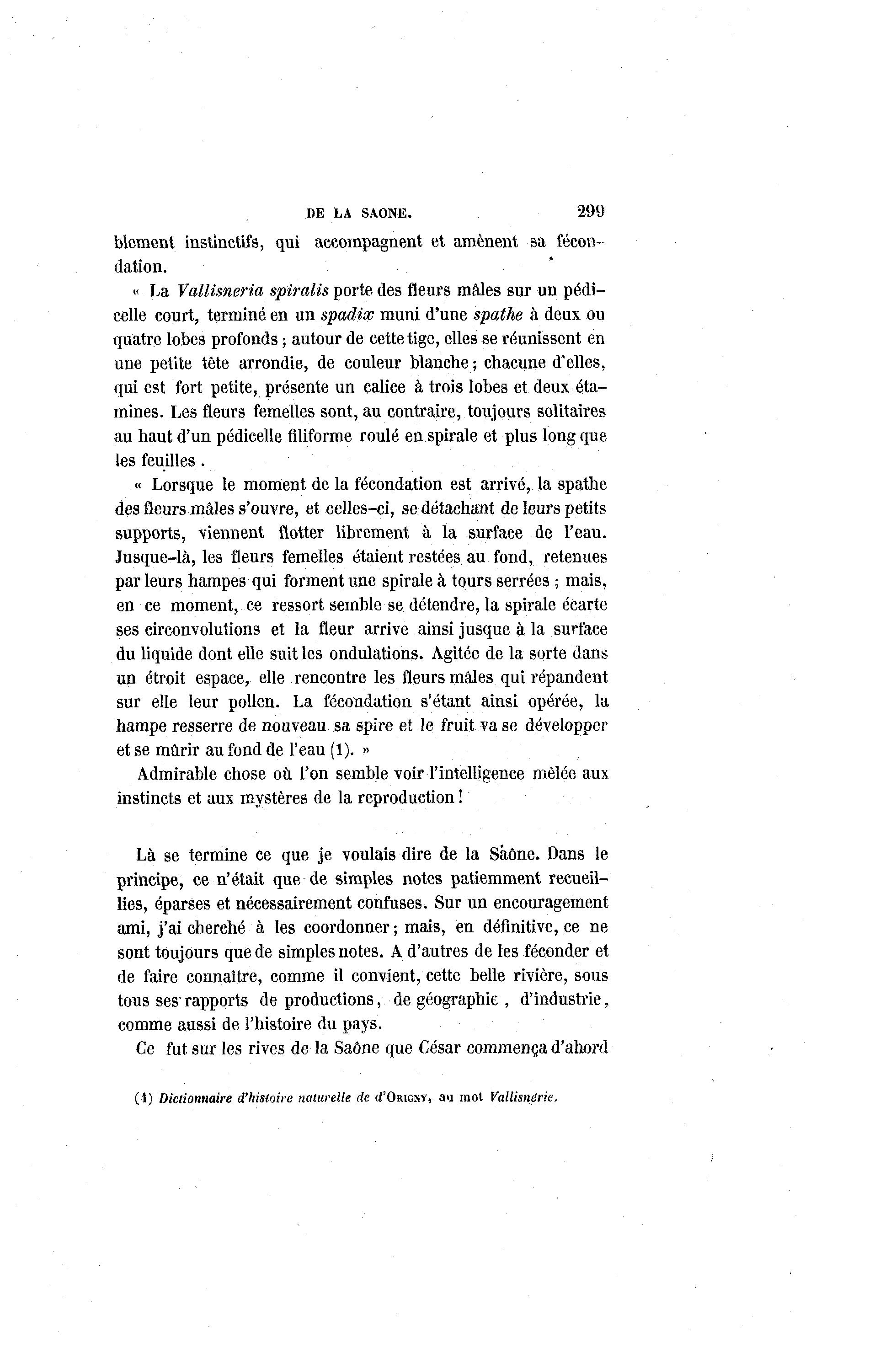 DE LA SAONE. 299 blement instinctifs, qui accompagnent et amènent sa fécon- dation. « La Vallisneria spiralis porte des fleurs maies sur un pedi- celle court, terminé en un spadix muni d'une spathe à deux ou quatre lobes profonds ; autour de cette tige, elles se réunissent en une petite tête arrondie, de couleur blanche ; chacune d'elles, qui est fort petite, présente un calice à trois lobes et deux éta- mines. Les fleurs femelles sont, au contraire, toujours solitaires au haut d'un pedicelle filiforme roulé en spirale et plus long que les feuilles . « Lorsque le moment de la fécondation est arrivé, la spathe des fleurs mâles s'ouvre, et celles-ci, se détachant de leurs petits supports, viennent flotter librement à la surface de l'eau. Jusque-là , les fleurs femelles étaient restées au fond, retenues par leurs hampes qui forment une spirale à tours serrées ; mais, en ce moment, ce ressort semble se détendre, la spirale écarte ses circonvolutions et la fleur arrive ainsi jusque à la surface du liquide dont elle suit les ondulations. Agitée de la sorte dans un étroit espace, elle rencontre les fleurs mâles qui répandent sur elle leur pollen. La fécondation s'étant ainsi opérée, la hampe resserre de nouveau sa spire et le fruit va se développer et se mûrir au fond de l'eau (1). » Admirable chose où l'on semble voir l'intelligence mêlée aux instincts et aux mystères de la reproduction ! Là se termine ce que je voulais dire de la Saône. Dans le principe, ce n'était que de simples notes patiemment recueil- lies, éparses et nécessairement confuses. Sur un encouragement ami, j'ai cherché à les coordonner ; mais, en définitive, ce ne sont toujours que de simples notes. À d'autres de les féconder et de faire connaître, comme il convient, cette belle rivière, sous tous ses' rapports de productions, de géographie , d'industrie, comme aussi de l'histoire du pays. Ce fut sur les rives de la Saône que César commença d'abord (1) Dictionnaire d'histoire naturelle de (J'ORIGNÃ, au mol Vallisnérie.