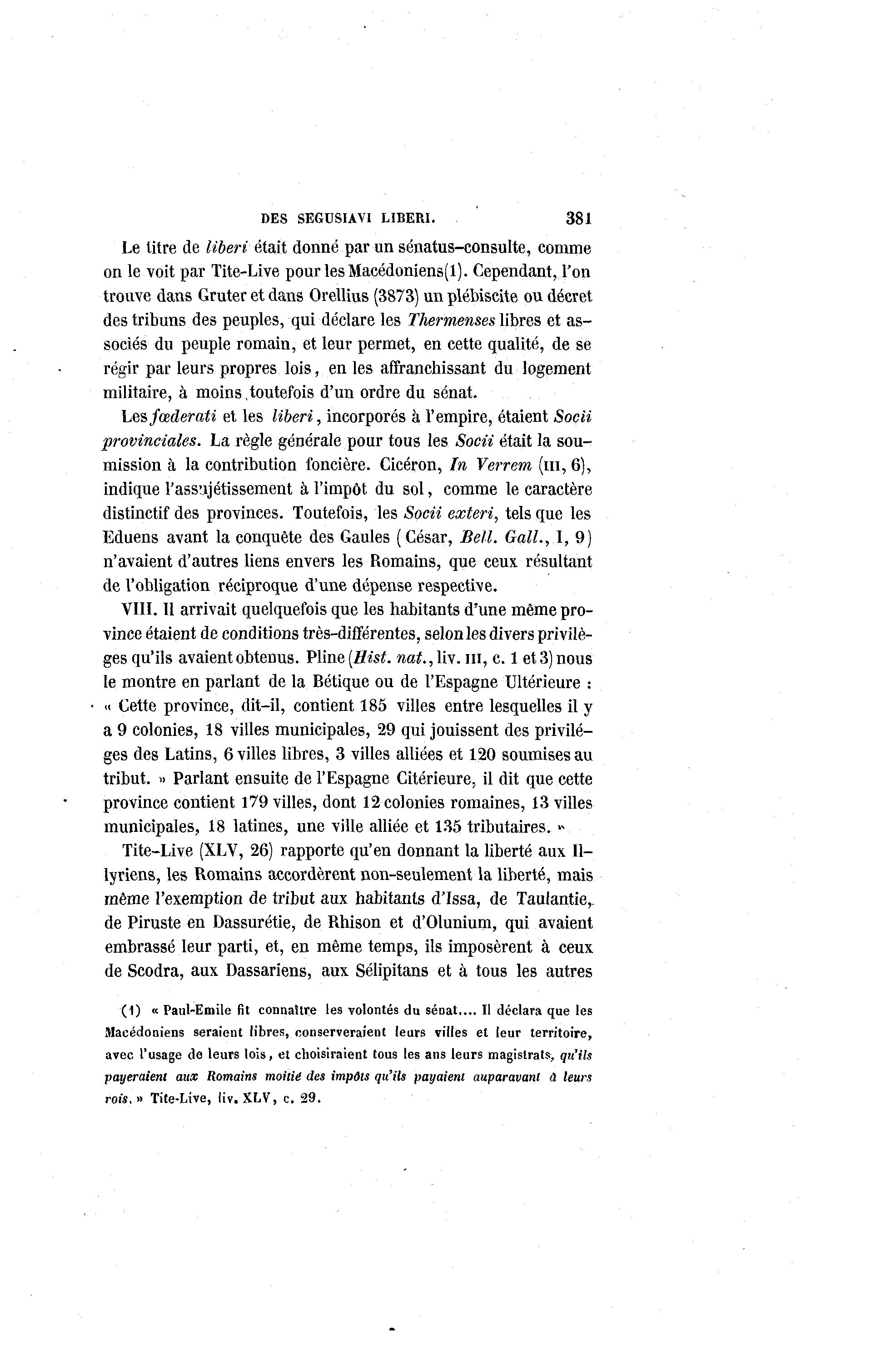 DES SEGUSIAVI LIBERI. 381 Le titre de liberi était donné par un sénatus-consulte, comme on le voit par Tite-Live pour les Macédoniens(l). Cependant, l'on trouve dans Gruter et dans Orellius (3873) un plébiscite ou décret des tribuns des peuples, qui déclare les Thermenses libres et as- sociés du peuple romain, et leur permet, en cette qualité, de se régir par leurs propres lois, en les affranchissant du logement militaire, à moins .toutefois d'un ordre du sénat. Lesfœderati et les liberi, incorporés à l'empire, étaient Socii provinciales. La règle générale pour tous les Socii était la sou- mission à la contribution foncière. Cicéron, In Verrem (m, 6), indique l'assujétissement à l'impôt du sol, comme le caractère distinctif des provinces. Toutefois, les Socii exteri, tels que les Eduens avant la conquête des Gaules (César, Bell. Gall., 1, 9) n'avaient d'autres liens envers les Romains, que ceux résultant de l'obligation réciproque d'une dépense respective. VIII. Il arrivait quelquefois que les habitants d'une même pro- vince étaient de conditions très-différentes, selon les divers privilè- ges qu'ils avaient obtenus. Pline [Hist. nat.,\iv. m, c. 1 et 3) nous le montre en parlant de la Bétique ou de l'Espagne Ultérieure : « Cette province, dit-il, contient 185 villes entre lesquelles il y a 9 colonies, 18 villes municipales, 29 qui jouissent des privilè- ges des Latins, 6 villes libres, 3 villes alliées et 120 soumises au tribut. » Parlant ensuite de l'Espagne Citérieure, il dit que cette province contient 179 villes, dont 12 colonies romaines, 13 villes municipales, 18 latines, une ville alliée et 135 tributaires. » Tite-Live (XLV, 26) rapporte qu'en donnant la liberté aux II- lyriens, les Romains accordèrent non-seulement la liberté, mais même l'exemption de tribut aux habitants d'Issa, de Taulantie,. de Piruste en Dassurétie, de Rhison et d'Olunium, qui avaient embrassé leur parti, et, en même temps, ils imposèrent à ceux de Scodra, aux Dassariens, aux Sélipitans et à tous les autres (1) « Paul-Emile fit connaître les volontés du sénat.... Il déclara que les Macédoniens seraient libres, conserveraient leurs villes et leur territoire, avec l'usage de leurs lois, et choisiraient tous les ans leurs magistrats, qu'ils payeraient aux Romains moitié des impôts qu'ils payaient auparavant a leurs rois. » Tite-Live, liv. XLV, c. 29.