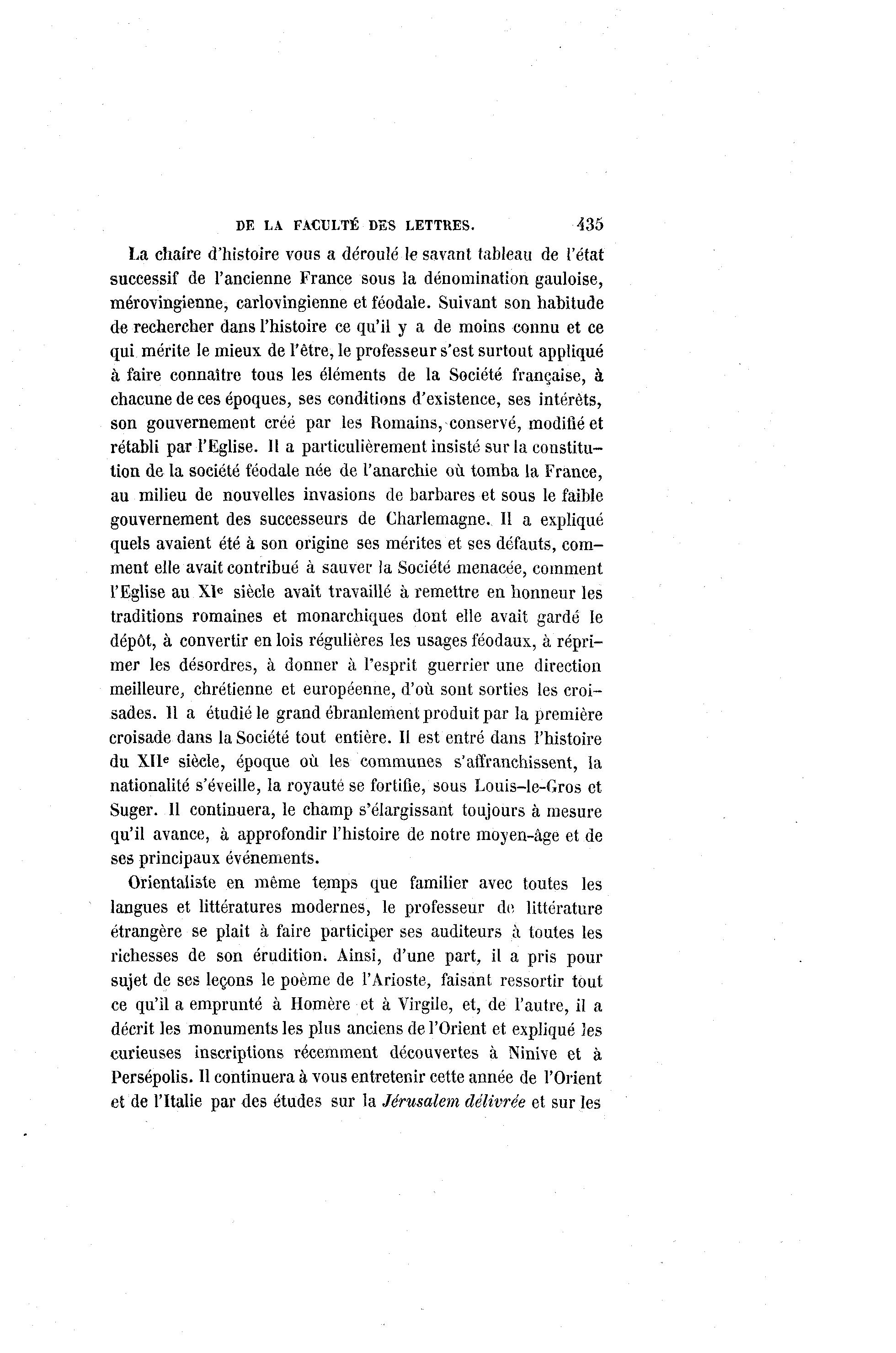 DE LA FACULTÉ DES LETTRES. 435 La chaire d'histoire vous a déroulé le savant tableau de l'état successif de l'ancienne France sous la dénomination gauloise, mérovingienne, carlovingienne et féodale. Suivant son habitude de rechercher dans l'histoire ce qu'il y a de moins connu et ce qui mérite le mieux de l'être, le professeur s'est surtout appliqué à faire connaître tous les éléments de la Société française, à chacune de ces époques, ses conditions d'existence, ses intérêts, son gouvernement eréé par les Romains, conservé, modifié et rétabli par l'Eglise. 11 a particulièrement insisté sur la constitu- tion de la société féodale née de l'anarchie où. tomba la France, au milieu de nouvelles invasions de barbares et sous le faible gouvernement des successeurs de Charlemagne. Il a expliqué quels avaient été à son origine ses mérites et ses défauts, com- ment elle avait contribué à sauver la Société menacée, comment l'Eglise au XIe siècle avait travaillé à remettre en honneur les traditions romaines et monarchiques dont elle avait gardé le dépôt, à convertir en lois régulières les usages féodaux, à répri- mer les désordres, à donner à l'esprit guerrier une direction meilleure, chrétienne et européenne, d'où sont sorties les croi- sades. 11 a étudié le grand ébranlement produit par la première croisade dans la Société tout entière. Il est entré dans l'histoire du XIIe siècle, époque où les communes s'affranchissent, la nationalité s'éveille, la royauté se fortifie, sous Louis-le-Gros et Suger. Il continuera, le champ s'élargissant toujours à mesure qu'il avance, à approfondir l'histoire de notre moyen-âge et de ses principaux événements. Orientaliste en même temps que familier avec toutes les langues et littératures modernes, le professeur de littérature étrangère se plait à faire participer ses auditeurs à toutes les richesses de son érudition. Ainsi, d'une part, il a pris pour sujet de ses leçons le poème de l'Arioste, faisant ressortir tout ce qu'il a emprunté à Homère et à Virgile, et, de l'autre, il a décrit les monuments les plus anciens de l'Orient et expliqué les curieuses inscriptions récemment découvertes à Ninive et à Persépolis. Il continuera à vous entretenir cette année de l'Orient et de l'Italie par des études sur la Jérusalem délivrée et sur les