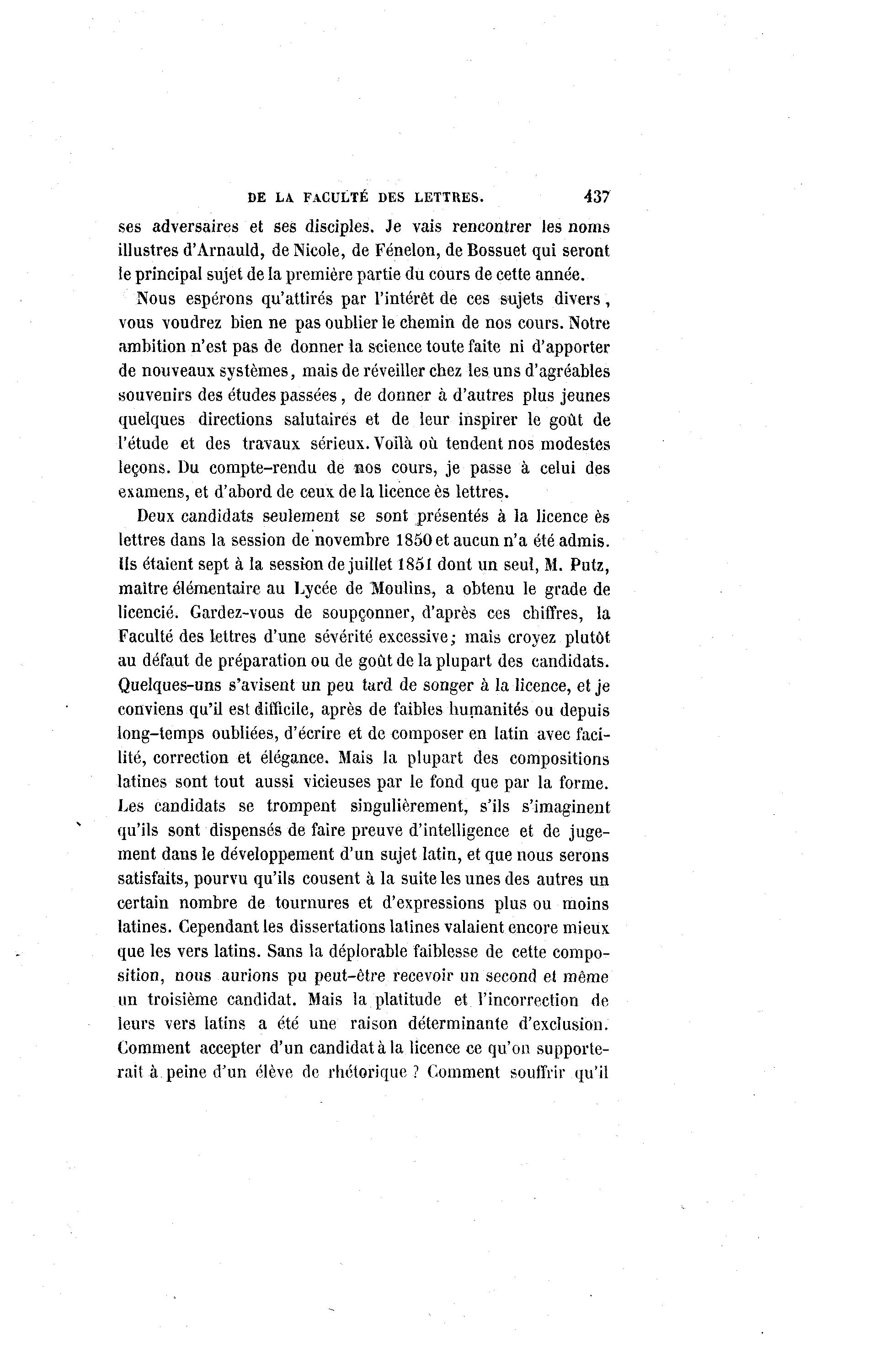 DE LA FACULTÉ DES LETTRES. 437 ses adversaires et ses disciples. Je vais rencontrer les noms illustres d'Arnauld, de Nicole, de Fénelon, de Bossuet qui seront le principal sujet de la première partie du cours de cette année. Nous espérons qu'attirés par l'intérêt de ces sujets divers, vous voudrez bien ne pas oublier le chemin de nos cours. Notre ambition n'est pas de donner la science toute faite ni d'apporter de nouveaux systèmes, mais de réveiller chez les uns d'agréables souvenirs des études passées, de donner à d'autres plus jeunes quelques directions salutaires et de leur inspirer le goût de l'étude et des travaux sérieux. Voilà où tendent nos modestes leçons. Du compte-rendu de «os cours, je passe à celui des examens, et d'abord de ceux de la licence es lettres. Deux candidats seulement se sont présentés à la licence es lettres dans la session de novembre 1850 et aucun n'a été admis. Us étaient sept à la session de juillet 1851 dont un seul, M. Putz, maître élémentaire au Lycée de Moulins, a obtenu le grade de licencié. Gardez-vous de soupçonner, d'après ces chiffres, la Faculté des lettres d'une sévérité excessive; mais croyez plutôt au défaut de préparation ou de goût de la plupart des candidats. Quelques-uns s'avisent un peu tard de songer à la licence, et je conviens qu'il est difficile, après de faibles humanités ou depuis long-temps oubliées, d'écrire et de composer en latin avec faci- lité, correction et élégance. Mais la plupart des compositions latines sont tout aussi vicieuses par le fond que par la forme. Les candidats se trompent singulièrement, s'ils s'imaginent qu'ils sont dispensés de faire preuve d'intelligence et de juge- ment dans le développement d'un sujet latin, et que nous serons satisfaits, pourvu qu'ils cousent à la suite les unes des autres un certain nombre de tournures et d'expressions plus ou moins latines. Cependant les dissertations latines valaient encore mieux que les vers latins. Sans la déplorable faiblesse de cette compo- sition, nous aurions pu peut-être recevoir un second et même un troisième candidat. Mais la platitude et l'incorrection de leurs vers latins a été une raison déterminante d'exclusion. Comment accepter d'un candidat à la licence ce qu'on supporte- rait à peine d'un élève de rhétorique? Comment souffrir qu'il