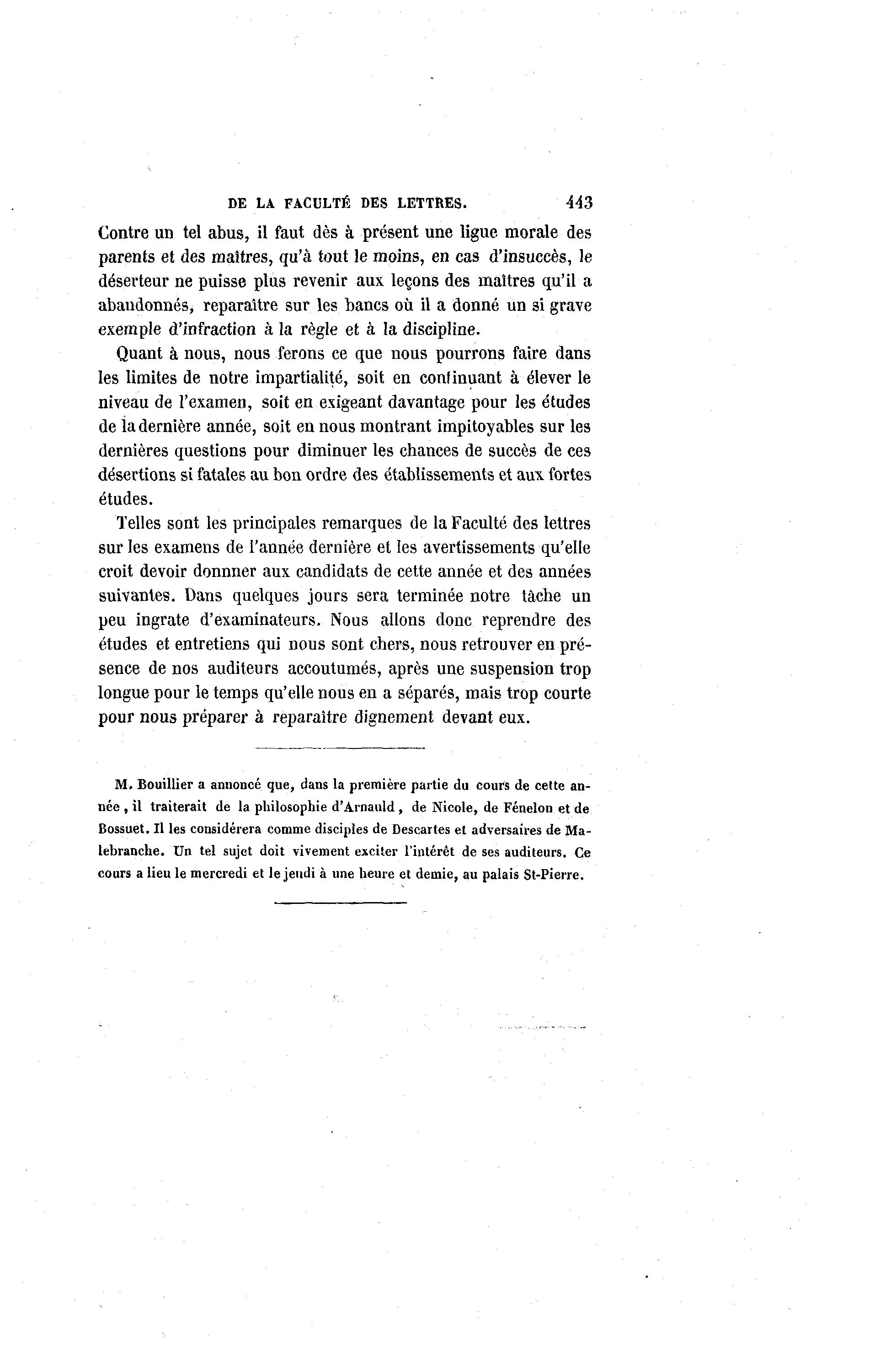 DE LA FACULTÉ DES LETTRES. 443 Contre un tel abus, il faut dès à présent une ligue morale des parents et des maîtres, qu'à tout le moins, en cas d'insuccès, le déserteur ne puisse plus revenir aux leçons des maîtres qu'il a abaudonnés, reparaître sur les bancs où il a donné un 3i grave exemple d'infraction à la règle et à la discipline. Quant à nous, nous ferons ce que nous pourrons faire dans les limites de notre impartialité, soit en continuant à élever le niveau de l'examen, soit en exigeant davantage pour les études de ia dernière année, soit en nous montrant impitoyables sur les dernières questions pour diminuer les chances de succès de ces désertions si fatales au bon ordre des établissements et aux fortes études. Telles sont les principales remarques de la Faculté des lettres sur les examens de l'année dernière et les avertissements qu'elle croit devoir donnner aux candidats de cette année et des années suivantes. Dans quelques jours sera terminée notre tâche un peu ingrate d'examinateurs. Nous allons donc reprendre des études et entretiens qui nous sont chers, nous retrouver en pré- sence de nos auditeurs accoutumés, après une suspension trop longue pour le temps qu'elle nous en a séparés, mais trop courte pour nous préparer à reparaître dignement devant eux. M. Bouillier a annoncé que, dans la première partie du cours de celte an- née , il traiterait de la philosophie d'Arnauld , de Nicole, de Fénelon et de Bossuet. Il les considérera comme disciples de Descartes et adversaires de Ma- lebranche. Un tel sujet doit vivement exciter l'intérêt de ses auditeurs. Ce cours a lieu le mercredi et le jeudi à une heure et demie, au palais St-Pierre.