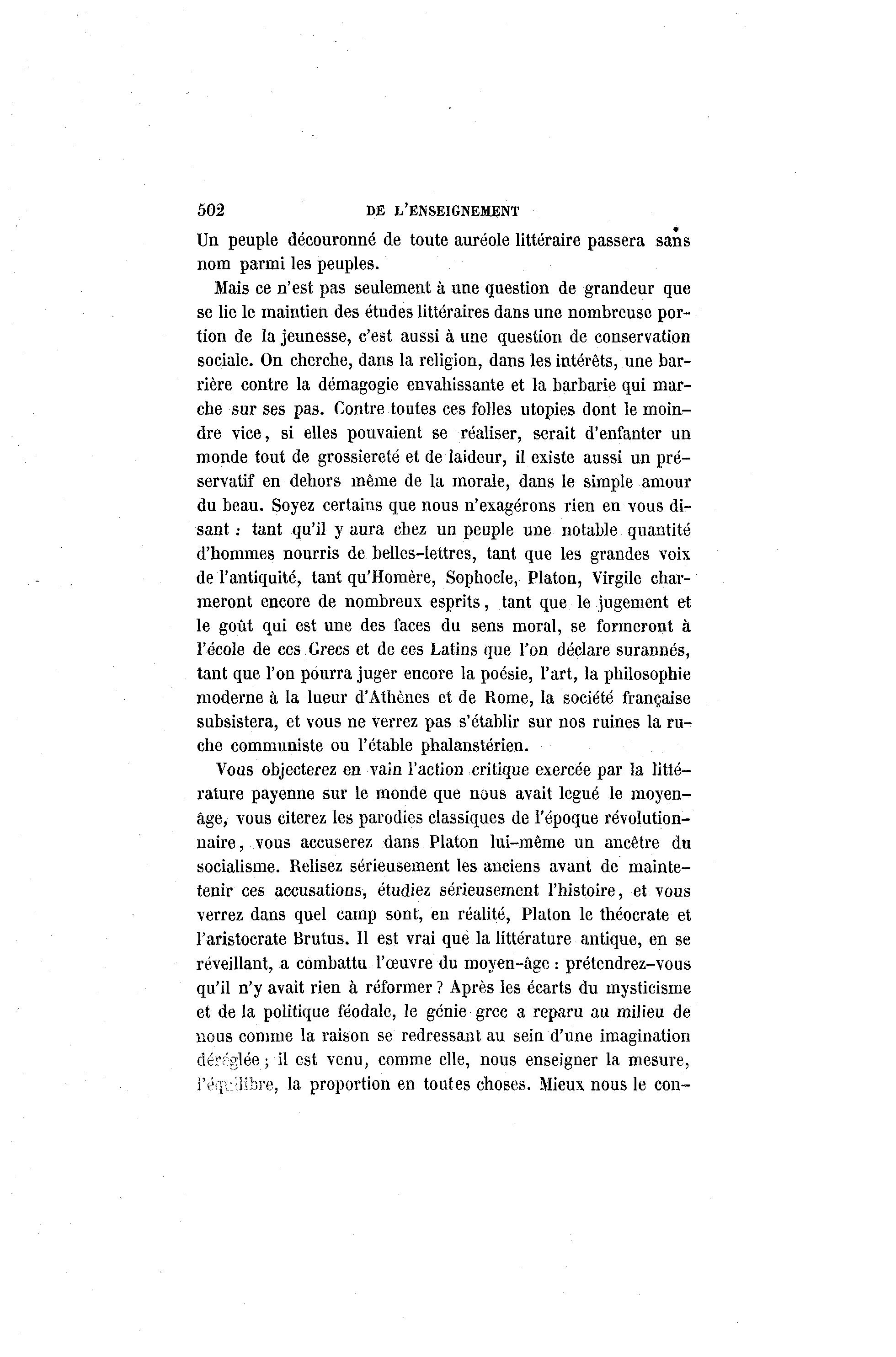502 DE L'ENSEIGNEMENT Un peuple découronné de toute auréole littéraire passera sans nom parmi les peuples. Mais ce n'est pas seulement à une question de grandeur que se lie le maintien des études littéraires dans une nombreuse por- tion de la jeunesse, c'est aussi à une question de conservation sociale. On cherche, dans la religion, dans les intérêts, une bar- rière contre la démagogie envahissante et la barbarie qui mar- che sur ses pas. Contre toutes ces folles utopies dont le moin- dre vice, si elles pouvaient se réaliser, serait d'enfanter un monde tout de grossièreté et de laideur, il existe aussi un pré- servatif en dehors même de la morale, dans le simple amour du beau. Soyez certains que nous n'exagérons rien en vous di- sant .- tant qu'il y aura chez un peuple une notable quantité d'hommes nourris de belles-lettres, tant que les grandes voix de l'antiquité, tant qu'Homère, Sophocle, Platon, Virgile char- meront encore de nombreux esprits, tant que le jugement et le goût qui est une des faces du sens moral, se formeront à l'école de ces Grecs et de ces Latins que l'on déclare surannés, tant que l'on pourra juger encore la poésie, l'art, la philosophie moderne à la lueur d'Athènes et de Rome, la société française subsistera, et vous ne verrez pas s'établir sur nos ruines la ru- che communiste ou l'étable phalanstérien. Vous objecterez en vain l'action critique exercée par la litté- rature payenne sur le monde que nous avait légué le moyen- âge, vous citerez les parodies classiques de l'époque révolution- naire, vous accuserez dans Platon lui-même un ancêtre du socialisme. Relisez sérieusement les anciens avant de mainte- tenir ces accusations, étudiez sérieusement l'histoire, et vous verrez dans quel camp sont, en réalité, Platon le theocrate et l'aristocrate Brutus. 11 est vrai que la littérature antique, en se réveillant, a combattu l'œuvre du moyen-âge : prétendrez-vous qu'il n'y avait rien à réformer ? Après les écarts du mysticisme et de la politique féodale, le génie grec a reparu au milieu de nous comme la raison se redressant au sein d'une imagination déréglée; il est venu, comme elle, nous enseigner la mesure, l'éqr-libre, la proportion en toutes choses. Mieux nous le con-