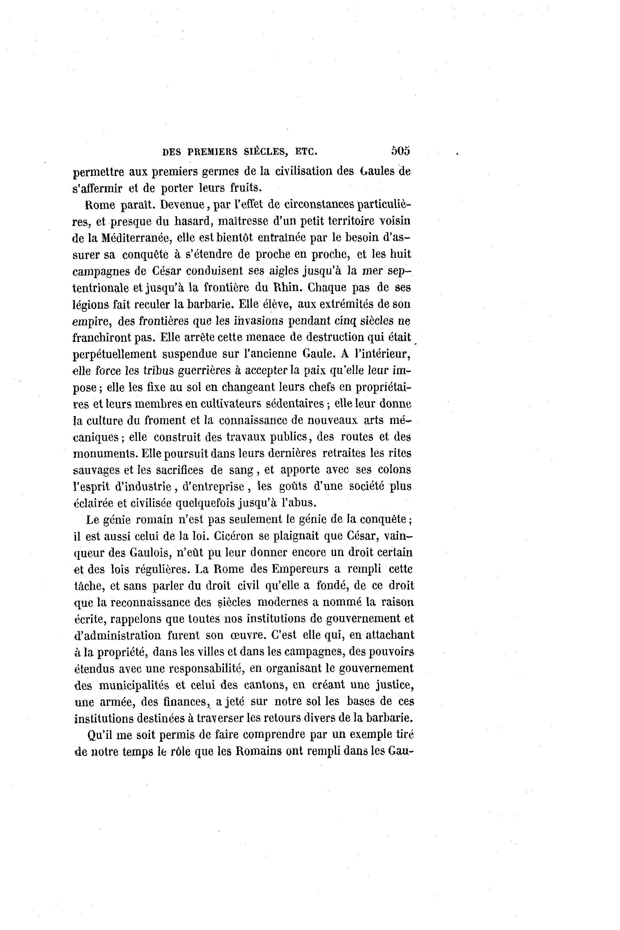 DES PREMIERS SIÈCLES, ETC. 505 permettre aux premiers germes de la civilisation des Gaules de s'affermir et de porter leurs fruits. Rome parait. Devenue, par l'effet de circonstances particuliè- res, et presque du hasard, maîtresse d'un petit territoire voisin de la Méditerranée, elle est bientôt entraînée par le besoin d'as- surer sa conquête à s'étendre de proche en proche, et les huit campagnes de César conduisent ses aigles jusqu'à la mer sep- tentrionale et jusqu'à la frontière du Rhin. Chaque pas de ses légions fait reculer la barbarie. Elle élève, aux extrémités de son empire, des frontières que les invasions pendant cinq siècles ne franchiront pas. Elle arrête cette menace de destruction qui était perpétuellement suspendue sur l'ancienne Gaule. A l'intérieur, elle force les tribus guerrières à accepter la paix qu'elle leur im- pose ; elle les fixe au sol en changeant leurs chefs en propriétai- res et leurs membres en cultivateurs sédentaires ; elle leur donne la culture du froment et la connaissance de nouveaux arts mé- caniques ; elle construit des travaux publics, des routes et des monuments. Elle poursuit dans leurs dernières retraites les rites sauvages et les sacrifices de sang, et apporte avec ses colons l'esprit d'industrie, d'entreprise, les goûts d'une société plus éclairée et civilisée quelquefois jusqu'à l'abus. Le génie romain n'est pas seulement le génie de la conquête ; il est aussi celui de la loi. Cicéron se plaignait que César, vain- queur des Gaulois, n'eût pu leur donner encore un droit certain et des lois régulières. La Rome des Empereurs a rempli cette tâche, et sans parler du droit civil qu'elle a fondé, de ce droit que la reconnaissance des siècles modernes a nommé la raison écrite, rappelons que toutes nos institutions de gouvernement et d'administration furent son œuvre. C'est elle qui, en attachant à la propriété, dans les villes et dans les campagnes, des pouvoirs étendus avec une responsabilité, en organisant le gouvernement des municipalités et celui des cantons, en créant une justice, une armée, des finances, a jeté sur notre sol les bases de ces institutions destinées à traverser les retours divers de la barbarie. Qu'il me soit permis de faire comprendre par un exemple tiré de notre temps le rôle que les Romains ont rempli dans les Gau-
