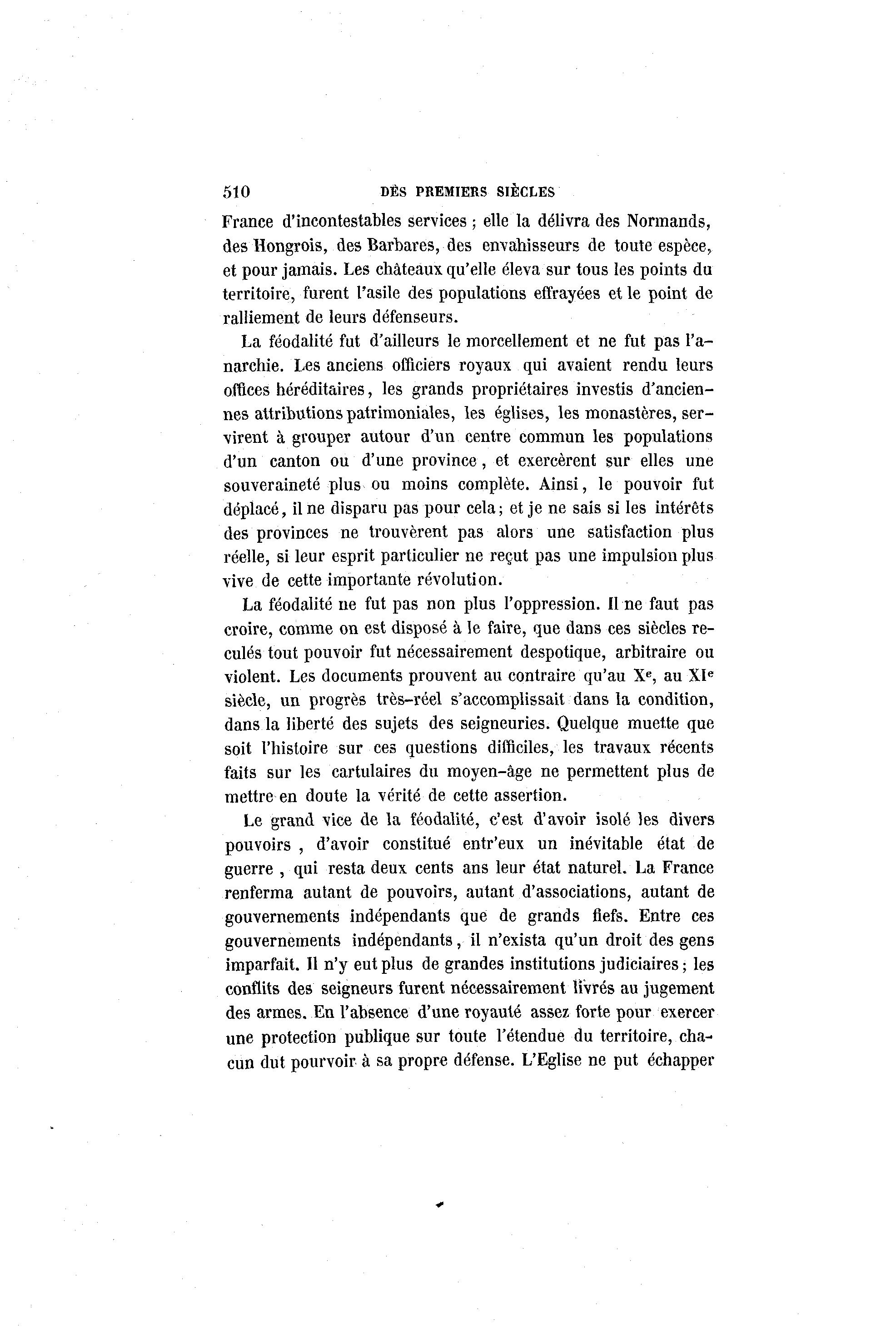 510 DES PREMIERS SIÈCLES France d'incontestables services ; elle la délivra des Normands, des Hongrois, des Barbares, des envahisseurs de toute espèce, et pour jamais. Les châteaux qu'elle éleva sur tous les points du territoire, furent l'asile des populations effrayées et le point de ralliement de leurs défenseurs. La féodalité fut d'ailleurs le morcellement et ne fut pas l'a- narchie. Les anciens officiers royaux qui avaient rendu leurs offices héréditaires, les grands propriétaires investis d'ancien- nes attributions patrimoniales, les églises, les monastères, ser- virent à grouper autour d'un centre commun les populations d'un canton ou d'une province, et exercèrent sur elles une souveraineté plus ou moins complète. Ainsi, le pouvoir fut déplacé, il ne disparu pas pour cela; et je ne sais si les intérêts des provinces ne trouvèrent pas alors une satisfaction plus réelle, si leur esprit particulier ne reçut pas une impulsion plus vive de cette importante révolution. La féodalité ne fut pas non plus l'oppression. Il ne faut pas croire, comme on est disposé à le faire, que dans ces siècles re- culés tout pouvoir fut nécessairement despotique, arbitraire ou violent. Les documents prouvent au contraire qu'au Xe, au XIe siècle, un progrès très-réel s'accomplissait dans la condition, dans la liberté des sujets des seigneuries. Quelque muette que soit l'histoire sur ces questions difficiles, les travaux récents faits sur les cartulaires du moyen-âge ne permettent plus de mettre en doute la vérité de cette assertion. Le grand vice de la féodalité, c'est d'avoir isolé les divers pouvoirs , d'avoir constitué entr'eux un inévitable état de guerre , qui resta deux cents ans leur état naturel. La France renferma autant de pouvoirs, autant d'associations, autant de gouvernements indépendants que de grands fiefs. Entre ces gouvernements indépendants, il n'exista qu'un droit des gens imparfait. Il n'y eut plus de grandes institutions judiciaires ; les conflits des seigneurs furent nécessairement livrés au jugement des armes. En l'absence d'une royauté assez forte pour exercer une protection publique sur toute l'étendue du territoire, cha- cun dut pourvoir à sa propre défense. L'Eglise ne put échapper