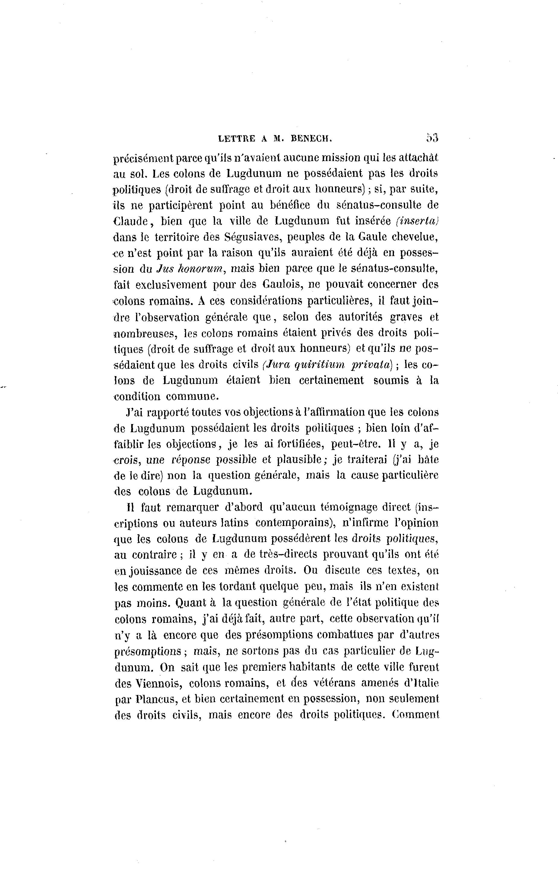 LETTRE A M. BENECH. o3 précisément parce qu'ils n'avaient aucune mission qui les attachât au sol. Les colons de Lugdunum ne possédaient pas les droits politiques (droit de suffrage et droit aux honneurs) ; si, par suite, ils ne participèrent point au bénéfice du sénatus-consulte de Claude, bien que la ville de Lugdunum fut insérée (inserta) dans le territoire des Ségusiaves, peuples de la Gaule chevelue, •ce n'est point par la raison qu'ils auraient été déjà en posses- sion du Jus honorum, mais bien parce que le sénatus-consulte, t'ait exclusivement pour des Gaulois, ne pouvait concerner des •colons romains. A ces considérations particulières, il faut join- dre l'observation générale que, selon des autorités graves et nombreuses, les colons romains étaient privés des droits poli- tiques (droit de suffrage et droit aux honneurs) et qu'ils ne pos- sédaient que les droits civils (Jura quiritium privata) ; les co- lons de Lugdunum étaient bien certainement soumis à la condition commune. J'ai rapporté toutes vos objections à l'affirmation que les colons de Lugdunum possédaient les droits politiques ; bien loin d'af- faiblir les objections, je les ai fortifiées, peut-être. Il y a, je crois, une réponse possible et plausible; je traiterai (j'ai hâte de le dire) non la question générale, mais la cause particulière des colons de Lugdunum. Il faut remarquer d'abord qu'aucun témoignage direct (ins- criptions ou auteurs latins contemporains), n'infirme l'opinion que les colons de Lugdunum possédèrent les droits politiques, au contraire ; il y en a de très-directs prouvant qu'ils ont été en jouissance de ces mômes droits. Ou discute ces textes, on les commente en les tordant quelque peu, mais ils n'en existent pas moins. Quant à la question générale de l'état politique des colons romains, j'ai déjà fait, autre part, cette observation qu'il n'y a là encore que des présomptions combattues par d'autres présomptions ; mais, ne sortons pas du cas particulier de Lug- dunum. On sait que les premiers habitants de cette ville furent des Viennois, colons romains, et des vétérans amenés d'Italie par Plancus, et bien certainement en possession, non seulement des droits civils, mais encore des droits politiques. Comment