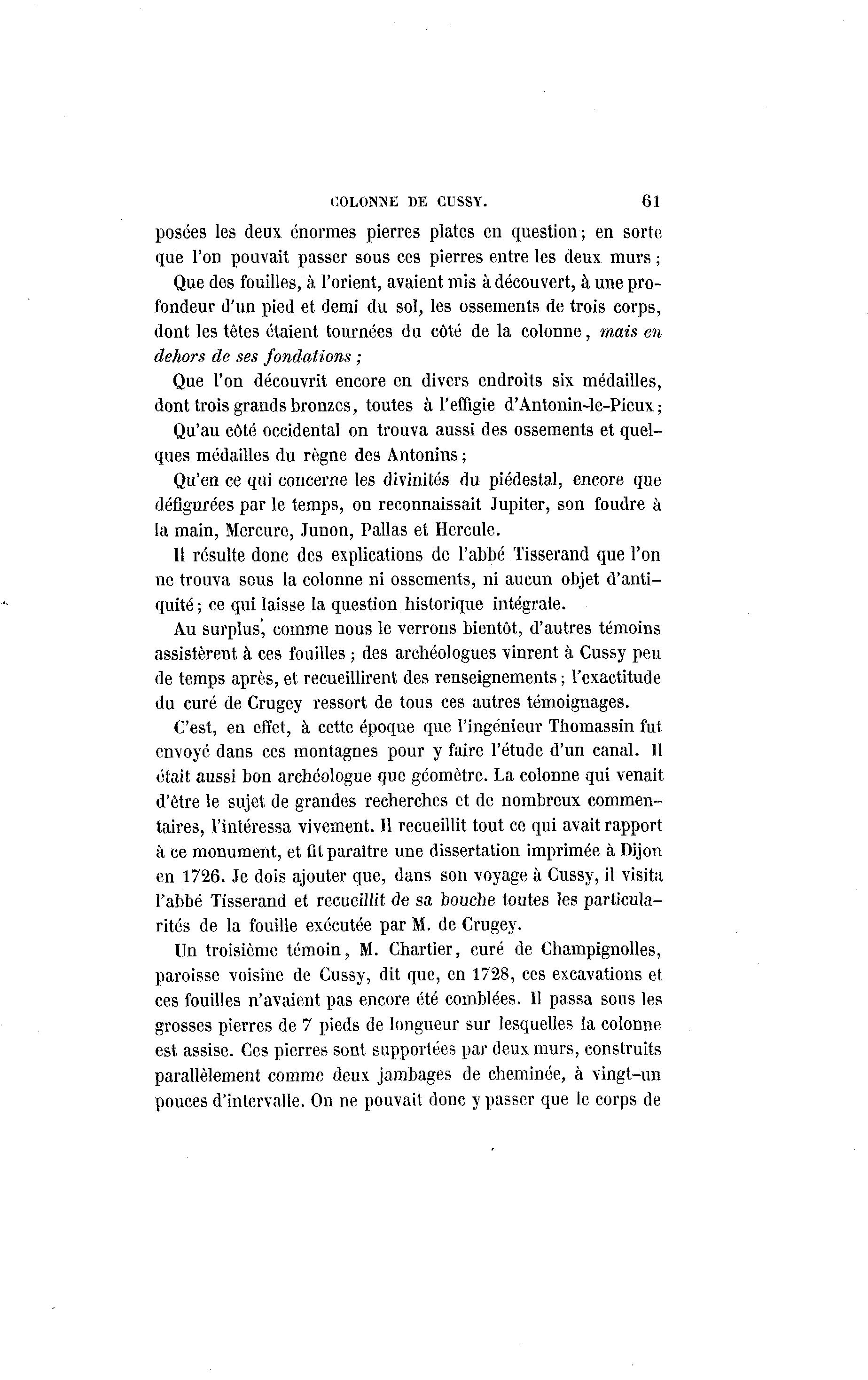 COLONNE DE CUSSY. 61 posées les deux énormes pierres plates en question; en sorte que l'on pouvait passer sous ces pierres entre les deux murs ; Que des fouilles, à l'orient, avaient mis à découvert, à une pro- fondeur d'un pied et demi du sol, les ossements de trois corps, dont les têtes étaient tournées du côté de la colonne, mais en dehors de ses fondations ; Que l'on découvrit encore en divers endroits six médailles, dont trois grands bronzes, toutes à l'effigie d'Antonin-le-Pieux ; Qu'au côté occidental on trouva aussi des ossements et quel- ques médailles du règne des Antonins ; Qu'en ce qui concerne les divinités du piédestal, encore que défigurées par le temps, on reconnaissait Jupiter, son foudre à la main, Mercure, Junon, Pallas et Hercule. 11 résulte donc des explications de l'abbé Tisserand que l'on ne trouva sous la colonne ni ossements, ni aucun objet d'anti- quité ; ce qui laisse la question historique intégrale. Au surplus, comme nous le verrons bientôt, d'autres témoins assistèrent à ces fouilles ; des archéologues vinrent à Cussy peu de temps après, et recueillirent des renseignements ; l'exactitude du curé de Crugey ressort de tous ces autres témoignages. C'est, en effet, à cette époque que l'ingénieur Thomassin fut envoyé dans ces montagnes pour y faire l'étude d'un canal. 11 était aussi bon archéologue que géomètre. La colonne qui venait d'être le sujet de grandes recherches et de nombreux commen- taires, l'intéressa vivement. Il recueillit tout ce qui avait rapport à ce monument, et fit paraître une dissertation imprimée à Dijon en 1726. Je dois ajouter que, dans son voyage à Cussy, il visita l'abbé Tisserand et recueillit de sa bouche toutes les particula- rités de la fouille exécutée par M. de Crugey. Un troisième témoin, M. Chartier, curé de Champignolles, paroisse voisine de Cussy, dit que, en 1728, ces excavations et ces fouilles n'avaient pas encore été comblées. Il passa sous les grosses pierres de 7 pieds de longueur sur lesquelles la colonne est assise. Ces pierres sont supportées par deux murs, construits parallèlement comme deux jambages de cheminée, à vingt-un pouces d'intervalle. On ne pouvait donc y passer que le corps de