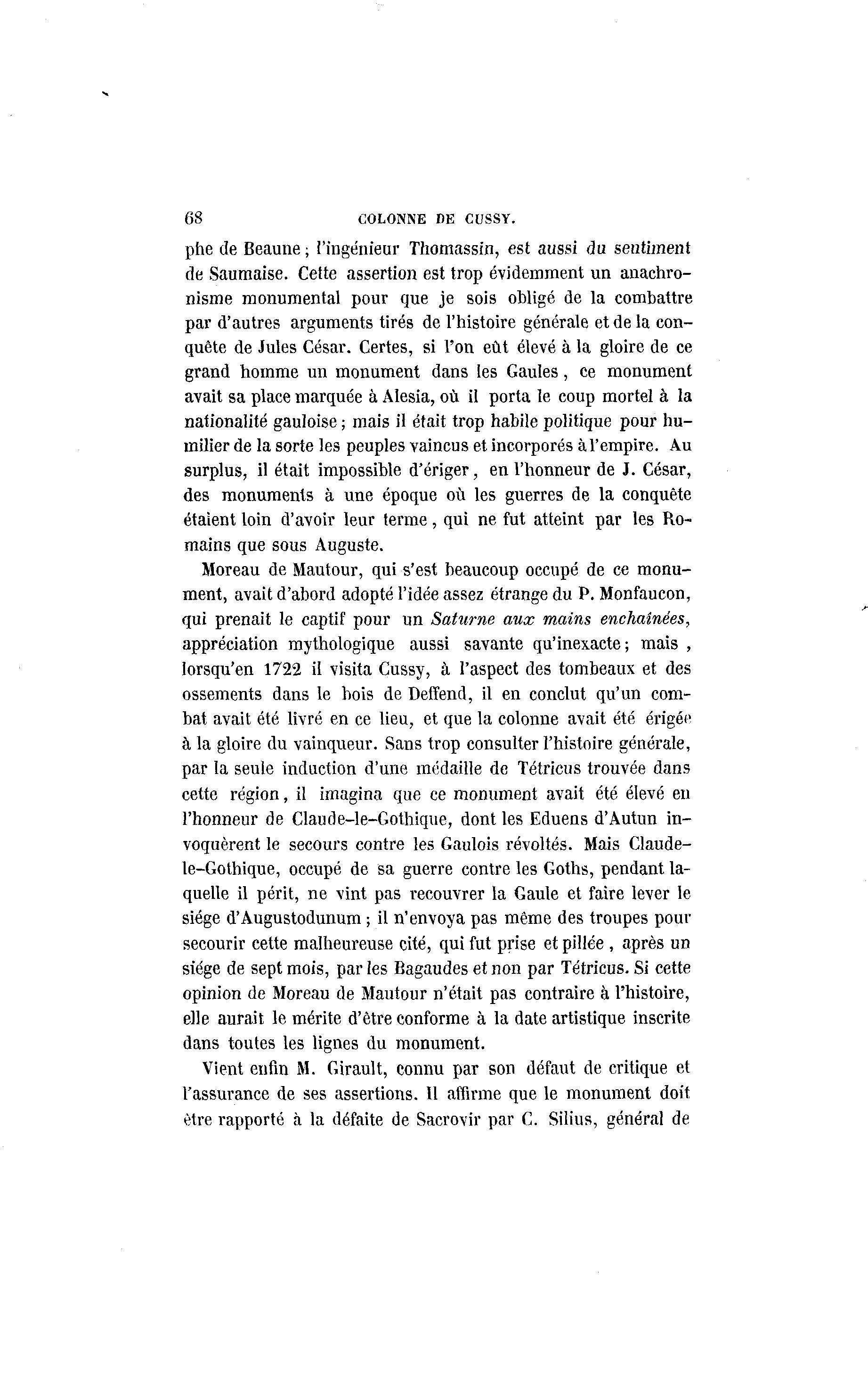 68 COLONNE BE CUSSY. phe de Beaune ; l'ingénieur Thomassin, est aussi du sentiment de Saumaise. Cette assertion est trop évidemment un anachro- nisme monumental pour que je sois obligé de la combattre par d'autres arguments tirés de l'histoire générale et de la con- quête de Jules César. Certes, si l'on eût élevé à la gloire de ce grand homme un monument dans les Gaules, ce monument avait sa place marquée à Alesia, où il porta le coup mortel à la nationalité gauloise ; mais il était trop habile politique pour hu- milier de la sorte les peuples vaincus et incorporés à l'empire. Au surplus, il était impossible d'ériger, en l'honneur de J. César, des monuments à une époque où les guerres de la conquête étaient loin d'avoir leur terme, qui ne fut atteint par les Ro- mains que sous Auguste. Moreau de Mautour, qui s'est beaucoup occupé de ce monu- ment, avait d'abord adopté l'idée assez étrange du P. Monfaucon, qui prenait le captif pour un Saturne aux mains enchaînées, appréciation mythologique aussi savante qu'inexacte; mais , lorsqu'en 1722 il visita Cussy, à l'aspect des tombeaux et des ossements dans le bois de Deffend, il en conclut qu'un com- bat avait été livré en ce lieu, et que la colonne avait été érigée à la gloire du vainqueur. Sans trop consulter l'histoire générale, par la seule induction d'une médaille de Tétricus trouvée dans cette région, il imagina que ce monument avait été élevé en l'honneur de Claude-le-Gothique, dont les Eduens d'Autun in- voquèrent le secours contre les Gaulois révoltés. Mais Claude- le-Gothique, occupé de sa guerre contre les Goths, pendant la- quelle il périt, ne vint pas recouvrer la Gaule et faire lever le siège d'Augustodunum ; il n'envoya pas même des troupes pour secourir cette malheureuse cité, qui fut prise et pillée , après un siège de sept mois, par les Bagaudes et non par Tétricus. Si cette opinion de Moreau de Mautour n'était pas contraire à l'histoire, elle aurait le mérite d'être conforme à la date artistique inscrite dans toutes les lignes du monument. Vient enfin M. Girault, connu par son défaut de critique et l'assurance de ses assertions. Il affirme que le monument doit être rapporté à la défaite de Sacrovir par C. Silius, général de