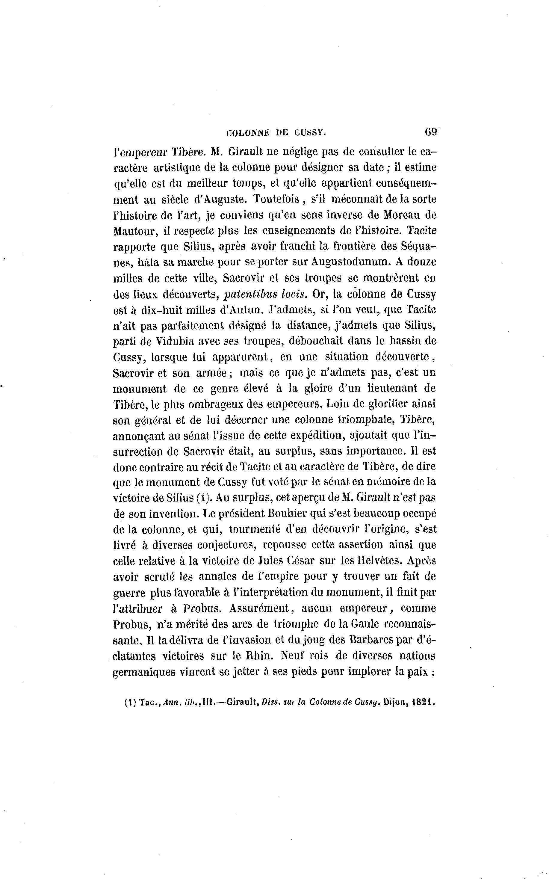 COLONNE DE CUSSY. 69 l'empereur Tibère. M. Girault ne néglige pas de consulter le ca- ractère artistique de la colonne pour désigner sa date ; il estime qu'elle est du meilleur temps, et qu'elle appartient conséquem- ment au siècle d'Auguste. Toutefois , s'il méconnaît de la sorte l'histoire de l'art, je conviens qu'en sens inverse de Moreau de Mautour, il respecte plus les enseignements de l'histoire. Tacite rapporte que Silius, après avoir franchi la frontière des Séqua- nes, hâta sa marche pour se porter sur Augustodunum. A douze milles de cette ville, Sacrovir et ses troupes se montrèrent en des lieux découverts, patentibws locis. Or, la colonne de Cussy est à dix-huit milles d'Autun. J'admets, si l'on veut, que Tacite n'ait pas parfaitement désigné la distance, j'admets que Silius, parti de Vidubia avec ses troupes, débouchait dans le bassin de Cussy, lorsque lui apparurent, en une situation découverte, Sacrovir et son armée ; mais ce que je n'admets pas, c'est un monument de ce genre élevé à la gloire d'un lieutenant de Tibère, le plus ombrageux des empereurs. Loin de glorifier ainsi son général et de lui décerner une colonne triomphale, Tibère, annonçant au sénat l'issue de cette expédition, ajoutait que l'in- surrection de Sacrovir était, au surplus, sans importance. Il est donc contraire au récit de Tacite et au caractère de Tibère, de dire que le monument de Cussy fut voté par le sénat en mémoire de la victoire de Silius (1). Au surplus, cet aperçu de M. Girault n'est pas de son invention. Le président Bouhier qui s'est beaucoup occupé de la colonne, et qui, tourmenté d'en découvrir l'origine, s'est livré à diverses conjectures, repousse cette assertion ainsi que celle relative à la victoire de Jules César sur les Helvètes. Après avoir scruté les annales de l'empire pour y trouver un fait de guerre plus favorable à l'interprétation du monument, il finit par l'attribuer à Probus. Assurément, aucun empereur, comme Probus, n'a mérité des arcs de triomphe de la Gaule reconnais- sante. Il la délivra de l'invasion et du joug des Barbares par d'é- clatantes victoires sur le Rhin. Neuf rois de diverses nations germaniques vinrent se jetter à ses pieds pour implorer la paix ; (1) "îà C.,Ânn. Iib.,\n.—Girault, Diss. sur la Colonne de Cussy. Dijon, 1821.