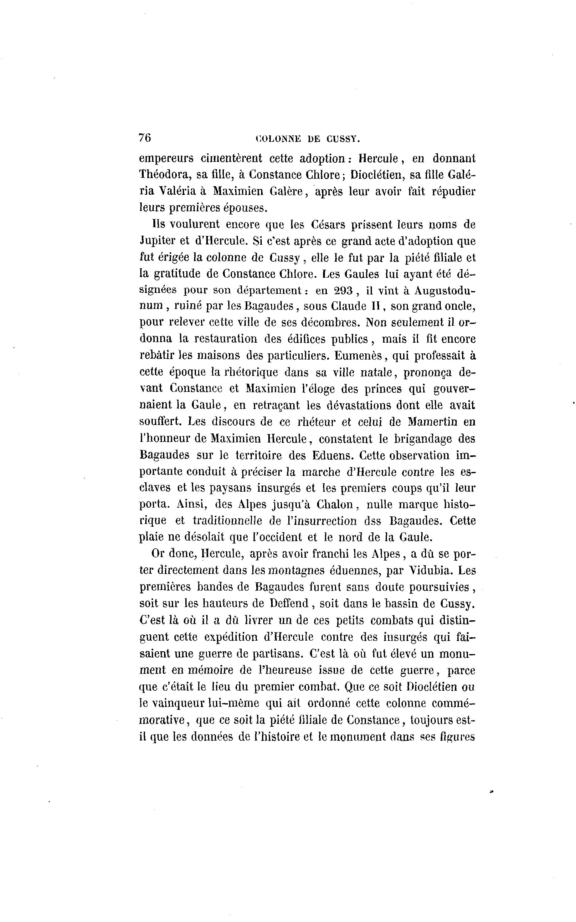76 OOLOMNE DE CUSSY. empereurs cimentèrent cette adoption.- Hercule, en donnant Théodora, sa fille, à Constance Chlore ; Dioclétien, sa fille Galé- ria Valéria à Maximien Galère, après leur avoir fait répudier leurs premières épouses. Ils voulurent encore que les Césars prissent leurs noms de Jupiter et d'Hercule. Si c'est après ce grand acte d'adoption que fut érigée la colonne de Cussy, elle le fut par la piété filiale et la gratitude de Constance Chlore. Les Gaules lui ayant été dé- signées pour son département : en 293 , il vint à Augustodu- num , ruiné par les Bagaudes, sous Claude II, son grand oncle, pour relever cette ville de ses décombres. Non seulement il or- donna la restauration des édifices publics, mais il fit encore rebâtir les maisons des particuliers. Eumenès, qui professait à cette époque la rhétorique dans sa ville natale, prononça de- vant Constance et Maximien l'éloge des princes qui gouver- naient la Gaule, en retraçant les dévastations dont elle avait souffert. Les discours de ce rhéteur et celui de Mamertin en l'honneur de Maximien Hercule, constatent le brigandage des Bagaudes sur le territoire des Eduens. Cette observation im- portante conduit à préciser la marche d'Hercule contre les es- claves et les paysans insurgés et les premiers coups qu'il leur porta. Ainsi, des Alpes jusqu'à Chalon, nulle marque histo- rique et traditionnelle de l'insurrection dss Bagaudes. Cette plaie ne désolait que l'occident et le nord de la Gaule. Or donc, Hercule, après avoir franchi les Alpes, a dû se por- ter directement dans les montagnes eduennes, par Vidubia. Les premières bandes de Bagaudes furent sans doute poursuivies, soit sur les hauteurs de Deffend , soit dans le bassin de Cussy. C'est là où il a dû livrer un de ces petits combats qui distin- guent cette expédition d'Hercule contre des insurgés qui fai- saient une guerre de partisans. C'est là où fut élevé un monu- ment en mémoire de l'heureuse issue de cette guerre, parce que c'était le lieu du premier combat. Que ce soit Dioclétien ou le vainqueur lui-même qui ait ordonné cette colonne commé- morative, que ce soit la piété filiale de Constance, toujours est- il que les données de l'histoire et le monument dans ses figures