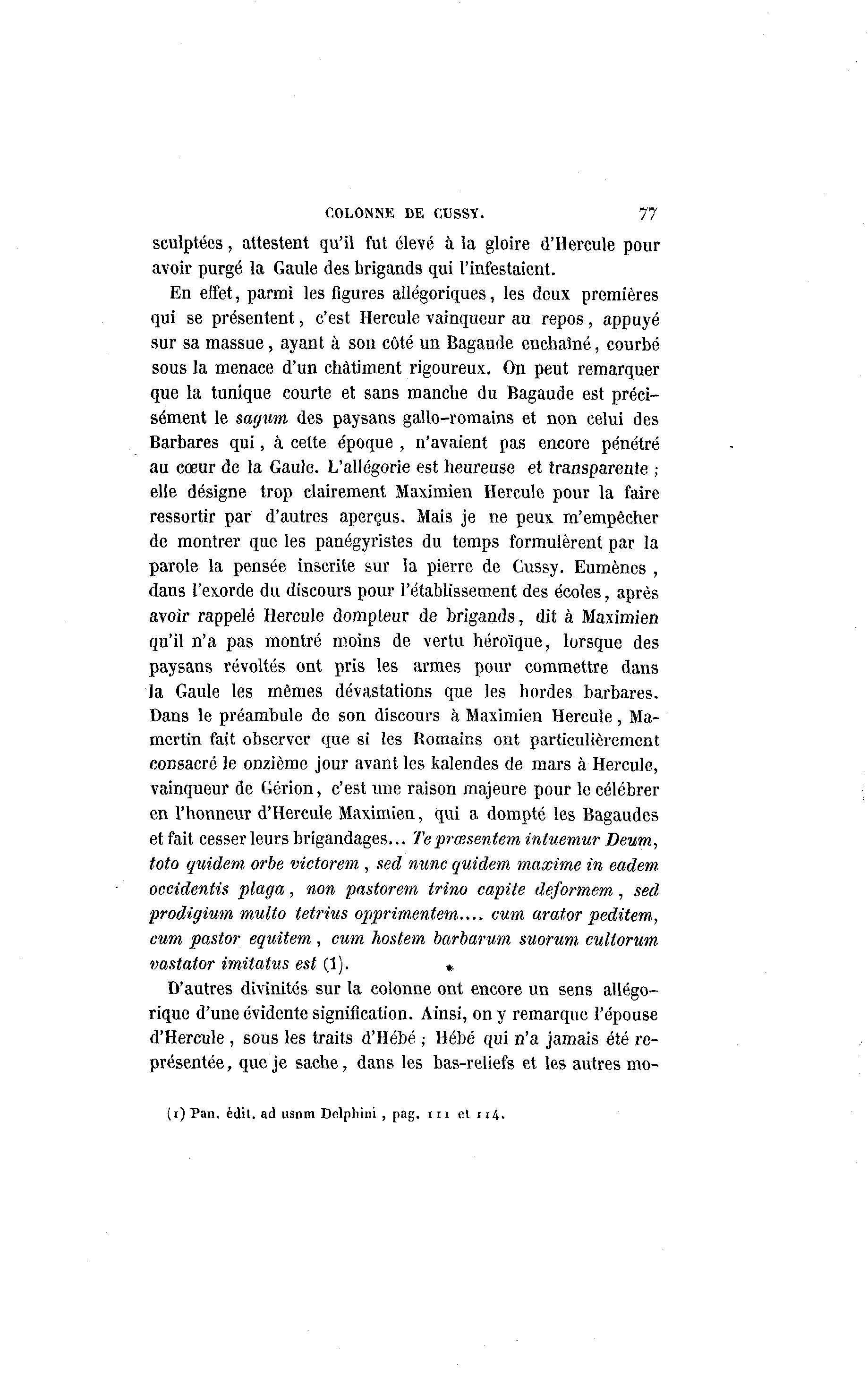COLONNE DE CUSSY. 77 sculptées, attestent qu'il fut élevé à la gloire d'Hercule pour avoir purgé la Gaule des brigands qui l'infestaient. En effet, parmi les figures allégoriques, les deux premières qui se présentent, c'est Hercule vainqueur au repos, appuyé sur sa massue, ayant à son côté un Bagaude enchaîné, courbé sous la menace d'un châtiment rigoureux. On peut remarquer que la tunique courte et sans manche du Bagaude est préci- sément le sagwm des paysans gallo-romains et non celui des Barbares qui, à cette époque , n'avaient pas encore pénétré au cœur de la Gaule. L'allégorie est heureuse et transparente ; elle désigne trop clairement Maximien Hercule pour la faire ressortir par d'autres aperçus. Mais je ne peux m'empêcher de montrer que les panégyristes du temps formulèrent par la parole la pensée inscrite sur la pierre de Cussy. Eumènes , dans l'exorde du discours pour l'établissement des écoles, après avoir rappelé Hercule dompteur de brigands, dit à Maximien qu'il n'a pas montré moins de vertu héroïque, lorsque des paysans révoltés ont pris les armes pour commettre dans la Gaule les mêmes dévastations que les hordes barbares. Dans le préambule de son discours à Maximien Hercule, Ma- mertin fait observer que si les Romains ont particulièrement consacré le onzième jour avant les kalendes de mars à Hercule, vainqueur de Gérion, c'est une raison majeure pour le célébrer en l'honneur d'Hercule Maximien, qui a dompté les Bagaudes et fait cesser leurs brigandages... Teprœsentem intuemur Deum, toto quidem orbe victorem , sed nunc quidem maxime in eadem occidentis plaga, non pastorem trino capite deformem, sed prodigium multo tetrius opprimentem cum arator peditem,, cum pastor equitem , cum hostem barbarum suorum cultorum vastator imitatus est (1). * D'autres divinités sur la colonne ont encore un sens allégo- rique d'une évidente signification. Ainsi, on y remarque l'épouse d'Hercule , sous les traits d'Hébé ; Hébé qui n'a jamais été re- présentée , que je sache, dans les bas-reliefs et les autres mo- (r)Pan. édit. ad usnm Delphim , pag. m et 114.