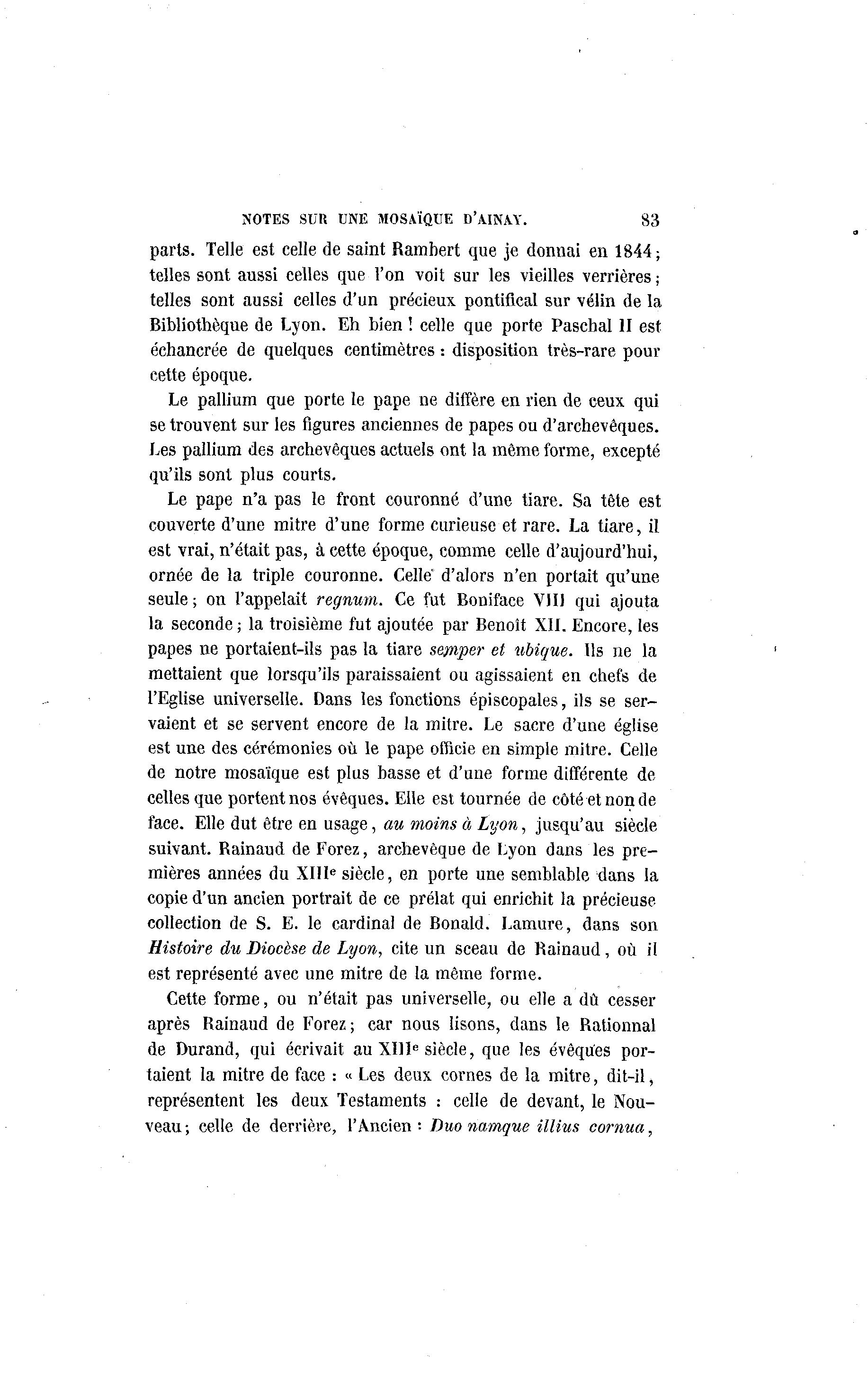 NOTES SUR UNE MOSAÃQUE D'AINAY. 83 parts. Telle est celle de saint Rambert que je donnai en 1844; telles sont aussi celles que l'on voit sur les vieilles verrières ; telles sont aussi celles d'un précieux pontifical sur vélin de la Bibliothèque de Lyon. Eh bien ! celle que porte Paschal II est échancrée de quelques centimètres : disposition très-rare pour cette époque. Le pallium que porte le pape ne diffère en rien de ceux qui se trouvent sur les figures anciennes de papes ou d'archevêques. Les pallium des archevêques actuels ont la même forme, excepté qu'ils sont plus courts. Le pape n'a pas le front couronné d'une tiare. Sa tête est couverte d'une mitre d'une forme curieuse et rare. La tiare, il est vrai, n'était pas, à cette époque, comme celle d'aujourd'hui, ornée de la triple couronne. Celle" d'alors n'en portait qu'une seule ; on l'appelait regnum. Ce fut Boniface VJU qui ajouta la seconde ; la troisième fut ajoutée par Benoit XII. Encore, les papes ne portaient-ils pas la tiare semper et ubique. Us ne la mettaient que lorsqu'ils paraissaient ou agissaient en chefs de l'Eglise universelle. Dans les fonctions épiscopales, ils se ser- vaient et se servent encore de la mitre. Le sacre d'une église est une des cérémonies où le pape officie en simple mitre. Celle de notre mosaïque est plus basse et d'une forme différente de celles que portent nos évoques. Elle est tournée de côté et non de face. Elle dut être en usage, au moins à Lyon, jusqu'au siècle suivant. Rainaud de Forez, archevêque de Lyon dans les pre- mières années du XIIIe siècle, en porte une semblable dans la copie d'un ancien portrait de ce prélat qui enrichit la précieuse collection de S. E. le cardinal de Bonald. Lamure, dans son Histoire du Diocèse de Lyon, cite un sceau de Rainaud, où il est représenté avec une mitre de la même forme. Cette forme, ou n'était pas universelle, ou elle a dû cesser après Rainaud de Forez; car nous lisons, dans le Rationnai de Durand, qui écrivait au XIIIe siècle, que les évêqu'es por- taient la mitre de face : « Les deux cornes de la mitre, dit-il, représentent les deux Testaments : celle de devant, le Nou- veau; celle de derrière, l'Ancien: Duo navigue illius cornua,