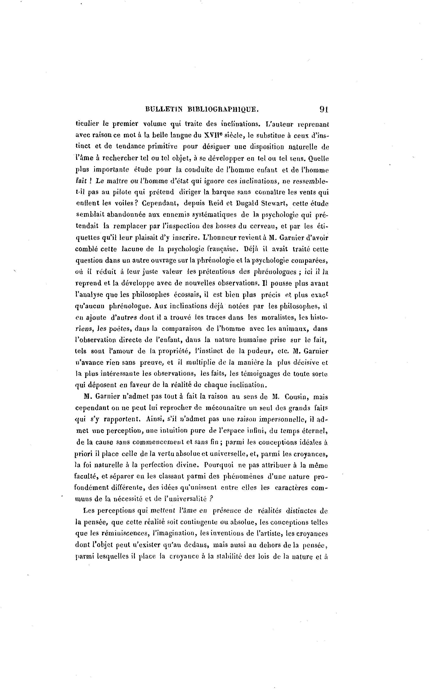 BULLETIN BIBLIOGRAPHIQUE. 91 ticulier le premier volume qui traite des inclinations. I/auteur reprenant avec raison ce mot à la belle langue du XVIIe siècle, le substitue à ceux d'ins- tinct et de tendance primitive pour désiguer une disposition naturelle de l'âme à rechercher tel ou tel objet, à se développer en tel ou tel sens. Quelle plus importante étude pour la conduite de l'homme enfant et de l'homme fait ! Le maître ou l'homme d'état qui ignore ces inclinations, ne ressemble- til pas au pilote qui prétend diriger la barque sans connaître les vents qui entrent les voiles? Cependant, depuis Reid et Dugald Stewart, cette étude semblait abandonnée aux ennemis systématiques de la psychologie qui pré- tendait la remplacer par l'inspection des bosses du cerveau, et par les éti- quettes qu'il leur plaisait d'y inscrire. L'honneur revient à M. Garnier d'avoir comblé celte lacune de la psychologie française. Déjà il avait traité cette question dans un autre ouvrage sur la phrénologie et la psychologie comparées, où il réduit à leur juste valeur les prétentions des phréuologues ; ici i! la reprend et la développe avec de nouvelles observations. Il pousse plus avant l'analyse que les philosophes écossais, il est bien plus précis et plus exact qu'aucun phrénologue. Aux inclinations déjà notées par les philosophes, il en ajoute d'autres dont il a trouvé les traces dans les moralistes, les histo- riens, les poètes, dans la comparaison de l'homme avec les animaux, dans l'observation directe de l'enfant, dans la nature humaine prise sur le fait, lels sont l'amour de la propriété, l'instinct de la pudeur, etc. M. Garnier n'avance rien sans preuve, et il multiplie de la manière la plus décisive et la plus intéressante les observations, les faits, les témoignages de toute sorte qui déposent en faveur de la réalité de chaque inclination. M. Garnier n'admet pas tout à fait la raison au sens de M. Cousin, mais cependant on ne peut lui reprocher de méconnaître un seul des grands faits qui s'y rapportent. Ainsi, s'il n'admet pas une raison impersonnelle, il ad- met une perception, une intuition pure de l'espace infini, du temps éternel, de la cause sans commencement et sans fin ; parmi les conceptions idéales à priori il place celle de la vertu absolue et universelle, et, parmi les croyances, la foi naturelle à la perfection divine. Pourquoi ne pas attribuer à la même faculté, et séparer en les classant parmi des phénomènes d'une nature pro- fondément différente, des idées qu'unissent entre elles les caractères com- muns de la nécessité et de l'universalité ? Les perceptions qui mettent l'âme en présence de réalités distinctes de la pensée, que cette réalité soit contingente ou absolue, les conceptions telles que les réminiscences, l'imagination, les inventions de l'artiste, les croyances dont l'objet peut n'exister qu'au dedans, mais aussi au dehors de la pensée, parmi lesquelles il place la croyance à la stabilité des lois de la nature et Ã