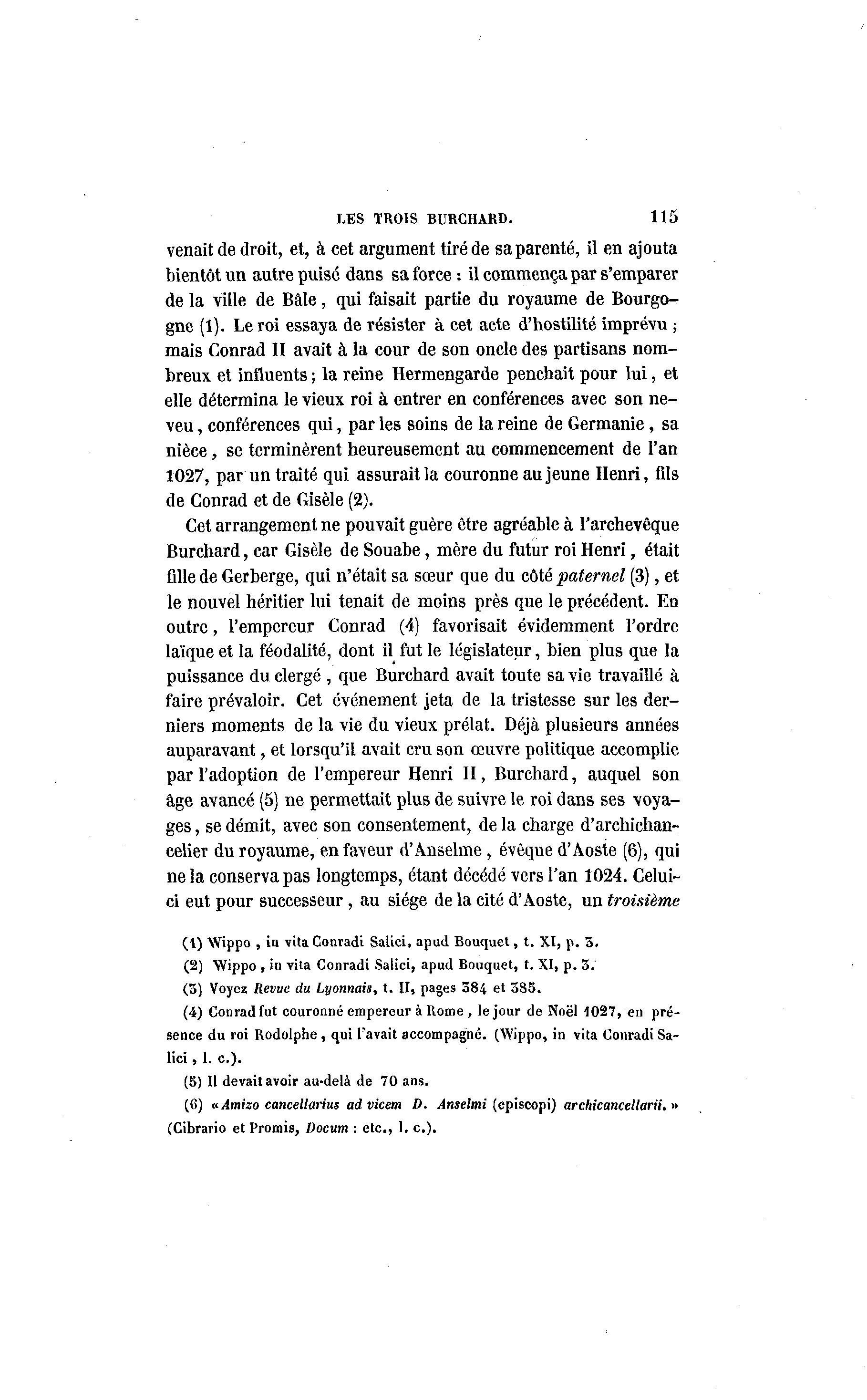 LES TROIS BURCHARD. 115 venait de droit, et, à cet argument tiré de sa parenté, il en ajouta bientôt un autre puisé dans sa force : il commença par s'emparer de la ville de Bâle, qui faisait partie du royaume de Bourgo- gne (1). Le roi essaya de résister à cet acte d'hostilité imprévu ; mais Conrad II avait à la cour de son oncle des partisans nom- breux et influents ; la reine Hermengarde penchait pour lui, et elle détermina le vieux roi à entrer en conférences avec son ne- veu , conférences qui, par les soins de la reine de Germanie, sa nièce, se terminèrent heureusement au commencement de l'an 1027, par un traité qui assurait la couronne au jeune Henri, fils de Conrad et de Gisèle (2). Cet arrangement ne pouvait guère être agréable à l'archevêque Burchard, car Gisèle de Souabe, mère du futur roi Henri, était fille de Gerberge, qui n'était sa sœur que du côté paternel (3), et le nouvel héritier lui tenait de moins près que le précédent. En outre, l'empereur Conrad (4) favorisait évidemment l'ordre laïque et la féodalité, dont il fut le législateur, bien plus que la puissance du clergé , que Burchard avait toute sa vie travaillé à faire prévaloir. Cet événement jeta de la tristesse sur les der- niers moments de la vie du vieux prélat. Déjà plusieurs années auparavant, et lorsqu'il avait cru son œuvre politique accomplie par l'adoption de l'empereur Henri II, Burchard, auquel son âge avancé (5) ne permettait plus de suivre le roi dans ses voya- ges , se démit, avec son consentement, de la charge d'archichan- eelier du royaume, en faveur d'Anselme, évoque d'Aoste (6), qui ne la conserva pas longtemps, étant décédé vers l'an 1024. Celui- ci eut pour successeur, au siège de la cité d'Aoste, un troisième (1) Wippo , iu vita Conradi Salici, apud Bouquet, t. XI, p. 3 . (2) Wippo , in vita Conradi Salici, apud Bouquet, t. XI, p. 3. (5) Voyez Revue du Lyonnais, t. II, pages 584 et 585. (4) Conrad fut couronné empereur à Rome , le jour de Noël 1027, en pré- sence du roi Rodolphe , qui l'avait accompagné. (Wippo, in vita Conradi Sa- lici , 1. c ) . (5) Il devait avoir au-delà de 70 ans. (6) « Amizo cancellarius ad vicem D. Anselmi (episcopi) archkancellarii, » (Cibrario et Promis, Docum : etc., 1. c ) .