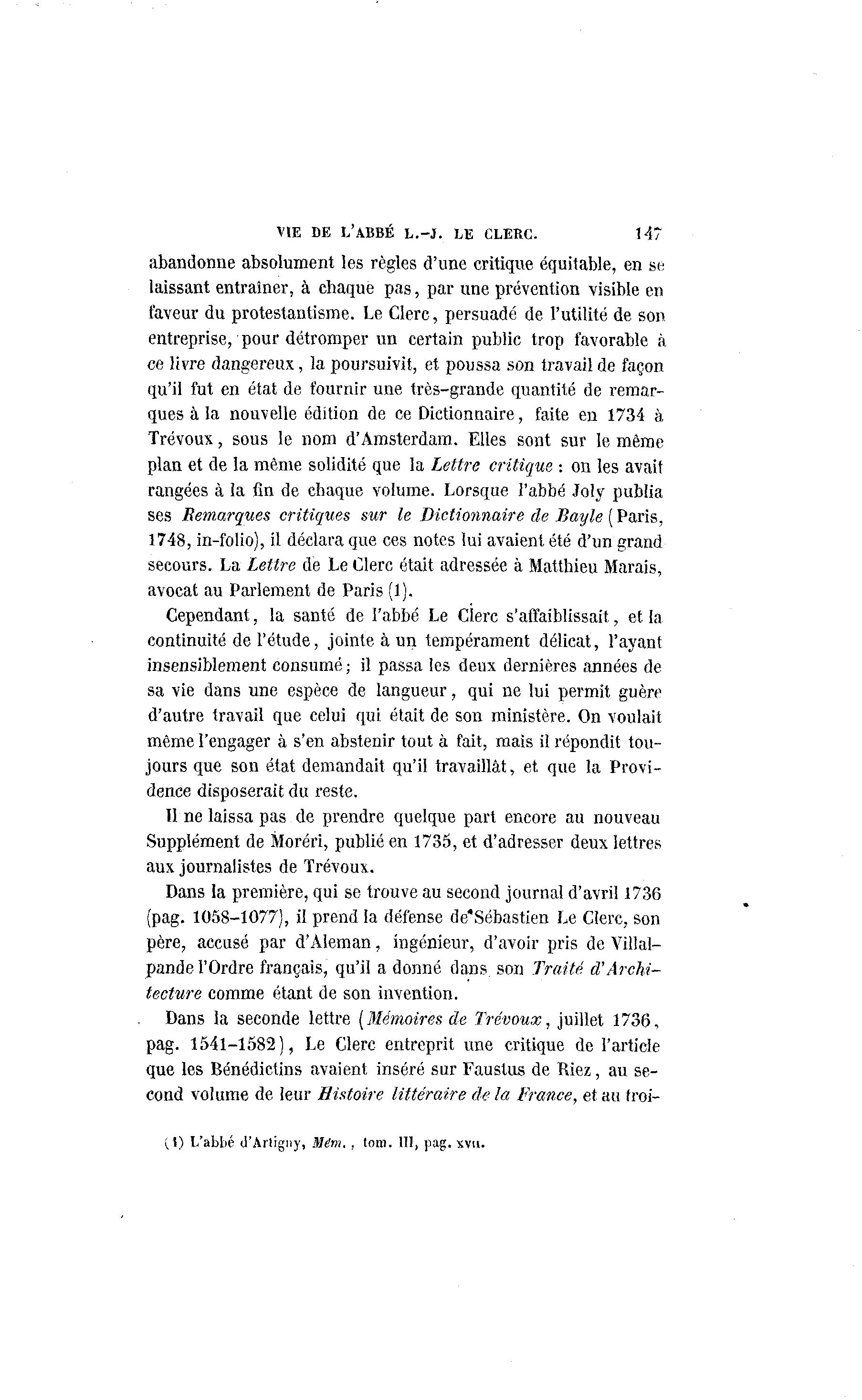 VIE DE L'ABBÉ L . - J . LE CLERC. 147 abandonne absolument les règles d'une critique équitable, en se laissant entraîner, à chaque pas, par une prévention visible en faveur du protestantisme. Le Clerc, persuadé de l'utilité de son entreprise, pour détromper un certain public trop favorable à ce livre dangereux, la poursuivit, et poussa son travail de façon qu'il fut en état de fournir une très-grande quantité de remar- ques à la nouvelle édition de ce Dictionnaire, faite en 1734 à Trévoux, sous le nom d'Amsterdam. Elles sont sur le même plan et de la même solidité que la Lettre critique -. on les avait rangées à la fin de chaque volume. Lorsque l'abbé Joîy publia ses Remarques critiques sur le Dictionnaire de Bayle (Paris, 1748, in-folio), il déclara que ces notes lui avaient été d'un grand secours. La Lettre de Le Clerc était adressée à Matthieu Marais, avocat au Parlement de Paris (1). Cependant, la santé de l'abbé Le Clerc s'affaiblissait, et la continuité de l'étude, jointe à un tempérament délicat, l'ayant insensiblement consumé; il passa les deux dernières années de sa vie dans une espèce de langueur, qui ne lui permit guère d'autre travail que celui qui était de son ministère. On voulait même l'engager à s'en abstenir tout à fait, mais il répondit tou- jours que son état demandait qu'il travaillât, et que la Provi- dence disposerait du reste. Il ne laissa pas de prendre quelque part encore au nouveau Supplément de Moréri, publié en 1735, et d'adresser deux lettres aux journalistes de Trévoux. Dans la première, qui se trouve au second journal d'avril 1736 (pag. 1058-1077), il prend la défense de'Sébastien Le Clerc, son père, accusé par d'Àleman, ingénieur, d'avoir pris de Villal- pande l'Ordre français, qu'il a donné dans son Traité d'Archi- tecture comme étant de son invention. Dans la seconde lettre [Mémoires de Trévoux, juillet 1736, pag. 1541-1582), Le Clerc entreprit une critique de l'article que les Bénédictins avaient inséré sur Fauslus de Riez, au se- cond volume de leur Histoire littéraire de la France, et au froi- (!) L'abbé d'Artigny, M