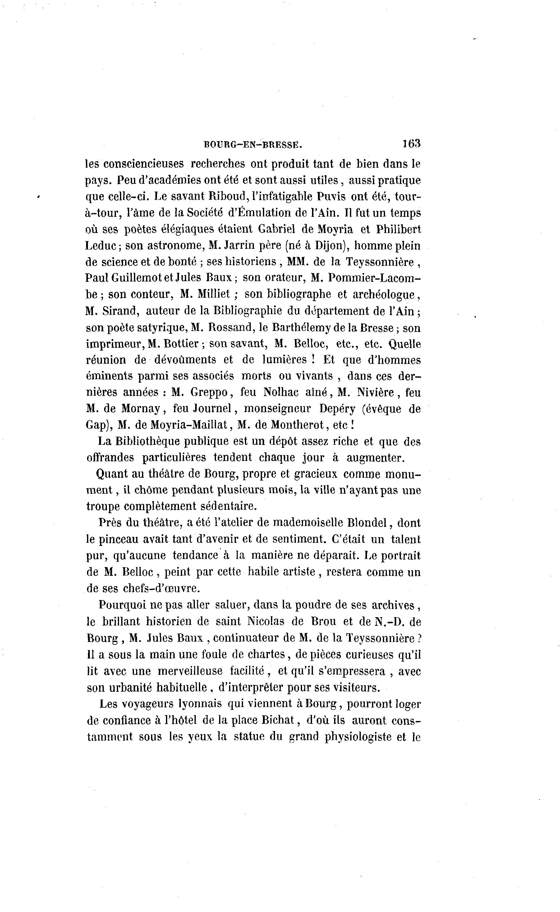 BOURG-EN-BRESSE. 163 les consciencieuses recherches ont produit tant de bien dans le pays. Peu d'académies ont été et sont aussi utiles, aussi pratique que celle-ci. Le savant Riboud, l'infatigable Puvis ont été, tour- à -tour, l'à me de la Société d'Émulation de l'Ain. Il fut un temps où ses poètes élégiaques étaient Gabriel de Moyria et Philibert Leduc ; son astronome, M. Jarrin père (né à Dijon), homme plein de science et de bonté ; ses historiens , MM. de la Teyssonnière , Paul Guillemot et Jules Baux; son orateur, M. Pommier-Lacom- be ; son conteur, M. Milliet ; son bibliographe et archéologue, M. Sirand, auteur de la Bibliographie du département de l'Ain ; son poète satyrique, M. Rossand, le Barthélémy de la Bresse ; son imprimeur, M. Bottier ; son savant, M. Belloc, etc., etc. Quelle réunion de dévoûments et de lumières ! Et que d'hommes éminents parmi ses associés morts ou vivants , dans ces der- nières années : M. Greppo, feu Nolhac aîné, M. Nivière, feu M. de Mornay, feu Journel, monseigneur Depéry (évêque de Gap), M. de Moyria-Maillat, M. de Montherot, etc ! La Bibliothèque publique est un dépôt assez riche et que des offrandes particulières tendent chaque jour à augmenter. Quant au théâtre de Bourg, propre et gracieux comme monu- ment , il chôme pendant plusieurs mots, la ville n'ayant pas une troupe complètement sédentaire. Près du théâtre, a été l'atelier de mademoiselle Blondel, dont le pinceau avait tant d'avenir et de sentiment. C'était un talent pur, qu'aucune tendance à la manière ne déparait. Le portrait de M. Belloc , peint par cette habile artiste , restera comme un de ses chefs-d'œuvre. Pourquoi ne pas aller saluer, dans la poudre de ses archives, le brillant historien de saint Nicolas de Brou et de N.-D. de Bourg, M. Jules Baux , continuateur de M. de la Teyssonnière ? 11 a sous la main une foule de chartes, de pièces curieuses qu'il lit avec une merveilleuse facilité, et qu'il s'empressera , avec son urbanité habituelle , d'interpréter pour ses visiteurs. Les voyageurs lyonnais qui viennent à Bourg, pourront loger de confiance à l'hôtel de la place Bichat, d'où ils auront cons- tamment sous les yeux la statue du grand physiologiste et le