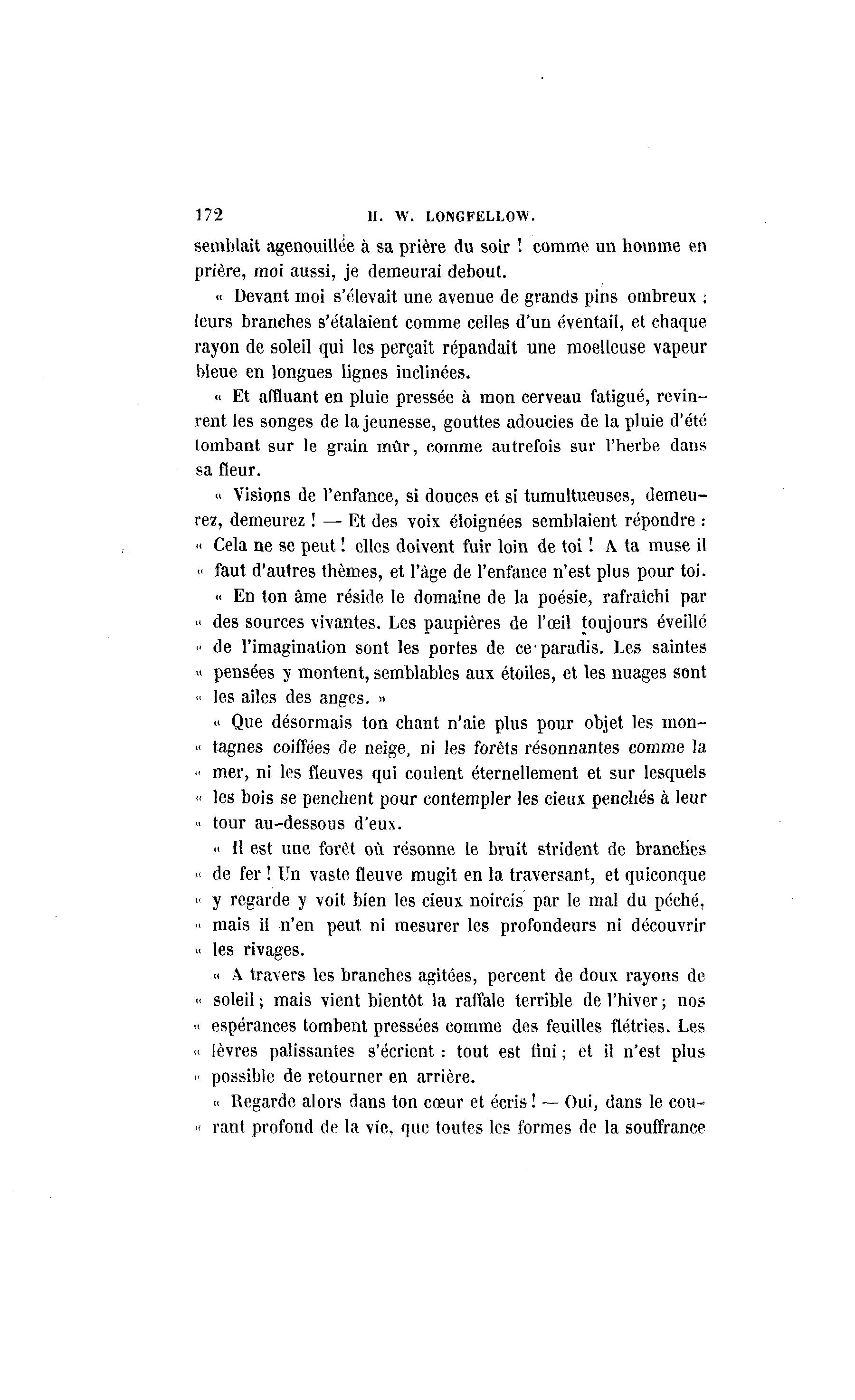 172 H. W. LONGFELLOW. semblait agenouillée à sa prière du soir ! comme un homme en prière, moi aussi, je demeurai debout. « Devant moi s'élevait une avenue de grands pins ombreux ; leurs branches s'étalaient comme celles d'un éventail, et chaque rayon de soleil qui les perçait répandait une moelleuse vapeur bleue en longues lignes inclinées. « Et affluant en pluie pressée à mon cerveau fatigué, revin- rent les songes de la jeunesse, gouttes adoucies de la pluie d'été tombant sur le grain mûr, comme autrefois sur l'herbe dans sa fleur. « Visions de l'enfance, si douces et si tumultueuses, demeu- rez, demeurez ! — Et des voix éloignées semblaient répondre : « Cela ne se peut ! elles doivent fuir loin de toi ! A ta muse il « faut d'autres thèmes, et l'âge de l'enfance n'est plus pour toi. « En ton âme réside le domaine de la poésie, rafraîchi par « des sources vivantes. Les paupières de l'œil toujours éveillé " de l'imagination sont les portes de ce'paradis. Les saintes « pensées y montent, semblables aux étoiles, et les nuages sont « les ailes des anges. » « Que désormais ton chant n'aie plus pour objet les mon- « tagnes coiffées de neige, ni les forêts résonnantes comme la « mer, ni les fleuves qui coulent éternellement et sur lesquels « les bois se penchent pour contempler les cieux penchés à leur « tour au-dessous d'eux. « Il est une forêt où résonne le bruit strident de branches • de fer ! Un vaste fleuve mugit en la traversant, et quiconque > " y regarde y voit bien les cieux noircis par le mal du péché, « mais il n'en peut ni mesurer les profondeurs ni découvrir « les rivages. « A travers les branches agitées, percent de doux rayons de « soleil ; mais vient bientôt la raffale terrible de l'hiver ; nos « espérances tombent pressées comme des feuilles flétries. Les « lèvres palissantes s'écrient : tout est fini ; et il n'est plus « possible de retourner en arrière. « Regarde alors dans ton cœur et écris ! — Oui, dans le cou- « rant profond de la vie, que toutes les formes de la souffrance