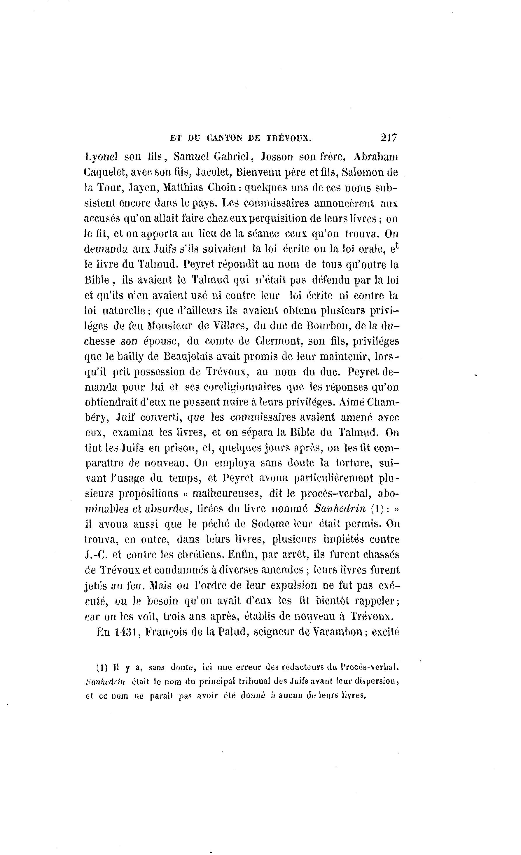 ET DU CANTON DE TRÉVOUX. 217 Lyonel sozi fils, Samuel Gabriel, Josson son frère, Abraham Caquelet, avec son fils, Jacolet, Bienvenu père et fils, Salomon de la Tour, Jayen, Matthias Choin-. quelques uns de ces noms sub- sistent encore dans le pays. Les commissaires annoncèrent aux accusés qu'on allait faire chez eux perquisition de leurs livres ; on le fit, et on apporta au lieu de la séance ceux qu'on trouva. On demanda aux Juifs s'ils suivaient la loi écrite ou la loi orale, e1, le livre du Talmud. Peyret répondit au nom de tous qu'outre la Bible , ils avaient le Talmud qui n'était pas défendu par la loi et qu'ils n'en avaient usé ni contre leur loi écrite ni contre la loi naturelle ; que d'ailleurs ils avaient obtenu plusieurs privi- lèges de feu Monsieur de Vilîars, du duc de Bourbon, de la du- chesse son épouse, du comte de Glermont, son fils, privilèges que le bailly de Beaujolais avait promis de leur maintenir, lors- qu'il prit possession de Trévoux, au nom du duc. Peyret de- manda pour lui et ses coreligionnaires que les réponses qu'on obtiendrait d'eux ne pussent nuire à leurs privilèges. Aimé Cham- béry, Juif converti, que les commissaires avaient amené avec eux, examina les livres, et on sépara la Bible du Talmud. On tint les Juifs en prison, et, quelques jours après, on les lit com- paraître de nouveau. On employa sans doute la torture, sui- vant l'usage du temps, et Peyret avoua particulièrement plu- sieurs propositions « malheureuses, dit le procès-verbal, abo- minables et absurdes, tirées du livre nommé Sanhédrin (1) : » il avoua aussi que le péché de Sodome leur était permis. On trouva, en outre, dans leurs livres, plusieurs impiétés contre J.-C. et contre les chrétiens. Enfin, par arrêt, ils furent chassés de Trévoux et condamnés à diverses amendes ; leurs livres furent jetés au feu. Mais ou l'ordre de leur expulsion ne fut pas exé- cuté, ou le besoin qu'on avait d'eux les fit bientôt rappeler; car on les voit, trois ans après, établis de nouveau à Trévoux. En 1431, François de la Palud, seigneur de Varambon-, excité (1) Il y a, sans doute, ici une erreur des rédacteurs du Procès-verbal. Sanhédrin était le nom du principal tribunal des Juifs avant leur dispersion, et ce nom ne parait pas avoir été donné à aucun de leurs livres.