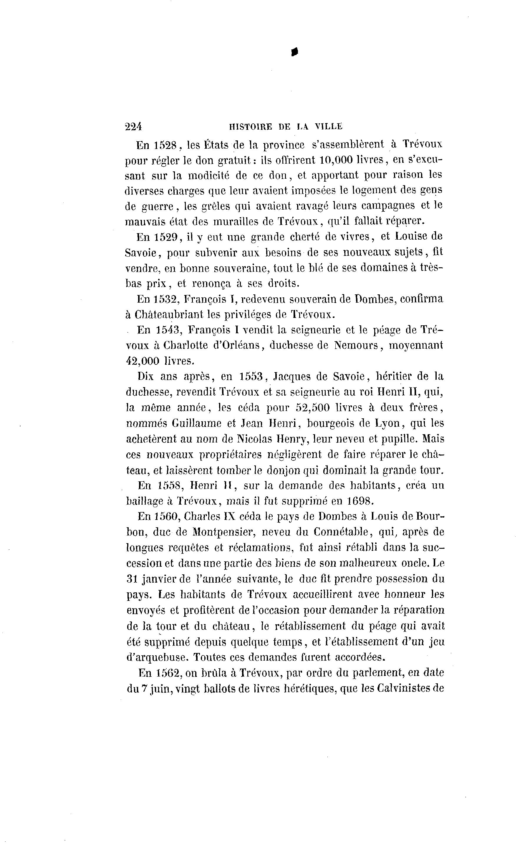 # 224 HISTOIRE DE LA VILLE En 1528, les États de la province s'assemblèrent à Trévoux pour régler le don gratuit: ils offrirent 10,000 livres, en s'excu- sant sur la modicité de ce don, et apportant pour raison les diverses cbarges que leur avaient imposées le logement des gens de guerre, les grêles qui avaient ravagé leurs campagnes et le mauvais état des murailles de Trévoux, qu'il fallait réparer. En 1529, il y eut une grande cherté de vivres, et Louise de Savoie, pour subvenir aux besoins de ses nouveaux sujets, fit vendre, en bonne souveraine, tout le blé de ses domaines à très- bas prix, et renonça à ses droits. En 1532, François ï, redevenu souverain de Dombes, confirma à Châteaubriant les privilèges de Trévoux. . En 1543, François I vendit la seigneurie et le péage de Tré- voux à Charlotte d'Orléans, duchesse de Nemours, moyennant 42,000 livres. Dix ans après, en 1553, Jacques de Savoie, héritier de la duchesse, revendit Trévoux et sa seigneurie au roi Henri II, qui, la même année, les céda pour 52,500 livres à deux frères, nommés Guillaume et Jean Henri, bourgeois de Lyon, qui les achetèrent au nom de Nicolas Henry, leur neveu et pupille. Mais ces nouveaux propriétaires négligèrent de faire réparer le châ- teau, et laissèrent tomber le donjon qui dominait la grande tour. En 1558, Henri 11, sur la demande des habitants, créa un baillage à Trévoux, mais il fut supprimé en 1698. En 1560, Charles IX céda le pays de Dombes à Louis de Bour- bon, duc de Montpensier, neveu du Connétable, qui, après de longues requêtes et réclamations, fut ainsi rétabli dans la suc- cession et dans une partie des biens de son malheureux oncle. Le 31 janvier de l'année suivante, le duc fit prendre possession du pays. Les habitants de Trévoux accueillirent avec honneur les envoyés et profitèrent de l'occasion pour demander la réparation de la tour et du château, le rétablissement du péage qui avait été supprimé depuis quelque temps, et l'établissement d'un jeu d'arquebuse. Toutes ces demandes furent accordées. En 1562, on brûla à Trévoux, par ordre du parlement, en date du 7 juin, vingt ballots de livres hérétiques, que les Calvinistes de