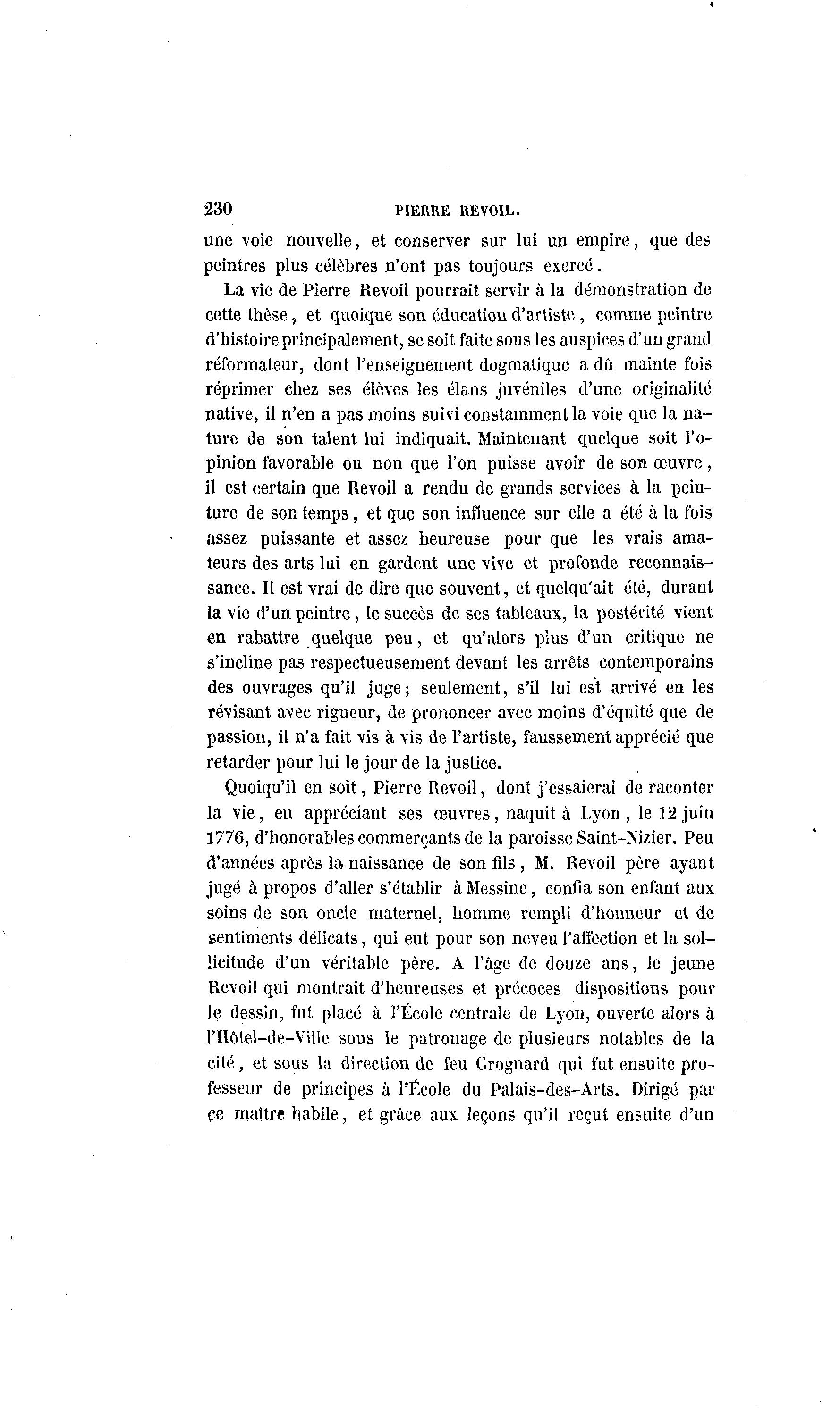 230 PIERRE REVOIL. une voie nouvelle, et conserver sur lui un empire, que des peintres plus célèbres n'ont pas toujours exercé. La vie de Pierre Revoil pourrait servir à la démonstration de cette thèse, et quoique son éducation d'artiste, comme peintre d'histoire principalement, se soit faite sous les auspices d'un grand réformateur, dont l'enseignement dogmatique a dû mainte fois réprimer chez ses élèves les élans juvéniles d'une originalité native, il n'en a pas moins suivi constamment la voie que la na- ture de son talent lui indiquait. Maintenant quelque soit l'o- pinion favorable ou non que l'on puisse avoir de son œuvre, il est certain que Revoil a rendu de grands services à la pein- ture de son temps , et que son influence sur elle a été à la fois assez puissante et assez heureuse pour que les vrais ama- teurs des arts lui en gardent une vive et profonde reconnais- sance. Il est vrai de dire que souvent, et quelqu'ait été, durant la vie d'un peintre, le succès de ses tableaux, la postérité vient en rabattre quelque peu, et qu'alors plus d'un critique ne s'incline pas respectueusement devant les arrêts contemporains des ouvrages qu'il juge; seulement, s'il lui est arrivé en les révisant avec rigueur, de prononcer avec moins d'équité que de passion, il n'a fait vis à vis de l'artiste, faussement apprécié que retarder pour lui le jour de la justice. Quoiqu'il en soit, Pierre Revoil, dont j'essaierai de raconter la vie, en appréciant ses œuvres, naquit à Lyon, le 12 juin 1776, d'honorables commerçants de la paroisse Saint-Nizier. Peu d'années après la naissance de son fils , M. Revoil père ayant jugé à propos d'aller s'établir à Messine, confia son enfant aux soins de son oncle maternel, homme rempli d'honneur et de sentiments délicats, qui eut pour son neveu l'affection et la sol- licitude d'un véritable père. A l'âge de douze ans, le jeune Revoil qui montrait d'heureuses et précoces dispositions poul- ie dessin, fut placé à l'École centrale de Lyon, ouverte alors à l'Hôtel-de-Ville sous le patronage de plusieurs notables de la cité, et sous la direction de feu Grognard qui fut ensuite pro- fesseur de principes à l'École du Palais-des-Arts. Dirigé par ce maître habile, et grâce aux leçons qu'il reçut ensuite d'un