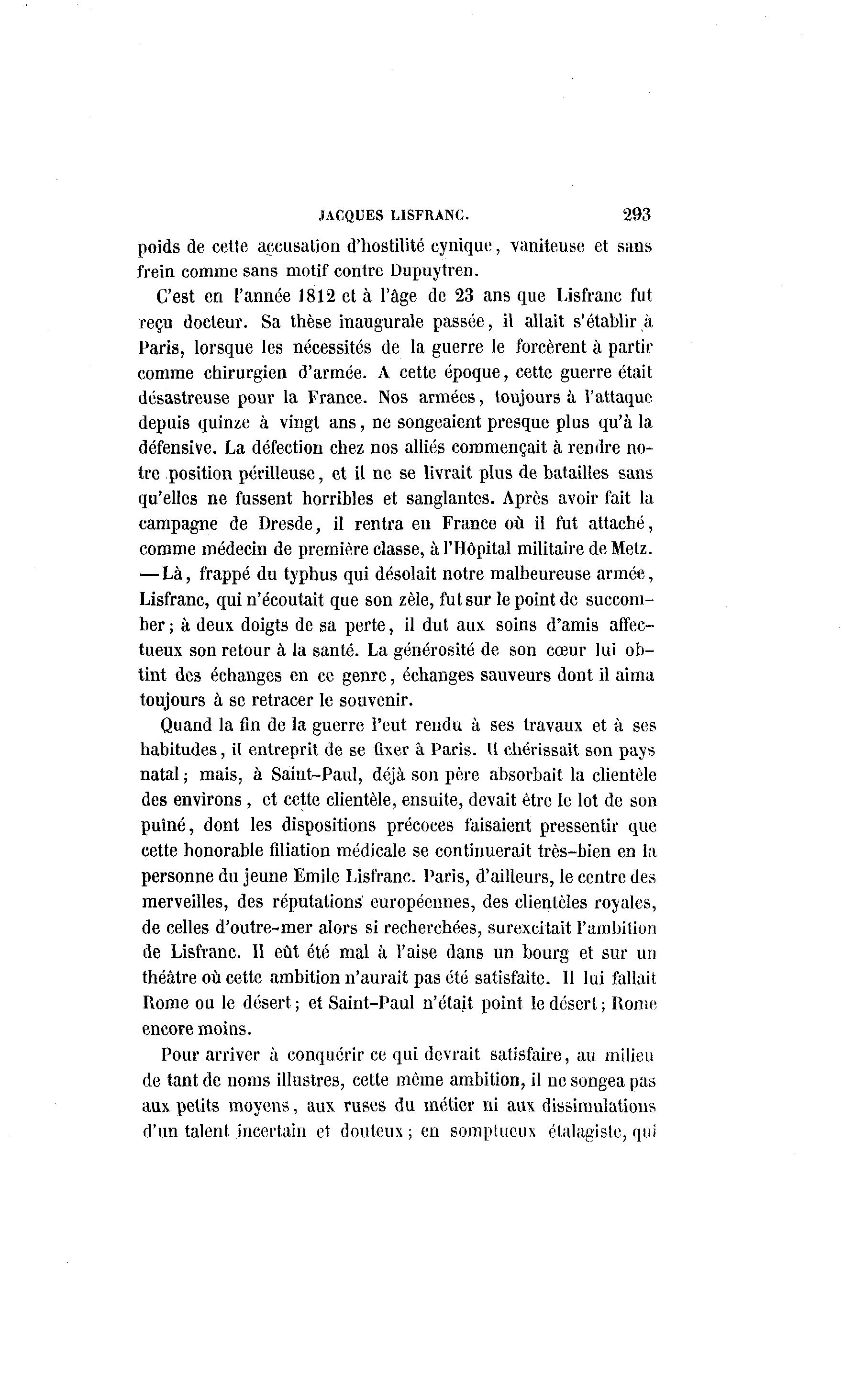 JACQUES L1SFRANC. 293 poids de cette accusation d'hostilité cynique, vaniteuse et sans frein comme sans motif contre Dupuytren. C'est en l'année 1812 et à l'âge de 23 ans que Lisfranc fut reçu docteur. Sa thèse inaugurale passée, il allait s'établira Paris, lorsque les nécessités de la guerre le forcèrent à partir comme chirurgien d'armée. A cette époque, cette guerre était désastreuse pour la France. Nos armées, toujours à l'attaque depuis quinze à vingt ans, ne songeaient presque plus qu'à la défensive. La défection chez nos alliés commençait à rendre no- tre position périlleuse, et il ne se livrait plus de batailles sans qu'elles ne fussent horribles et sanglantes. Après avoir fait la campagne de Dresde, il rentra eu France où il fut attaché, comme médecin de première classe, à l'Hôpital militaire de Metz. — Là , frappé du typhus qui désolait notre malheureuse armée, Lisfranc, qui n'écoutait que son zèle, fut sur le point de succom- ber ; à deux doigts de sa perte, il dut aux soins d'amis affec- tueux son retour à la santé. La générosité de son cœur lui ob- tint des échanges en ce genre, échanges sauveurs dont il aima toujours à se retracer le souvenir. Quand la fin de la guerre l'eut rendu à ses travaux et à ses habitudes, il entreprit de se tixer à Paris. Il chérissait son pays natal ; mais, à Saint-Paul, déjà son père absorbait la clientèle des environs, et cette clientèle, ensuite, devait être le lot de son puîné, dont les dispositions précoces faisaient pressentir que cette honorable filiation médicale se continuerait très-bien en la personne du jeune Emile Lisfranc. Paris, d'ailleurs, le centre des merveilles, des réputations européennes, des clientèles royales, de celles d'outre-mer alors si recherchées, surexcitait l'ambition de Lisfranc. 11 eût été mal à l'aise dans un bourg et sur un théâtre où cette ambition n'aurait pas été satisfaite. 11 lui fallait Rome ou le désert ; et Saint-Paul n'était point le désert ; Rome encore moins. Pour arriver à conquérir ce qui devrait satisfaire, au milieu de tant de noms illustres, cette même ambition, il ne songea pas aux petits moyens, aux ruses du métier ni aux dissimulations d'un talent incertain et douteux ; en somptueux étalagiste, qui