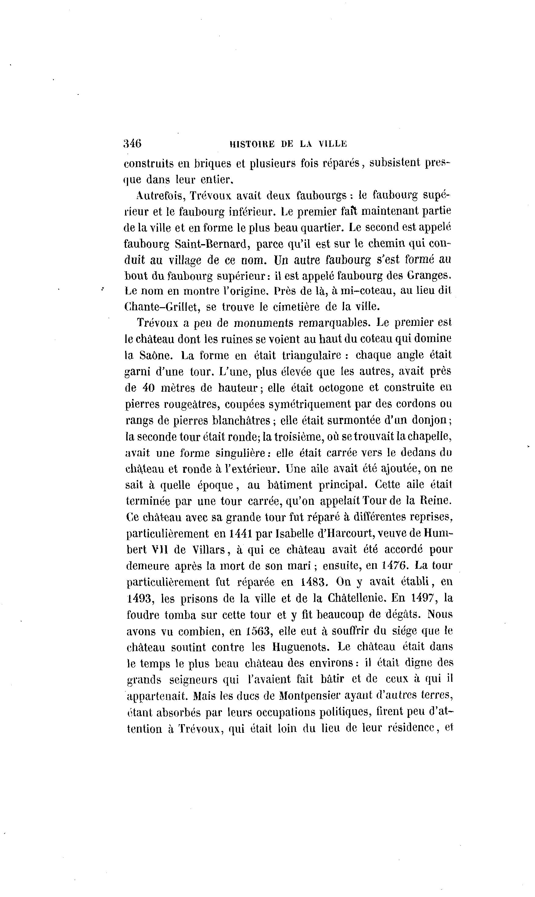 346 HISTOIRE DE LA VILLE construits en briques et plusieurs fois réparés, subsistent pres- que dans leur entier. Autrefois, Trévoux avait deux faubourgs -. le faubourg supé- rieur et le faubourg inférieur. Le premier faft maintenant partie de la ville et en forme le plus beau quartier. Le second est appelé, faubourg Saint-Bernard, parce qu'il est sur le chemin qui con- duit au village de ce nom. Un autre faubourg s'est formé au bout du faubourg supérieur: il est appelé faubourg des Granges. Le nom en montre l'origine. Près de là , à mi-coteau, au lieu dit Chante-Grillet, se trouve le cimetière de la ville. Trévoux a peu de monuments remarquables. Le premier est le château dont les ruines se voient au haut du coteau qui domine la Saône. La forme en était triangulaire : chaque angle était garni d'une tour. L'une, plus élevée que les autres, avait près de 40 mètres de hauteur; elle était octogone et construite en pierres rougeà tres, coupées symétriquement par des cordons ou rangs de pierres blanchâtres ; elle était surmontée d'un donjon; la seconde tour était ronde; la troisième, où se trouvait la chapelle, avait une forme singulière.- elle était carrée vers le dedans du château et ronde à l'extérieur. Une aile avait été ajoutée, on ne sait à quelle époque, au bâtiment principal. Cette aile était terminée par une tour carrée, qu'on appelait Tour de la Reine. Ce château avec sa grande tour fut réparé à différentes reprises, particulièrement en 1441 par Isabelle d'Harcourt, veuve de Hum- bert VII de Villars, à qui ce château avait été accordé pour demeure après la mort de son mari ; ensuite, en 1476. La tour particulièrement fut réparée en 1483. On y avait établi, en 1493, les prisons de la ville et de la Châtellenie. En 1497, la foudre tomba sur cette tour et y fit beaucoup de dégâts. Nous avons vu combien, en 1563, elle eut à souffrir du siège que le château soutint contre les Huguenots. Le château était dans le temps le plus beau château des environs : il était digne des grands seigneurs qui l'avaient fait bâtir et de ceux à qui il appartenait. Mais les ducs de Montpensier ayant d'autres terres, étant absorbés par leurs occupations politiques, firent peu d'at- tention à Trévoux, qui était loin du lieu de leur résidence, et