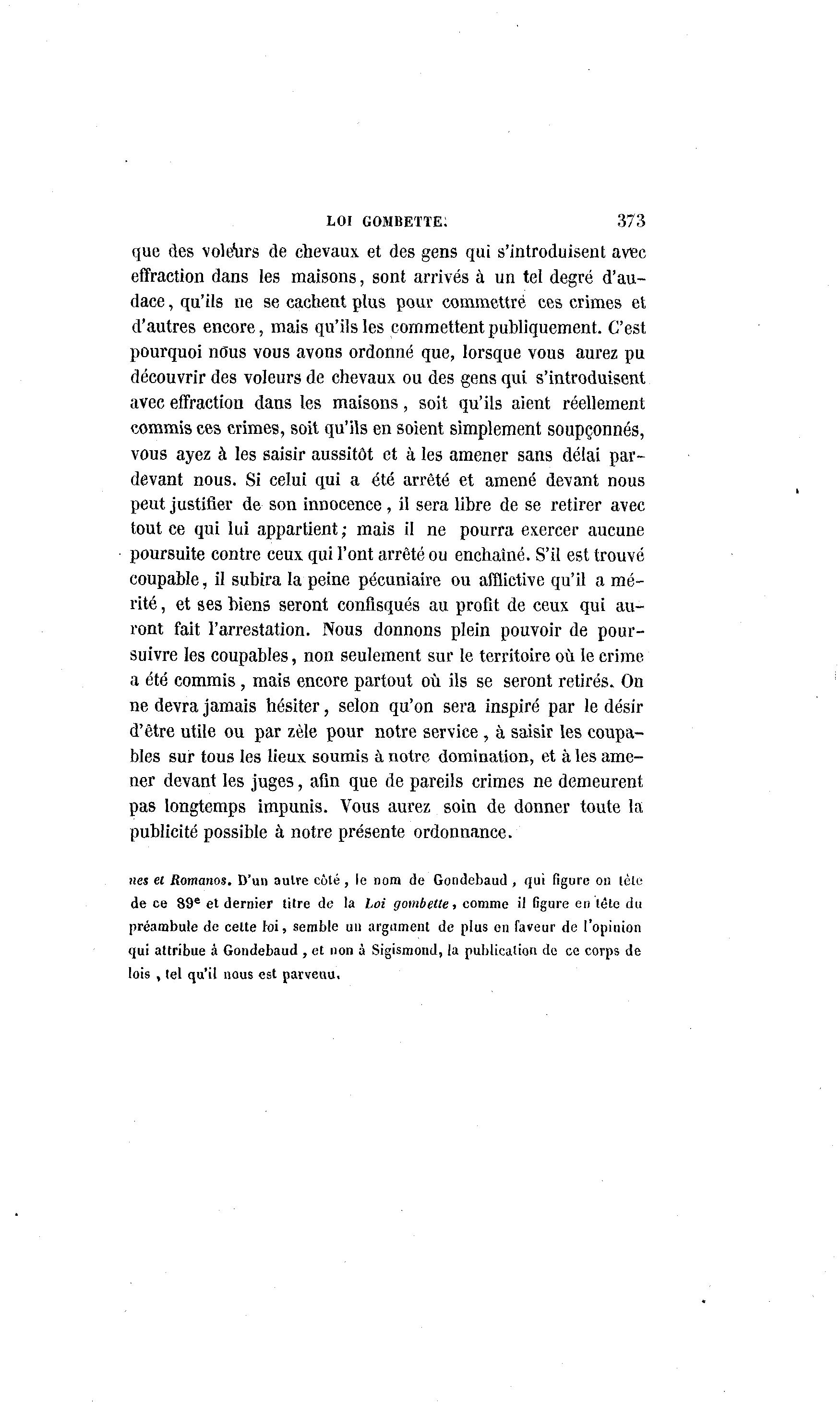 LOI GOMBETÃE: 373 que des voletos de chevaux et des gens qui s'introduisent avec effraction dans les maisons, sont arrivés à un tel degré d'au- dace , qu'ils ne se cachent plus pour commettre ces crimes et d'autres encore, mais qu'ils les commettent publiquement. C'est pourquoi nOus vous avons ordonné que, lorsque vous aurez pu découvrir des voleurs de chevaux ou des gens qui s'introduisent avec effraction dans les maisons, soit qu'ils aient réellement commis ces crimes, soit qu'ils en soient simplement soupçonnés, vous ayez à les saisir aussitôt et à les amener sans délai par- devant nous. Si celui qui a été arrêté et amené devant nous peut justifier de son innocence, il sera libre de se retirer avec tout ce qui lui appartient; mais il ne pourra exercer aucune poursuite contre ceux qui l'ont arrêté ou enchaîné. S'il est trouvé coupable, il subira la peine pécuniaire ou afflictive qu'il a mé- rité , et ses biens seront confisqués au profit de ceux qui au- ront fait l'arrestation. Nous donnons plein pouvoir de pour- suivre les coupables, non seulement sur le territoire où le crime a été commis, mais encore partout où ils se seront retirés. On ne devra jamais hésiter, selon qu'on sera inspiré par le désir d'être utile ou par zèle pour notre service , à saisir les coupa- bles sur tous les lieux soumis à notre domination, et à les ame- ner devant les juges, afin que de pareils crimes ne demeurent pas longtemps impunis. Vous aurez soin de donner toute la publicité possible à notre présente ordonnance. nés et Romanos. D'un autre côté, le nom de Gondebaud , qui figure ou lèle de ce 89 e et dernier titre de la loi gombetïe, comme il figure en tête du préambule de celte loi, semble un argument de plus en faveur de l'opinion qui attribue à Gondebaud , et non à Sigismond, la publication de ce corps de lois , tel qu'il nous est parveuu.