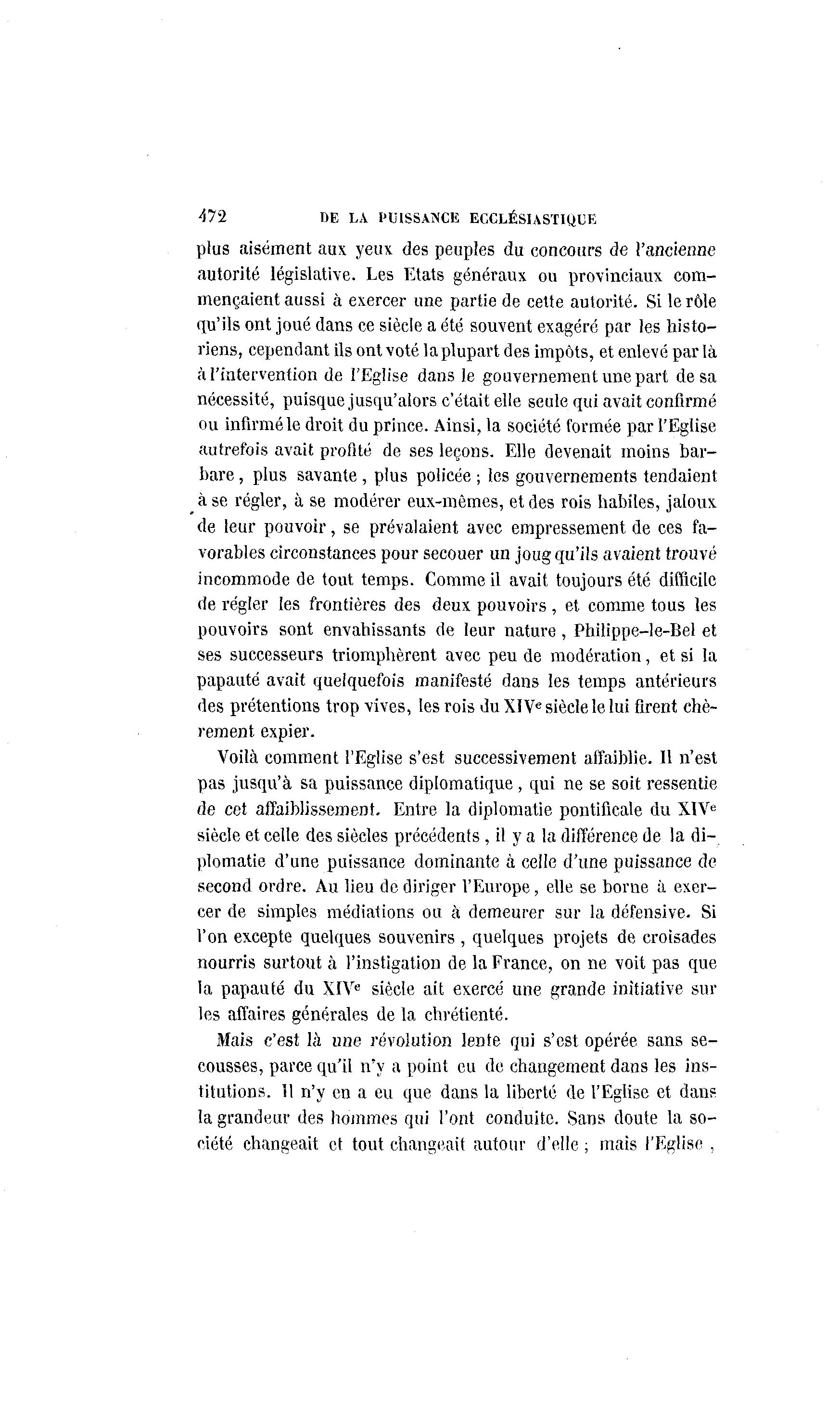 472 DE LA PUISSANCE ECCLÉSIASTIQUE plus aisément aux yeux des peuples du concours de l'ancienne autorité législative. Les Etats généraux ou provinciaux com- mençaient aussi à exercer une partie de cette autorité. Si le rôle qu'ils ont joué dans ce siècle a été souvent exagéré par les histo- riens, cependant ils ont voté la plupart des impôts, et enlevé par là à l'intervention de l'Eglise dans le gouvernement une part de sa nécessité, puisque jusqu'alors c'était elle seule qui avait confirmé ou infirmé le droit du prince. Ainsi, la société formée par l'Eglise autrefois avait profité de ses leçons. Elle devenait moins bar- bare , plus savante , plus policée ; les gouvernements tendaient à se régler, à se modérer eux-mêmes, et des rois habiles, jaloux de leur pouvoir, se prévalaient avec empressement de ces fa- vorables circonstances pour secouer un joug qu'ils avaient trouvé incommode de tout temps. Comme il avait toujours été difficile de régler les frontières des deux pouvoirs , et comme tous les pouvoirs sont envahissants de leur nature, Philippe-le-Bel et ses successeurs triomphèrent avec peu de modération, et si la papauté avait quelquefois manifesté dans les temps antérieurs des prétentions trop -vives, les rois du XIVe siècle le lui firent chè- rement expier. Voilà comment l'Eglise s'est successivement affaiblie. Il n'est pas jusqu'à sa puissance diplomatique, qui ne se soit ressentie de cet affaiblissement. Entre la diplomatie pontificale du XIVe siècle et celle des siècles précédents , il y a la différence de la di- plomatie d'une puissance dominante à celle d'une puissance de second ordre. Au lieu de diriger l'Europe, elle se borne à exer- cer de simples médiations ou à demeurer sur la défensive. Si l'on excepte quelques souvenirs , quelques projets de croisades nourris surtout à l'instigation de la France, on ne voit pas que la papauté du XIVe siècle ait exercé une grande initiative sur les affaires générales de la chrétienté. Mais c'est là une révolution lente qui s'est opérée sans se- cousses, parce qu'il n'y a point eu do changement dans les ins- titutions. Il n'y en a eu que dans la liberté de l'Eglise et dans la grandeur des hommes qui l'ont conduite. Sans doute la so- ciété changeait et tout changeait autour d'elle ; mais l'Eglise ,